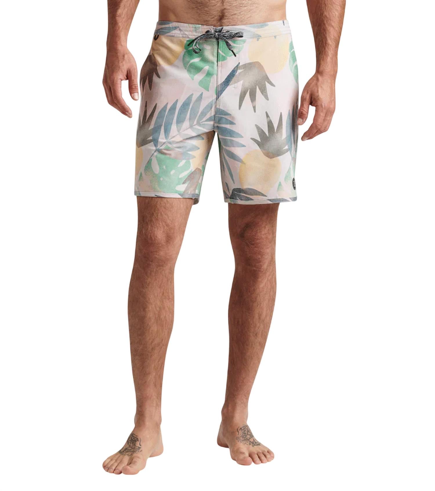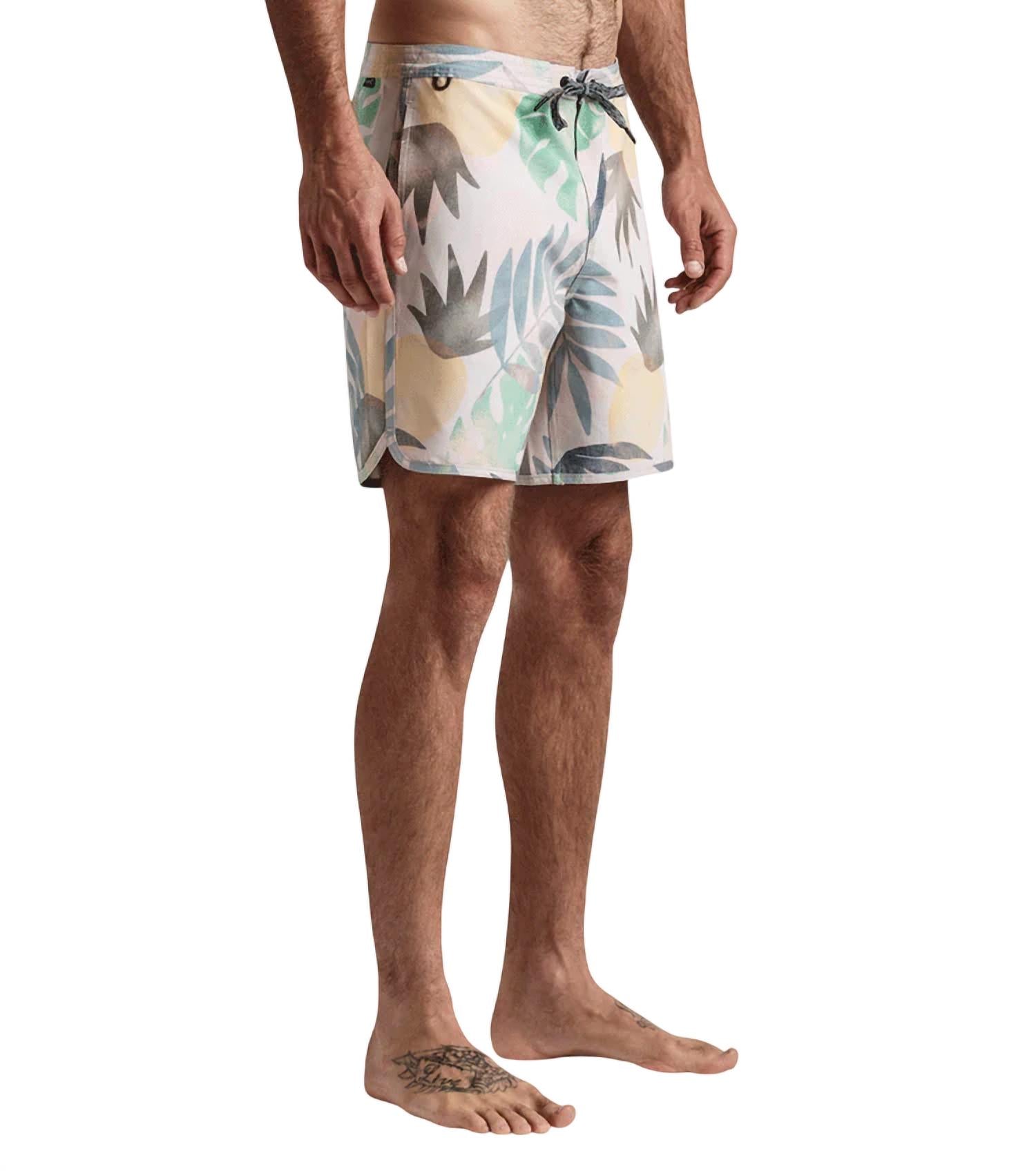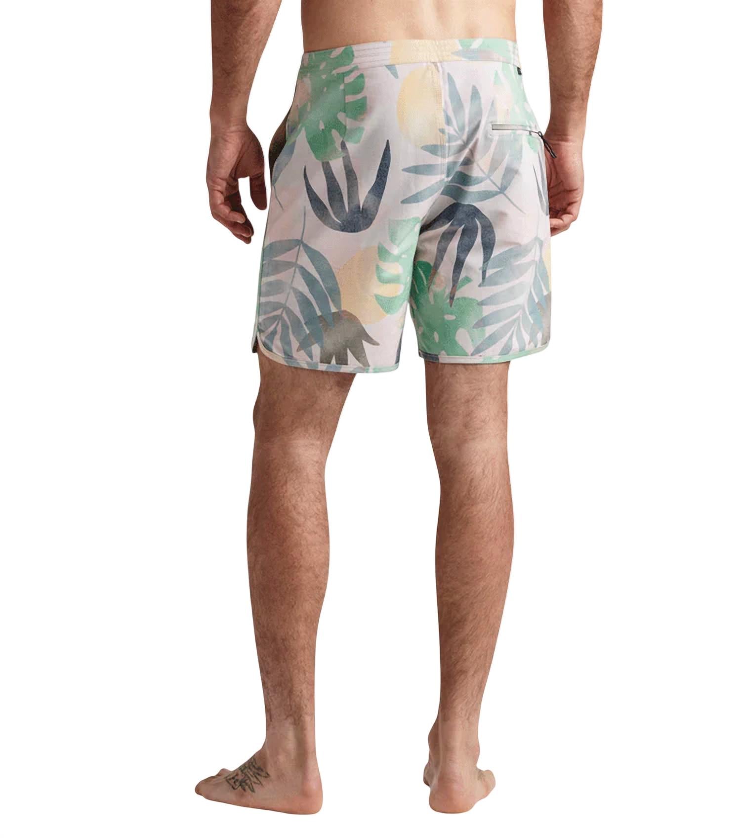 These boardshorts feature two side-seam hand pockets and one back patch Velcro flap pocket. They are designed with a drawstring waist. The dimensions for size 32 are a 17" outseam and a 7" inseam. Made from a blend of 48% recycled polyester, 36% polyester, 9% hemp, and 7% elastane.