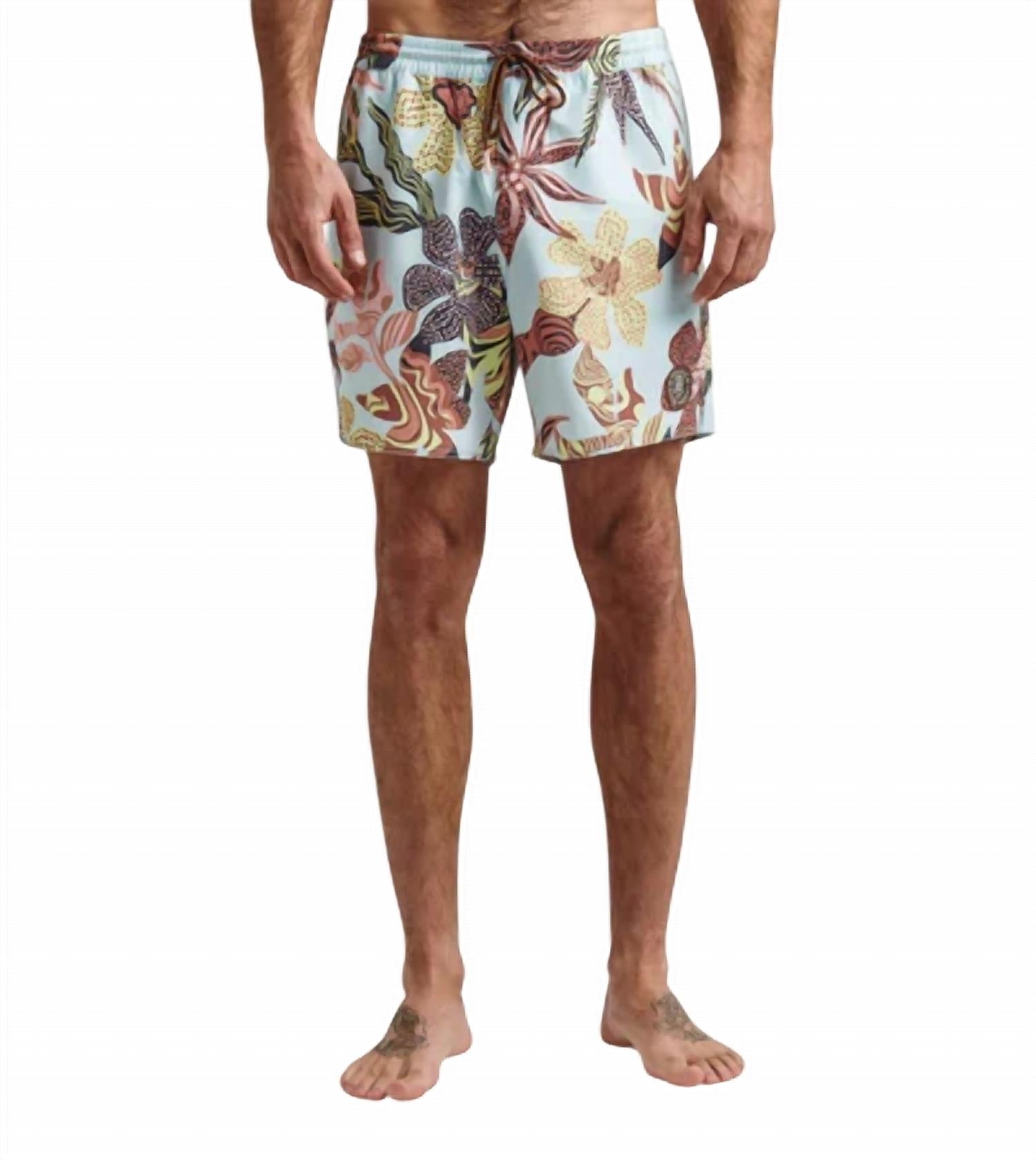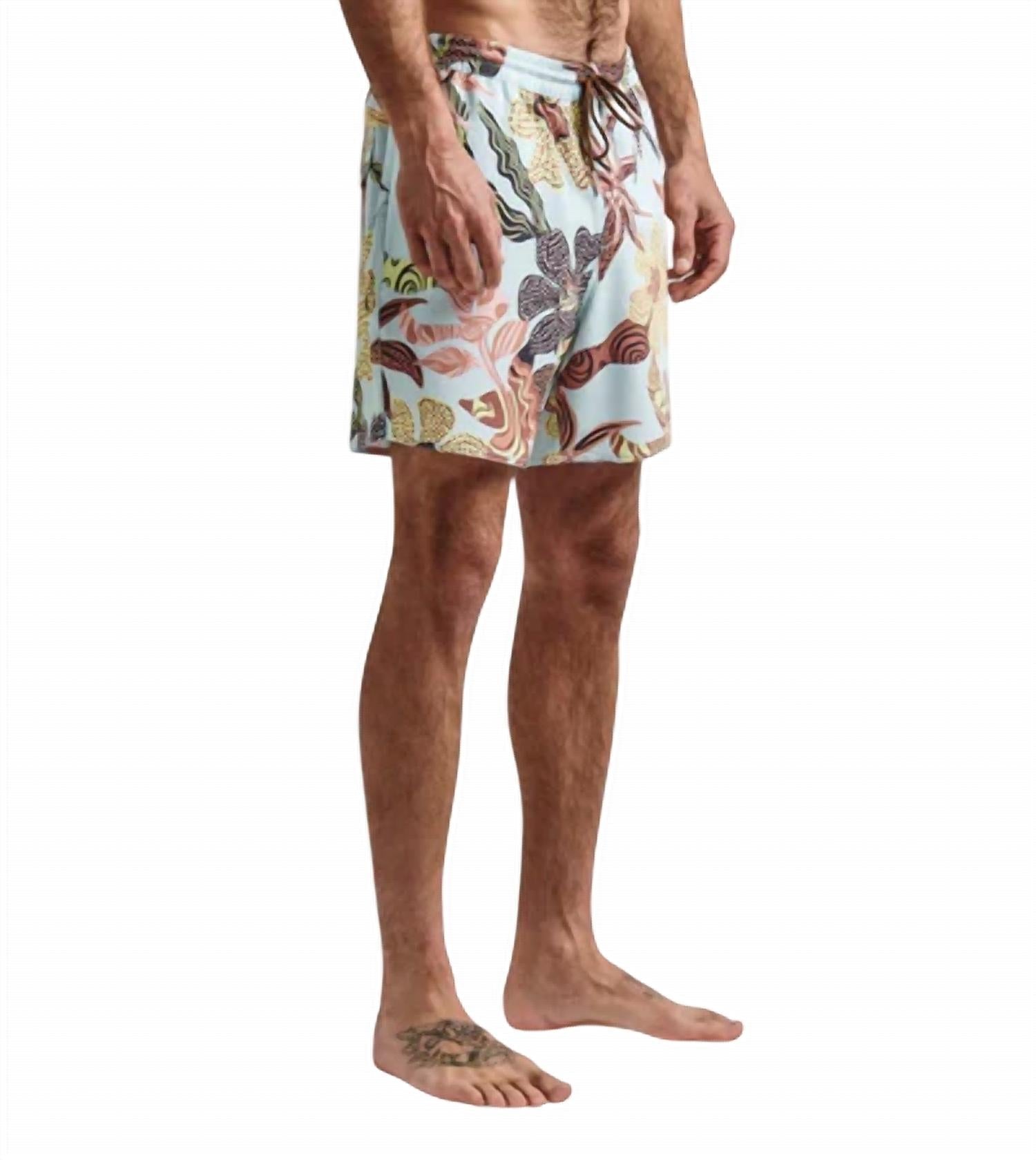 These boardshorts feature multiple pockets for storage and an elastic waist with a drawstring for a customizable fit. Dimensions (M size): 16" outseam, 6" inseam. Made from a blend of 48% recycled polyester, 36% polyester, 9% hemp, and 7% elastane for durability and stretch.