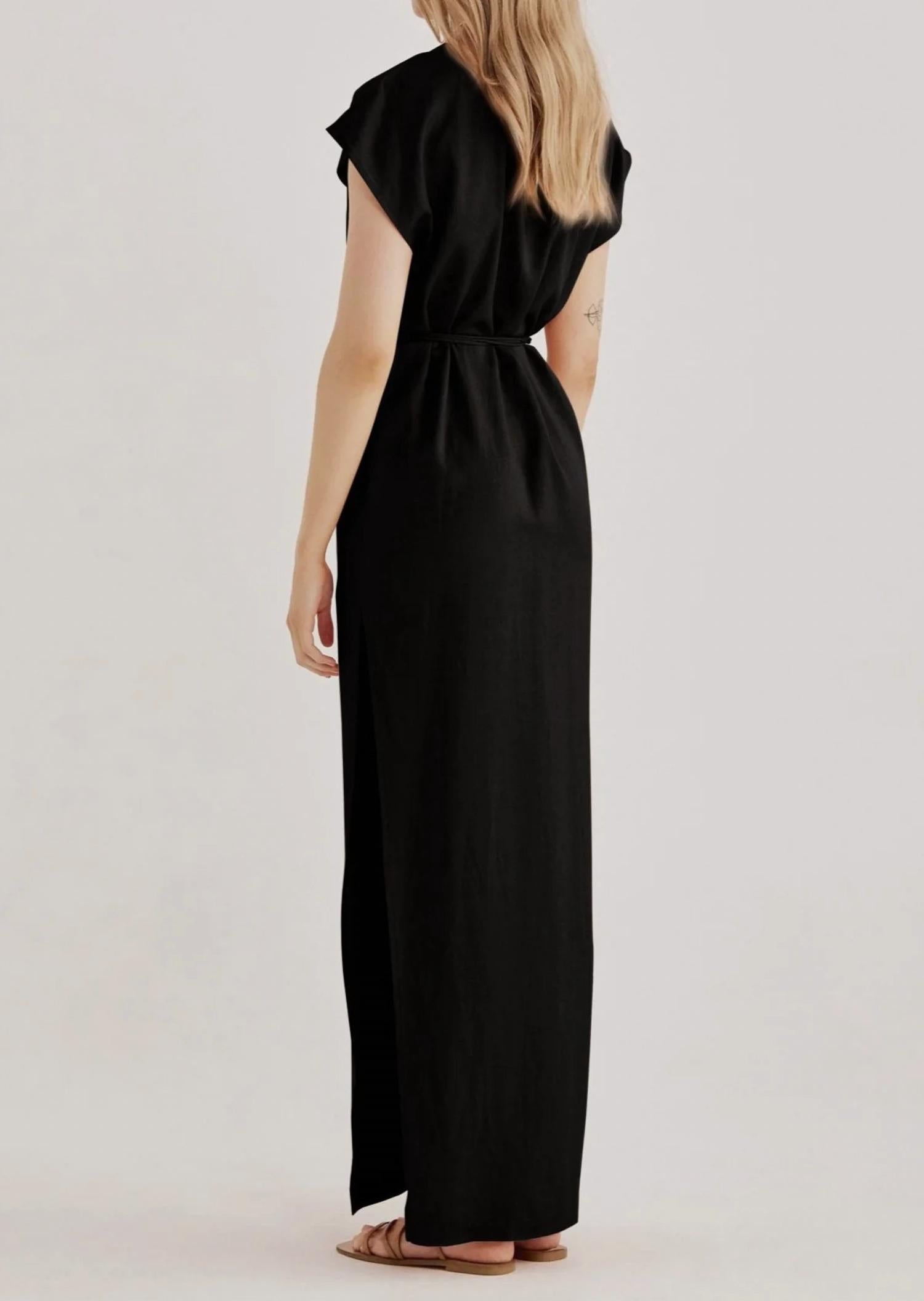 Style this maxi with your favorite statement necklace and sandals for the perfect look. Experience the effortless elegance of the Roam Kaftan Dress by RUMER, a perfect addition to your summer wardrobe. Featuring cap sleeves and a flattering deep V-neckline, this longline maxi dress offers an oversized fit, complemented by side splits and a fine rouleau tie at the waist. Designed for evening events, it's made for a relaxed yet stylish appearance in solid black. Care for your dress by hand washing cold and laying flat to dry.