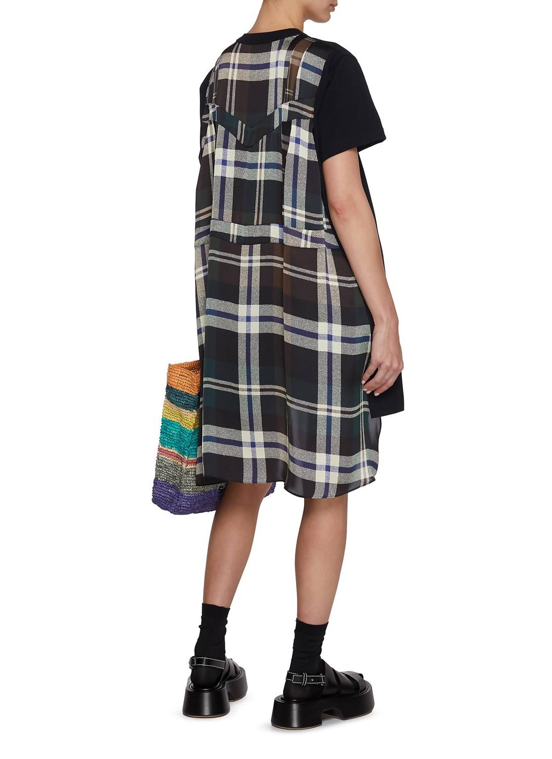 Introducing the Plaid Print Cotton Jersey Dress by sacai, an effortlessly chic choice for your wardrobe. This mini dress features short sleeves and a crew neckline for a classic silhouette, enhanced by a unique plaid print back and a hi-lo hem. The dress is crafted from 100% cotton with attached parts made from polyester, and comes with a slip constructed from 100% cupro. Designed in a convenient slip-on style, it's perfect for a minimalist spring look. Care is easy with hand wash and laying flat to dry.
