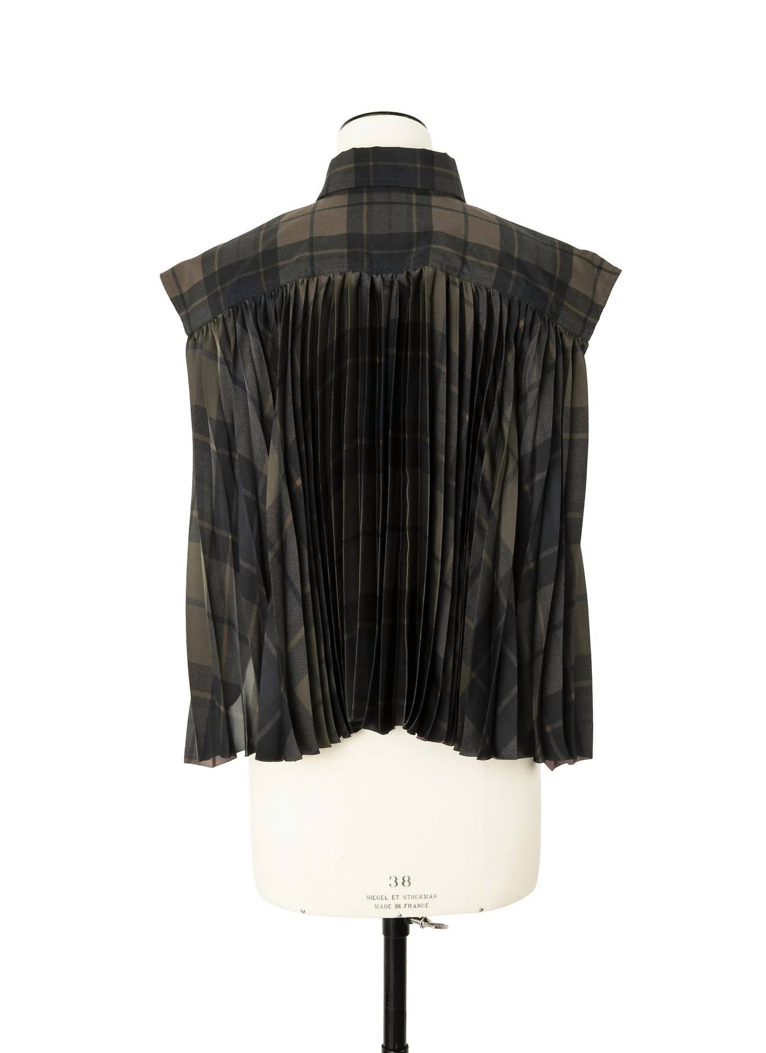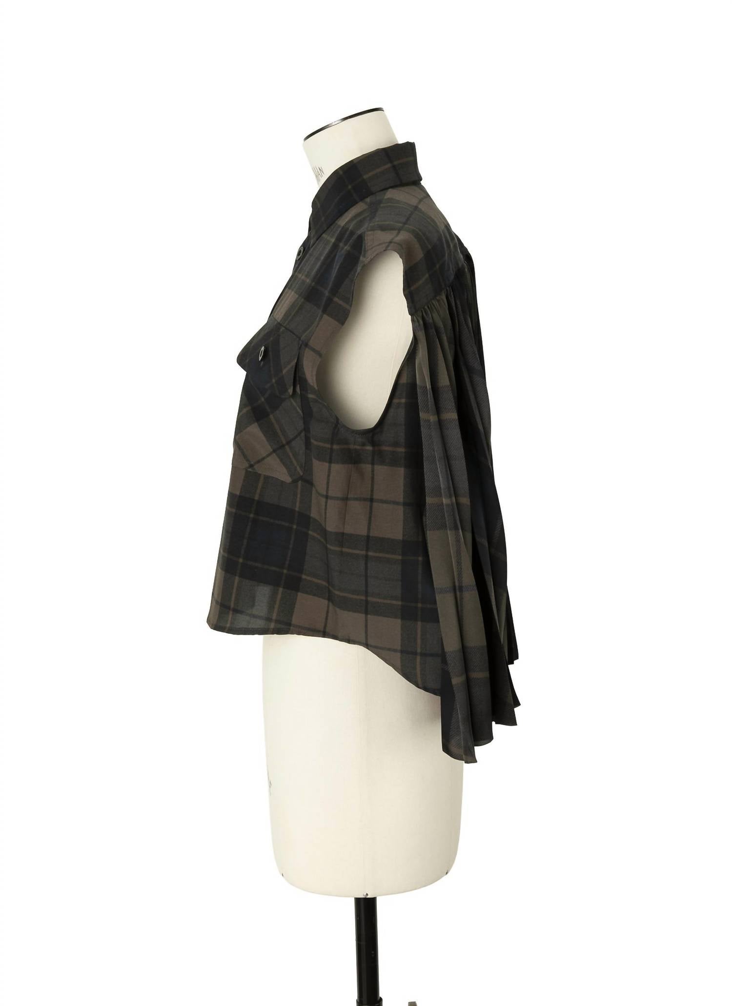 A timeless blouse that will never go out of style. Introducing the Women's Sleeveless Plaid Shirt by sacai, a chic addition to your spring wardrobe in a trendy khaki and navy plaid pattern. This blouse features a sleeveless design with a spread collar, front breast pockets, and a pleated back for added detail. It's crafted from a blend of 55% rayon and 45% cotton with polyester attached parts, ensuring comfort and style. Closure is achieved with a front button closure, and care instructions recommend hand washing and laying flat to dry.