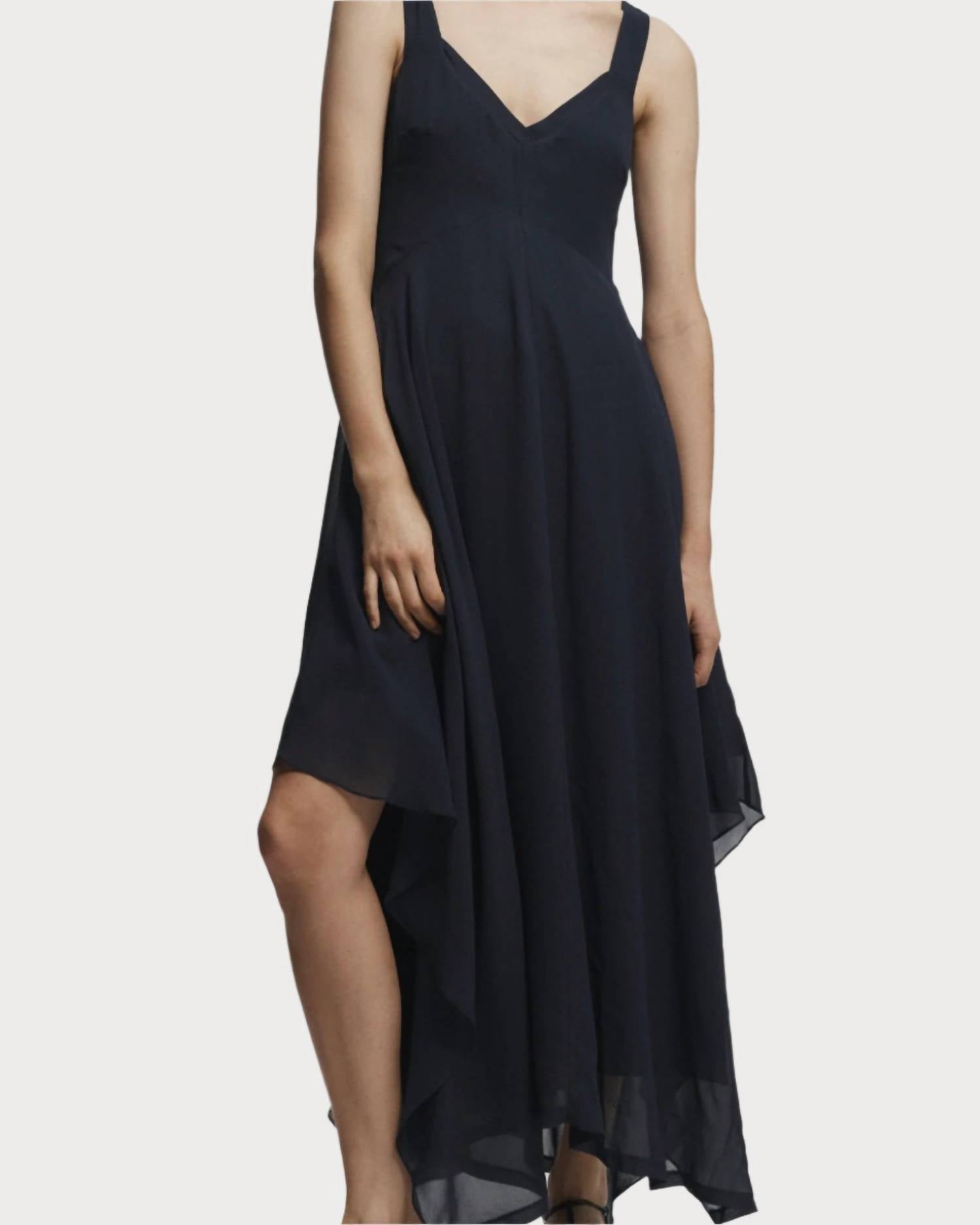 Comfortable and cute, this casual day dress has it all. The Riley Handkerchief Maxi Dress by Saint Art is a stunning sleeveless piece crafted from 100% viscose, offering a soft and fluid drape. This black maxi dress features a flattering V-neckline with wide straps and an elegant handkerchief hem, making it the ideal choice for a dinner party or warm-weather event. It is finished with a center-back zip closure for a seamless fit and includes an interior lining for added polish. Care for this elegant dress with a dry clean to maintain its effortless charm.