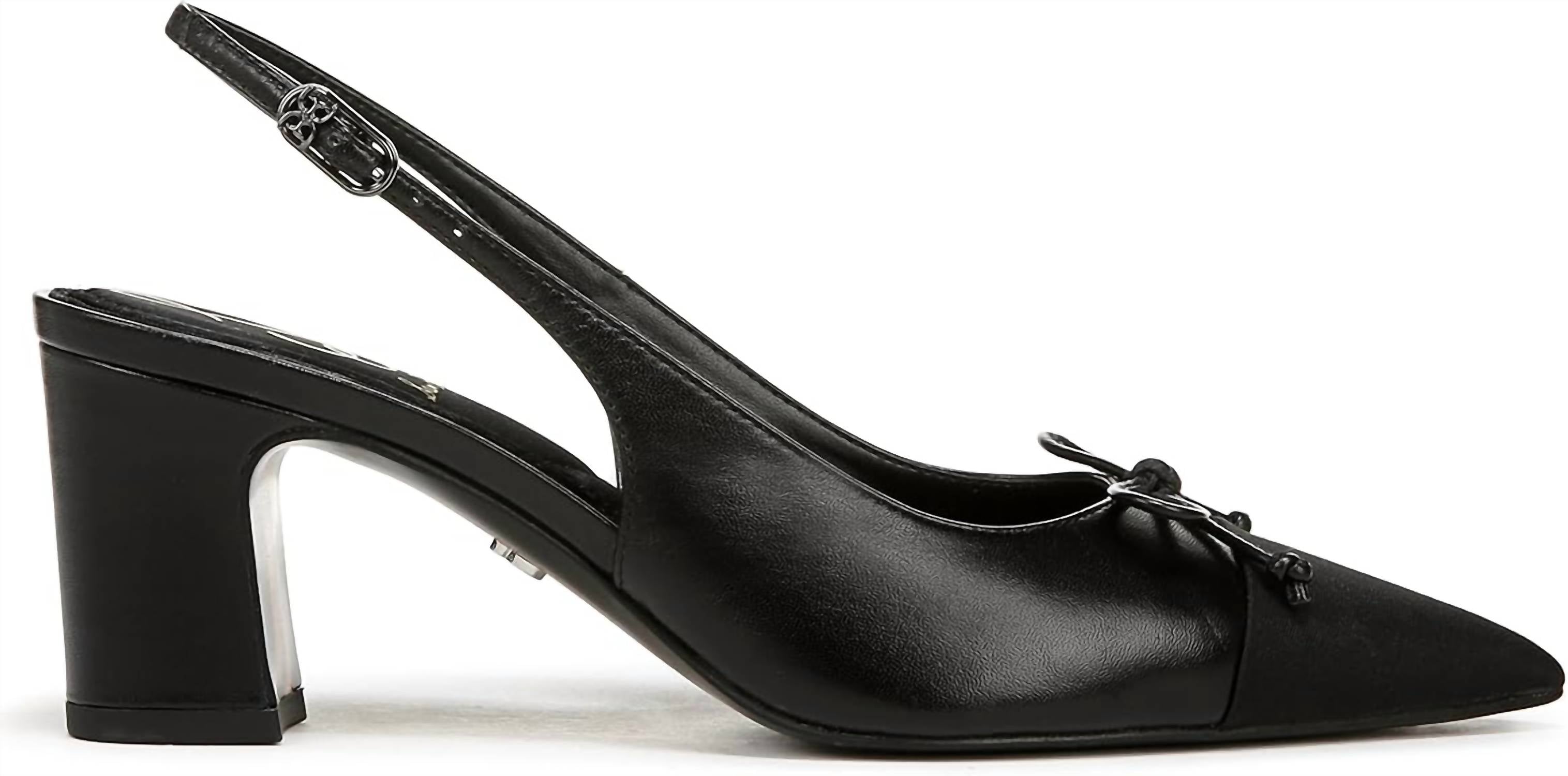 Pair these beauties with your favorite skinny jeans or dress for a night out on the town. This slingback brings a stylish twist to a classic silhouette, featuring a pointed cap toe and a charming bow detail. Set on a comfortable 2.5-inch block heel, this versatile style transitions seamlessly from brunch to the boardroom. Crafted from a mix of leather, fabric, and synthetic materials with a smooth synthetic insole for all-day wear.