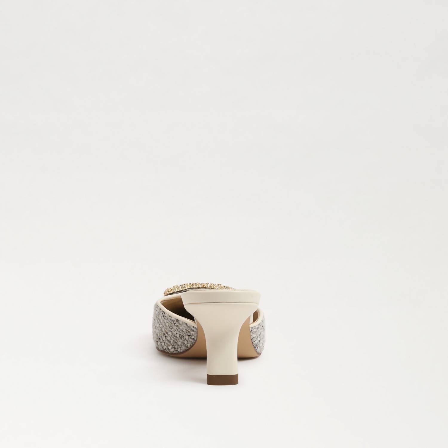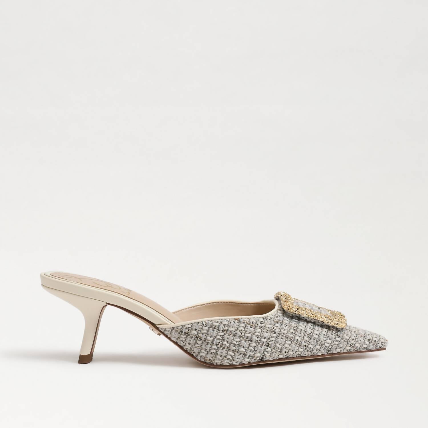 Classicly cute and all-day-wearable. We love this sandal. Step into elegance with the Women's Brit Sandal by Sam Edelman. This chic ivory multi-fabric sandal features a striking pointed toe design and a graceful kitten heel that stands at 2.4 inches. Crafted from a blend of leather and fabric with a synthetic insole, these sandals are the epitome of quiet luxury, making them perfect for a dinner party or Thanksgiving gathering. The sleek buckle detailing adds a sophisticated finish to these mid-heel delights.