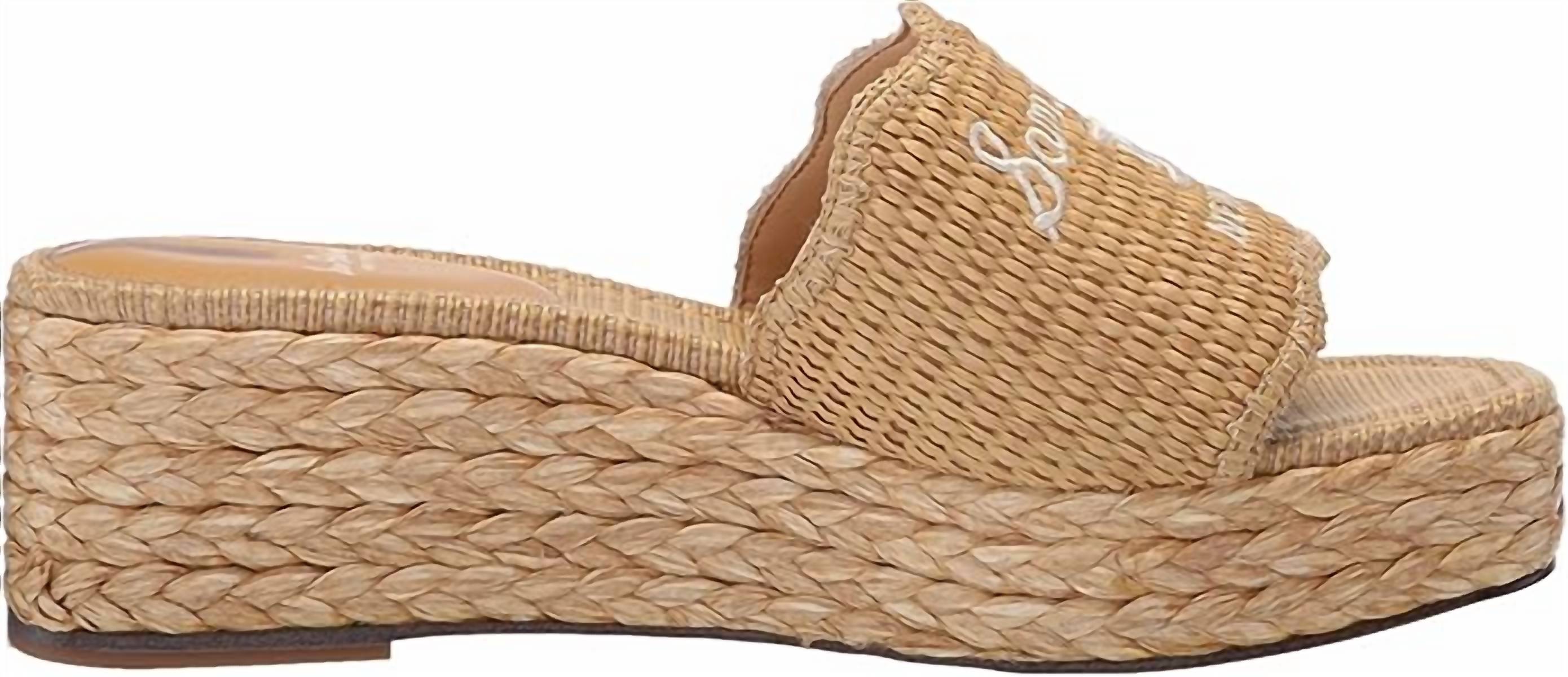 Elevate your footwear game with these adorable wedges. Step into summer style with the Women's Camila Raffia Squared Open Toe Slip On Wedge Heeled Sandals by Sam Edelman. These chic wedges in Sand feature a 2.3-inch wedge heel and an espadrille platform sole with a 1.5-inch height, perfect for travel and Thanksgiving gatherings. The sporty signature logo embroidery and scalloped trim add a unique touch to the open toe design.