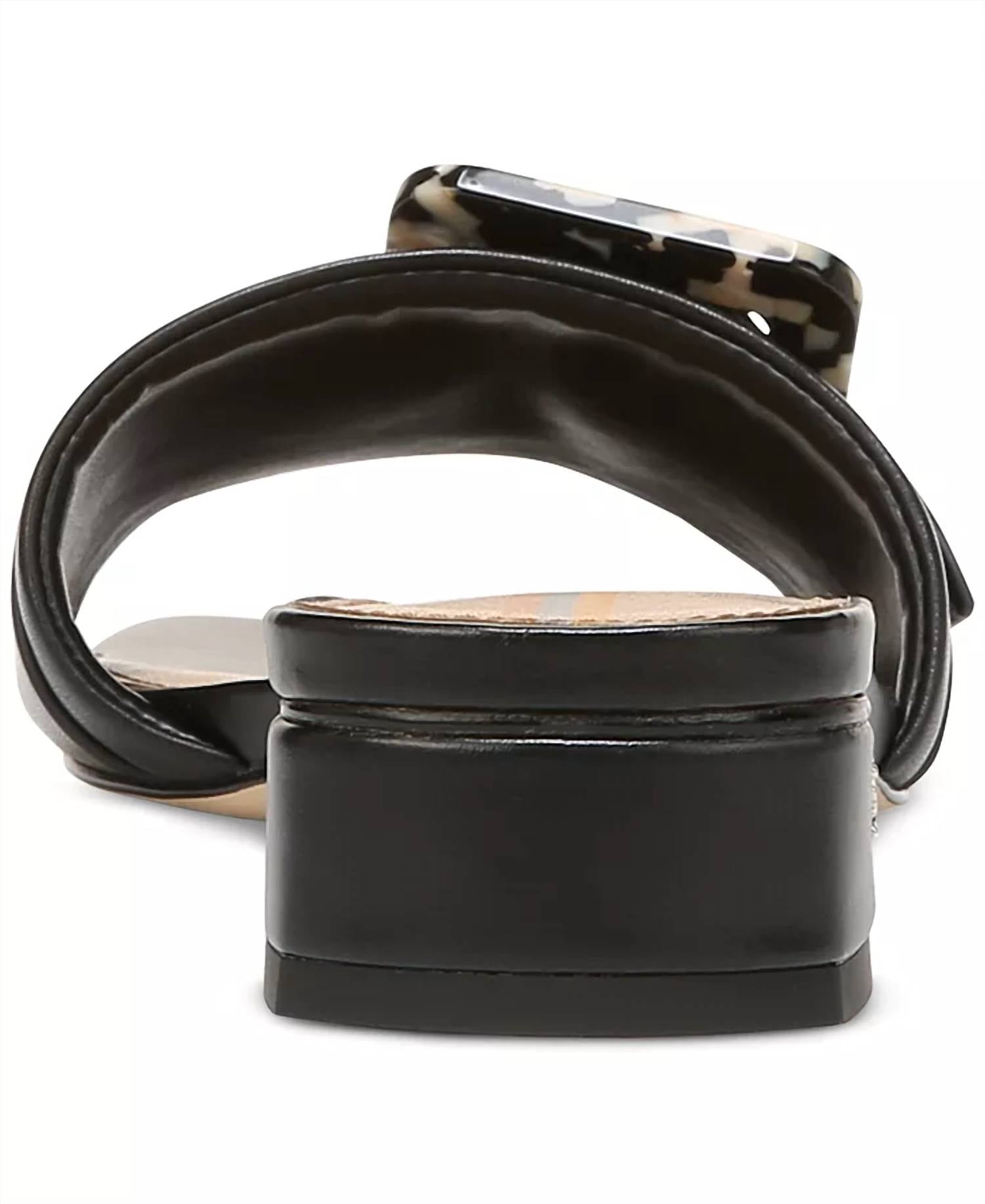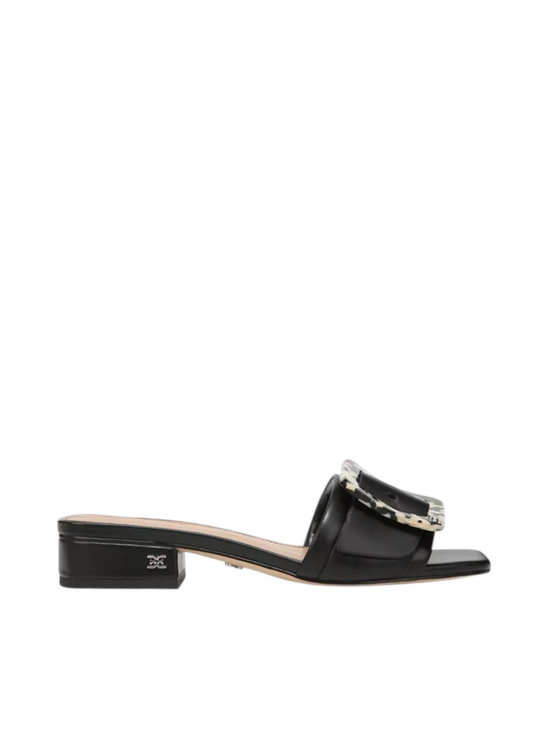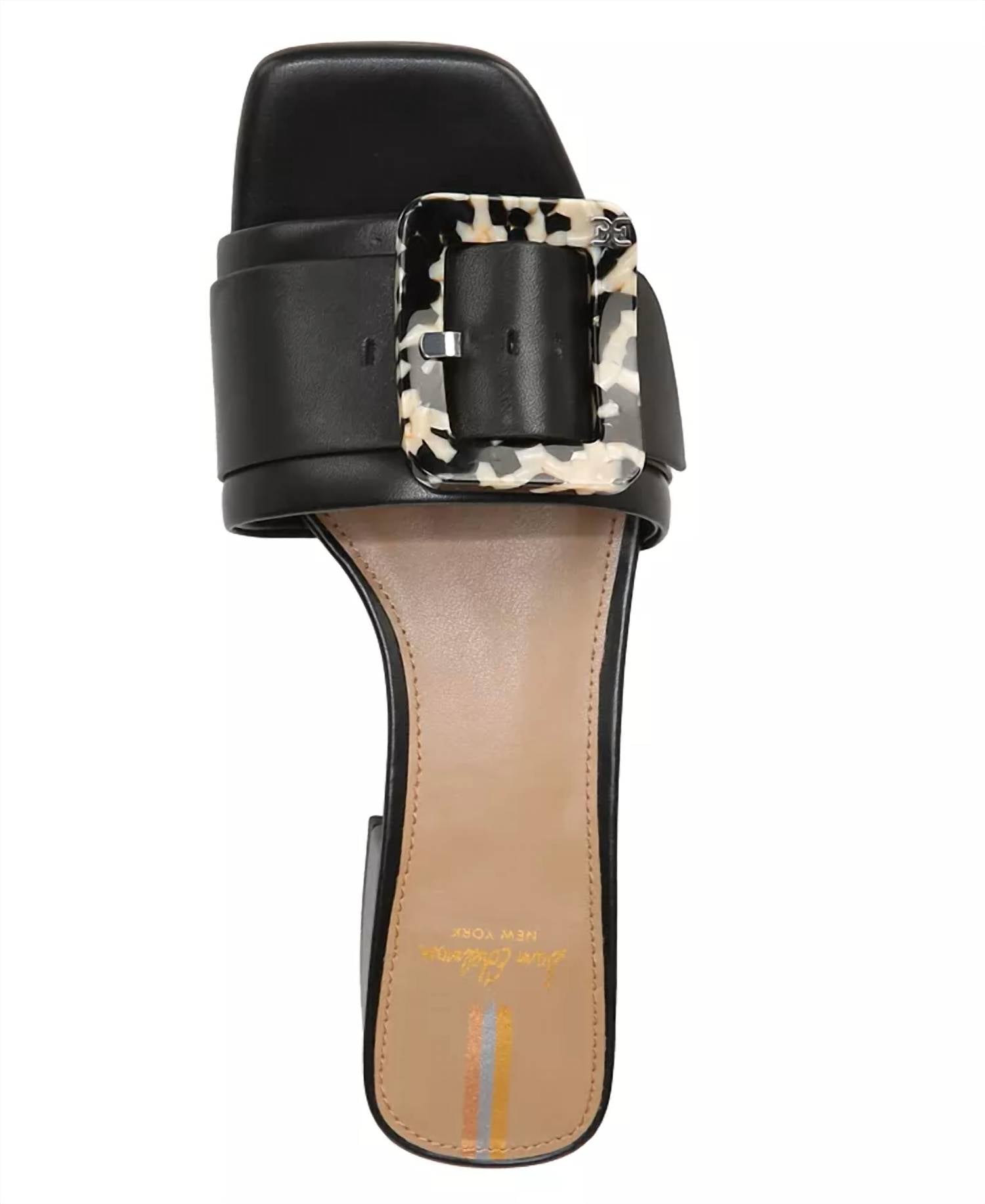 Classicly cute and all-day-wearable. We love this sandal. Meet the Women's Deacon Slide Sandal by Sam Edelman, a chic pair that's perfect for your summer wardrobe. These black slides feature a convenient slip-on closure and are crafted from quality leather with synthetic insoles for added comfort. With a modest 1-inch block heel and stylish squared toe, they seamlessly blend style and ease. The oversized buckle details add a touch of sophistication, making them an ideal choice for vacation or a dressy occasion.