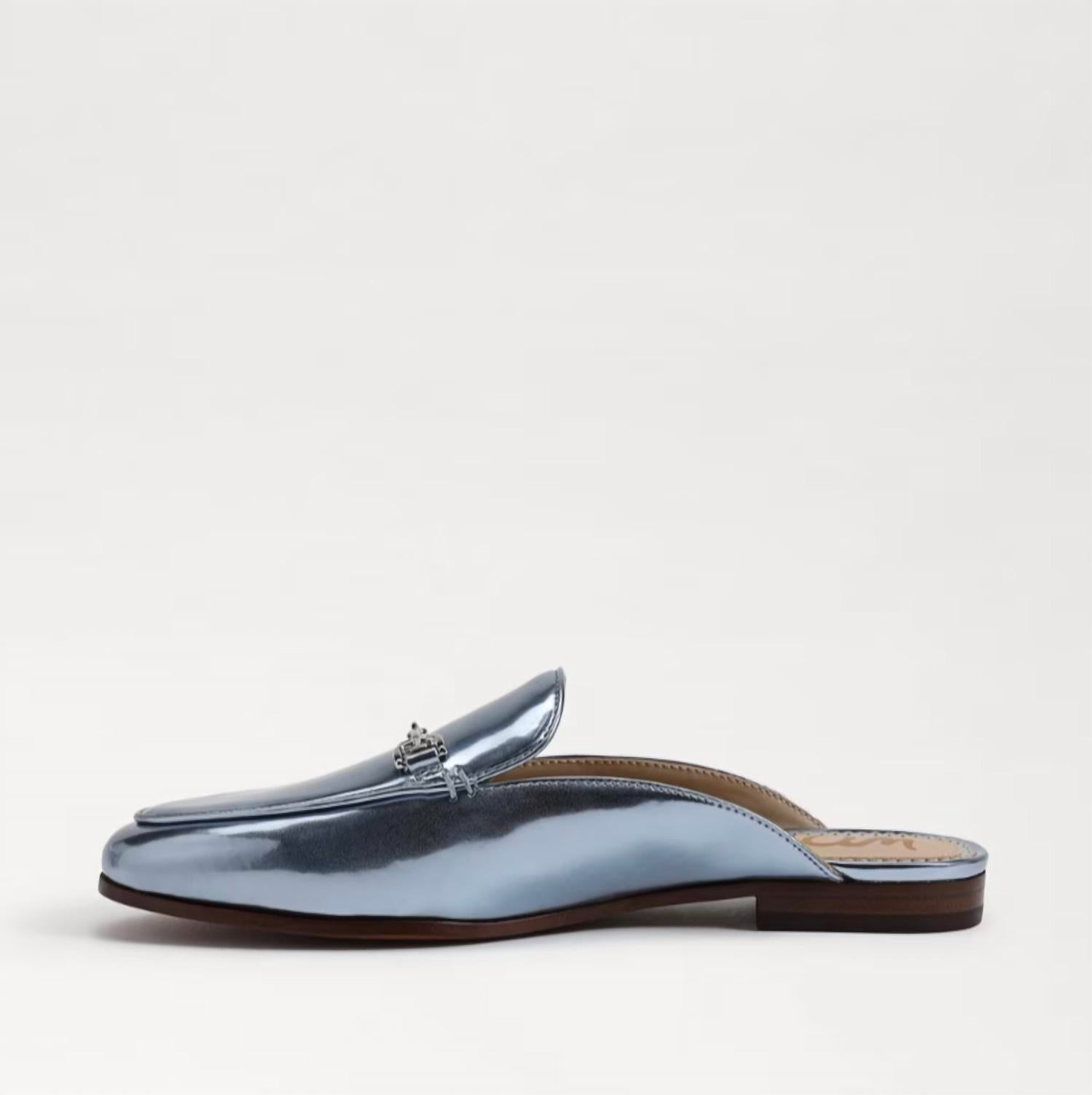 Elevate your style with the Women's Linnie Slip On Round Toe Chain Detailed Wide Mules by Sam Edelman in a stunning Metallic Sky. These sophisticated mules feature a slip-on design with gold-tone hardware and a padded footbed for comfort. The synthetic sole and flat profile make them an ideal choice for both casual and dressy occasions, from jeans to dresses. Designed with a rounded toe and flat heel, they're perfect for the Fall season and Thanksgiving holiday parties.