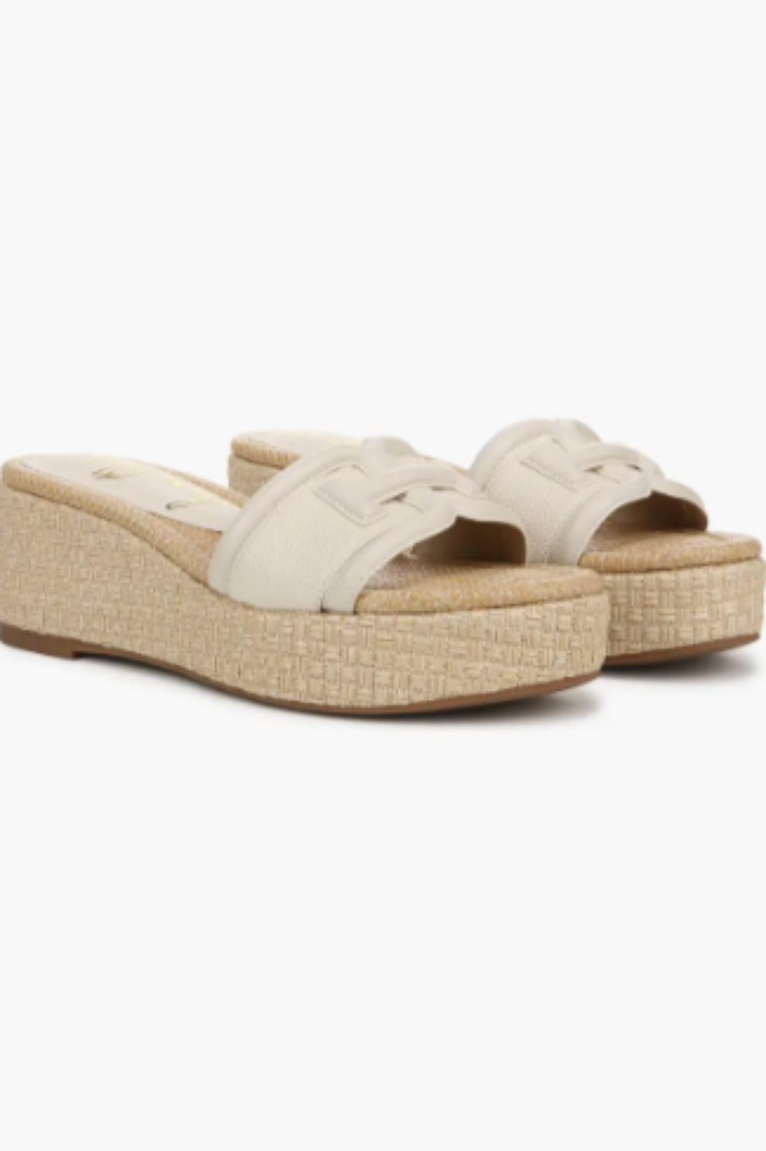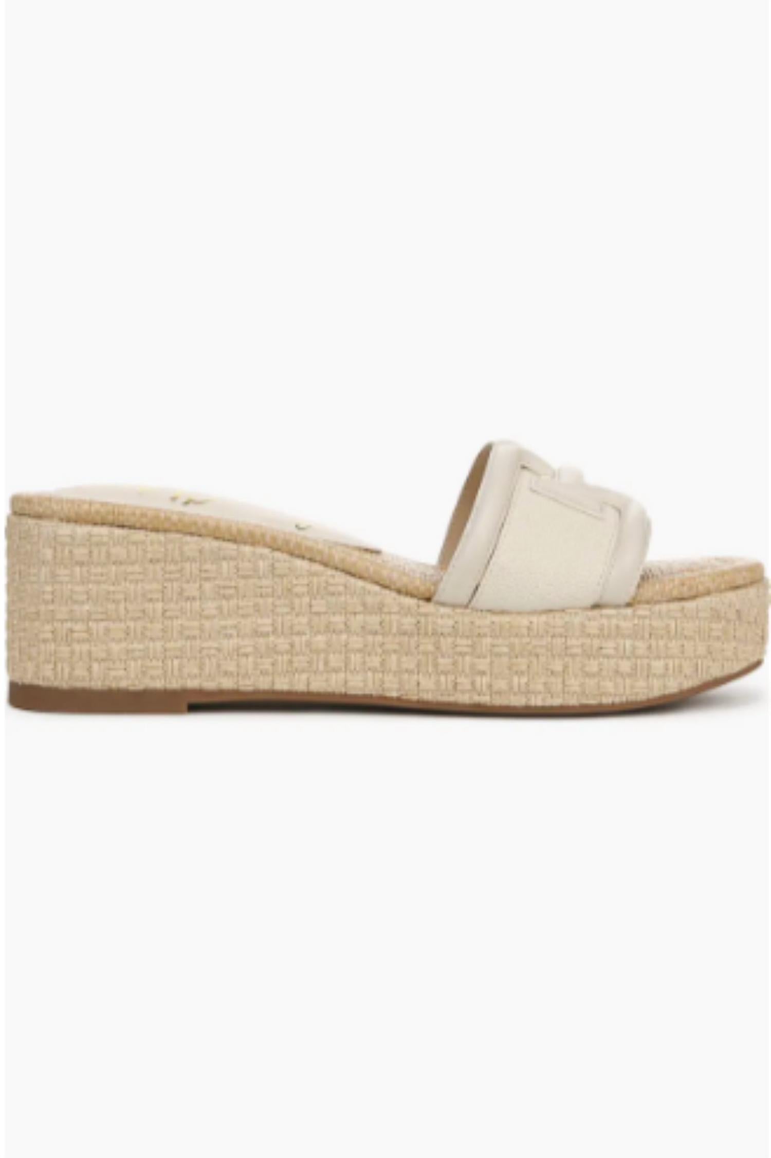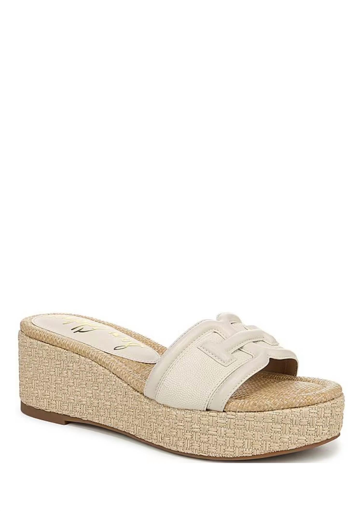 This sandal will take you from brunch to dinner and everything in between. Step into effortless style with the Women's Pauleena Slide Sandal by Sam Edelman, crafted in a chic ivory hue for the summer season. These weekend-ready sandals boast a leather and textile upper, complemented by a synthetic lining and sole. The sandal features a squared toe design and is lofted by a chunky 2 1/4-inch platform and integrated wedge heel, making it perfect for boho chic occasions like a dinner party. Proudly imported, this pair combines comfort with a bold, embossed logo.