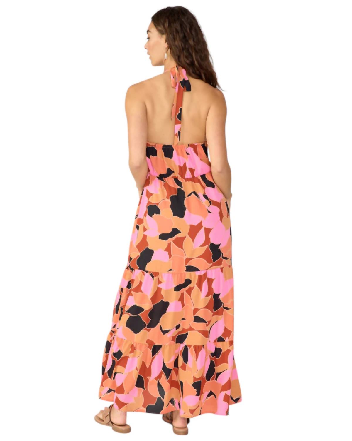 Who doesn't love a good maxi dress? This one you'll be reaching for season after season. Features a vibrant, multicolored leaf print on lightweight woven chiffon, with an adjustable halter neckline and an elastic waistband for a relaxed fit. Made from 100% recycled polyester. Machine wash cold, tumble dry low, and iron warm.