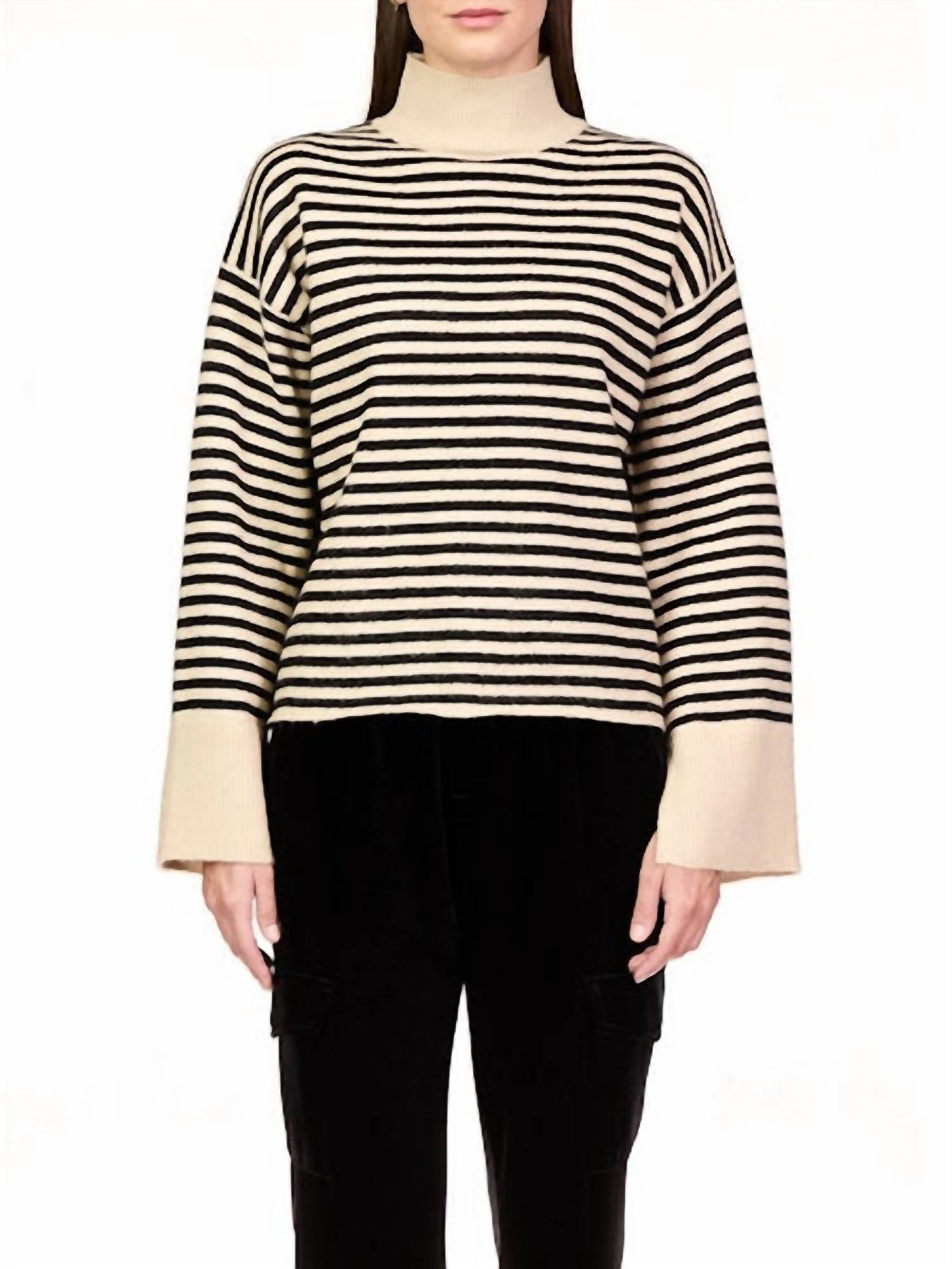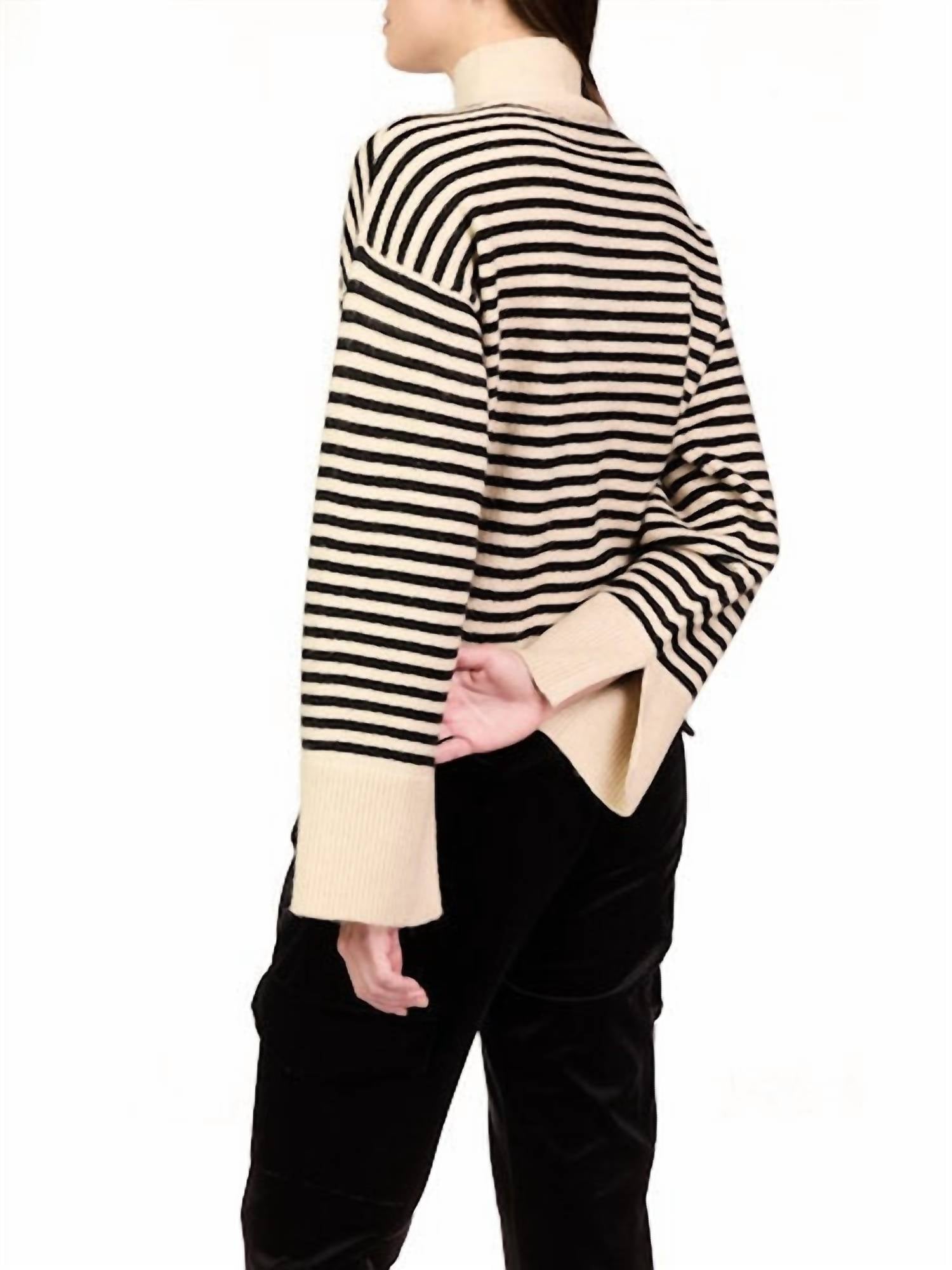 Experience the perfect blend of comfort and style with this trendy crew neck sweater, designed to effortlessly elevate your wardrobe. Pair it with your favorite denim and loafers for the perfect look. This sweater has a boxy fit, mock neck, and stripe print. It features split wrist details, ribbed cuffs and hem, and long sleeves. Made from 74% acrylic, 23% polyester, and 3% spandex. Length: 22.5". Pull-on style. Machine wash, dry flat. Imported.