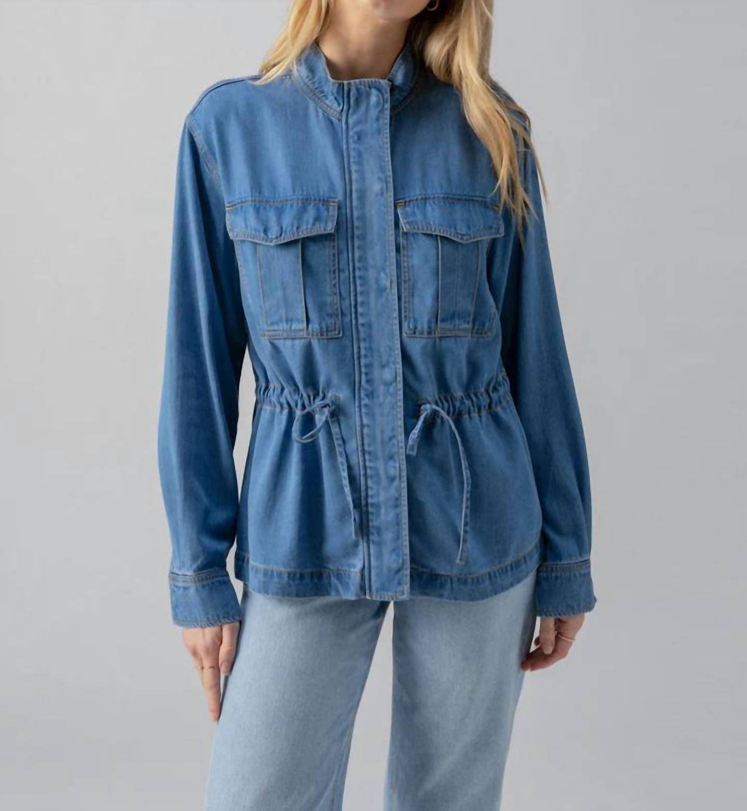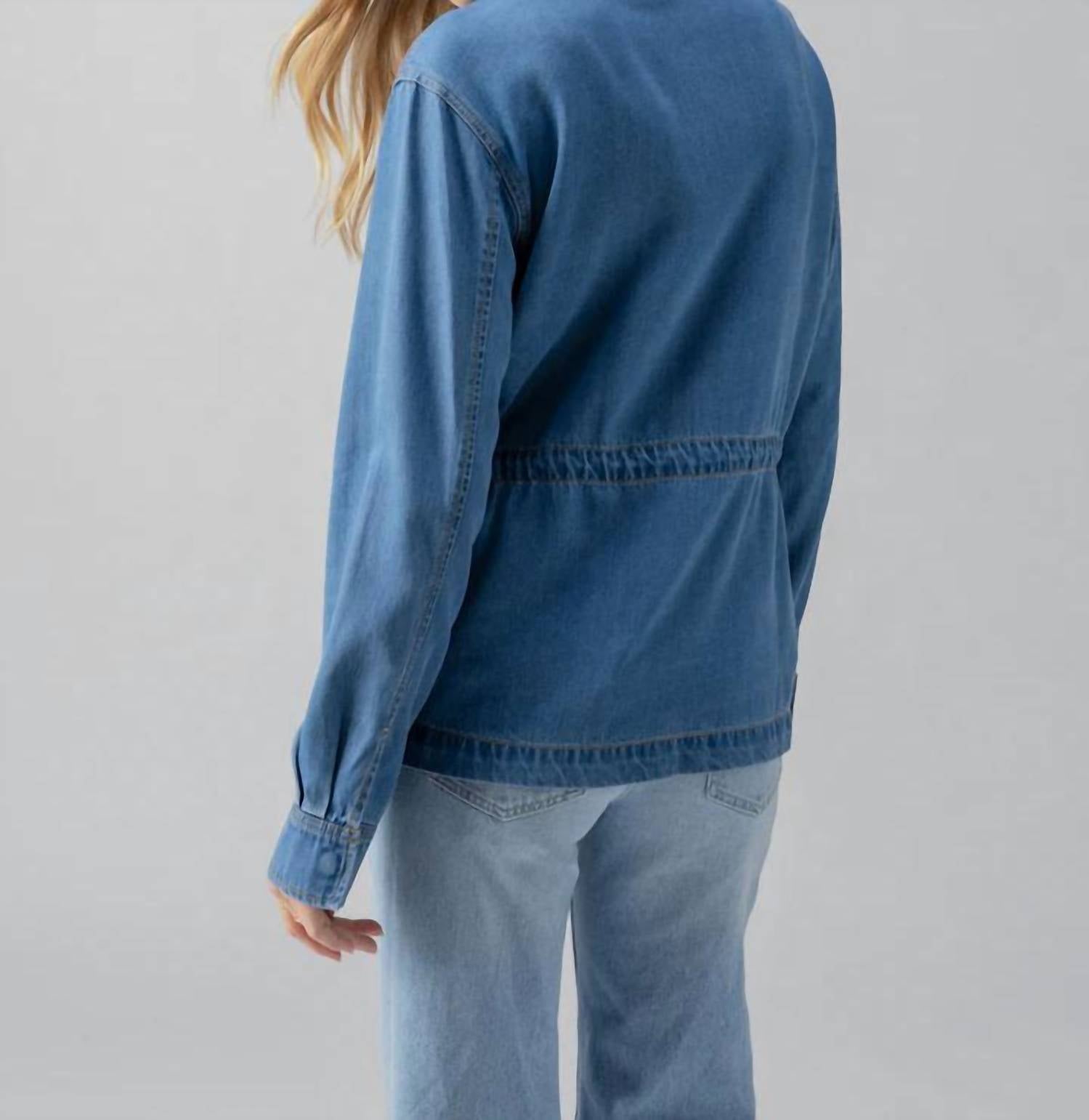 The perfect jean jacket for those slightly crisper days between seasons.Epitome of relaxed style and practicality. Long sleeve, solid jacket is composed of 85% Lyocell and 15% Cotton. Offering a soft denim feel that's lightweight and comfortable. Dimensions include a front length of 27", a bust size of 40", and a sleeve length of 32 1/2". Features a snap closure and drawstring waistband, complete with 2 chest pockets. For care, simply machine wash cold and lay flat to dry.