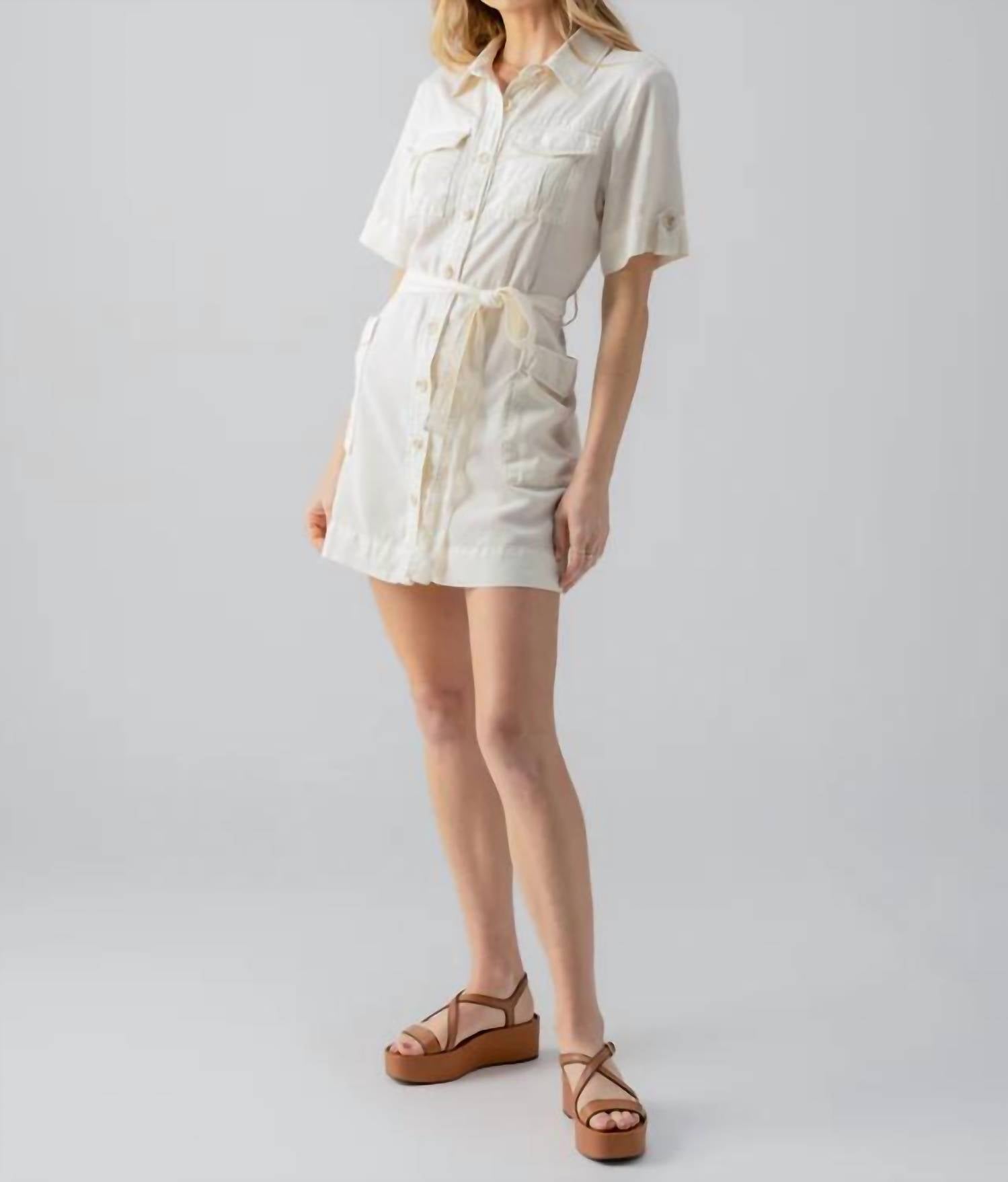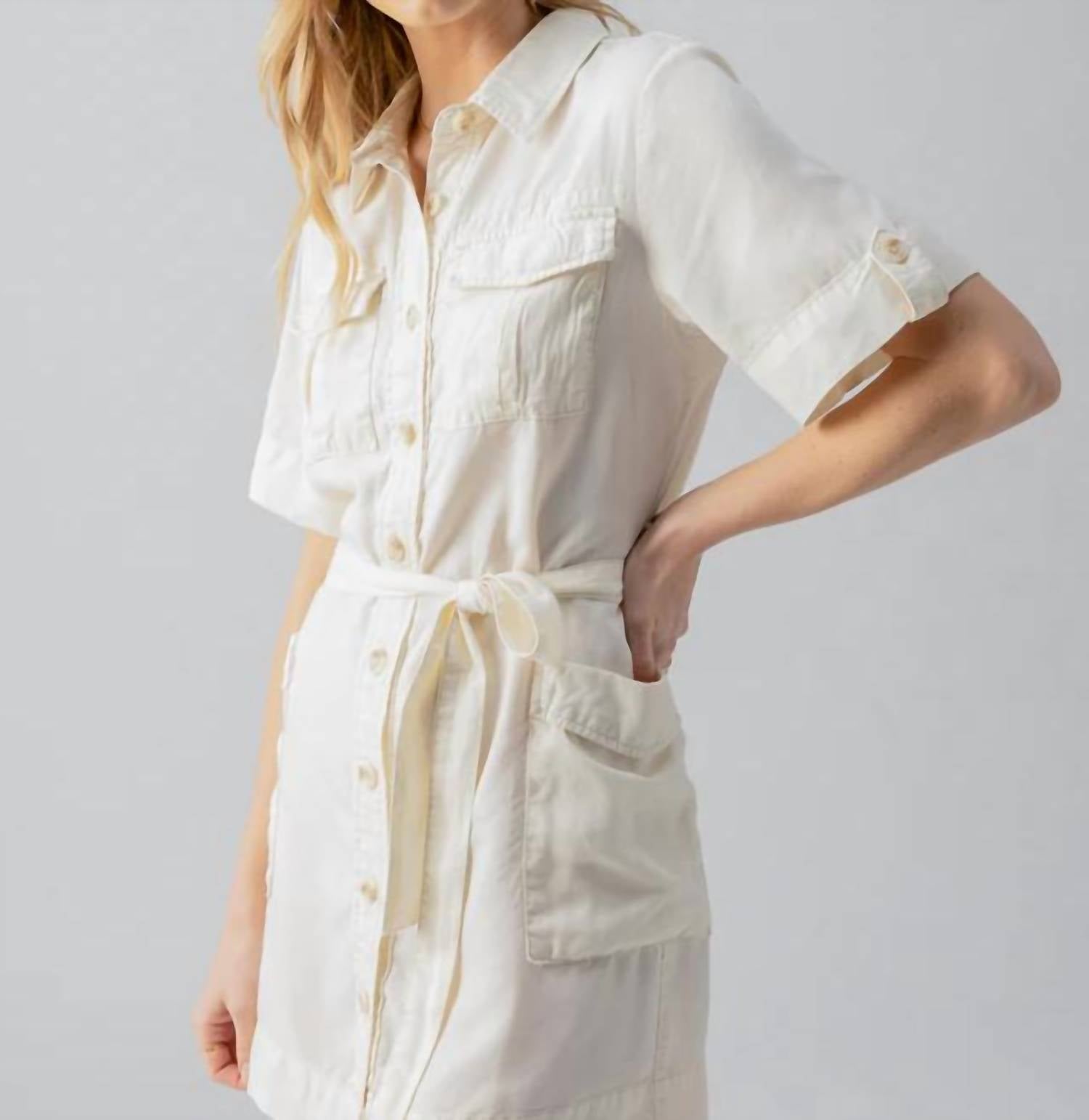 Shirt dress exudes casual elegance. Elbow-length sleeves. Composed of 100% Lyocell. Featuring a mini-length silhouette. Boasts a button front closure, a collar neckline, 2 chest pockets, and 2 side pockets for added functionality. Relaxed fit and tie waist. Care with machine wash cold and tumble dry low settings. Bust: 39". Sleeves: 18 1/2". Front Length: 35".