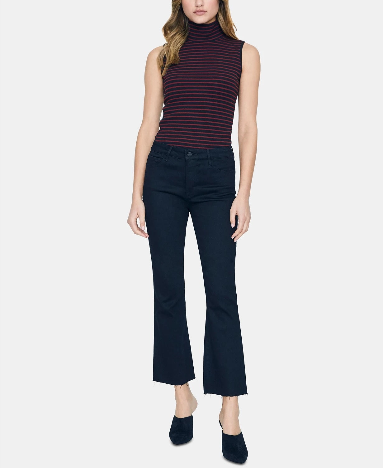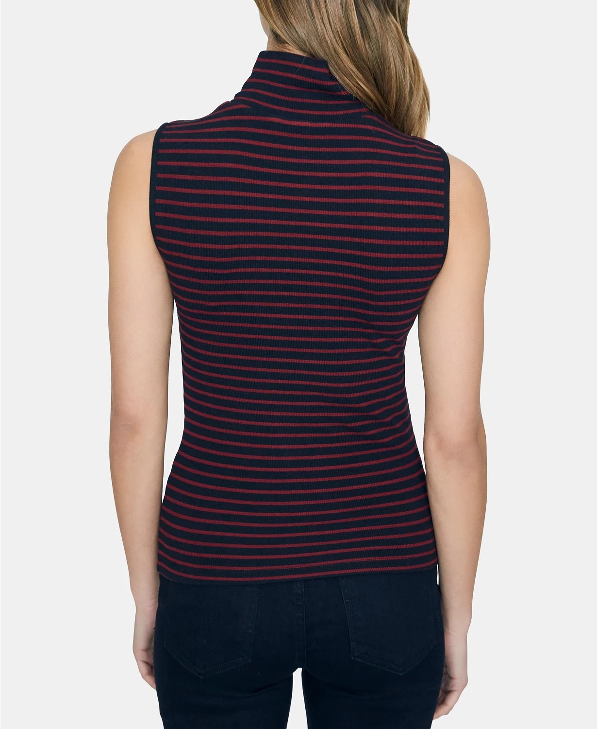 Fitted; hits at hip|Mock-neck|Sleeveless|Rayon/spandex|Machine washable