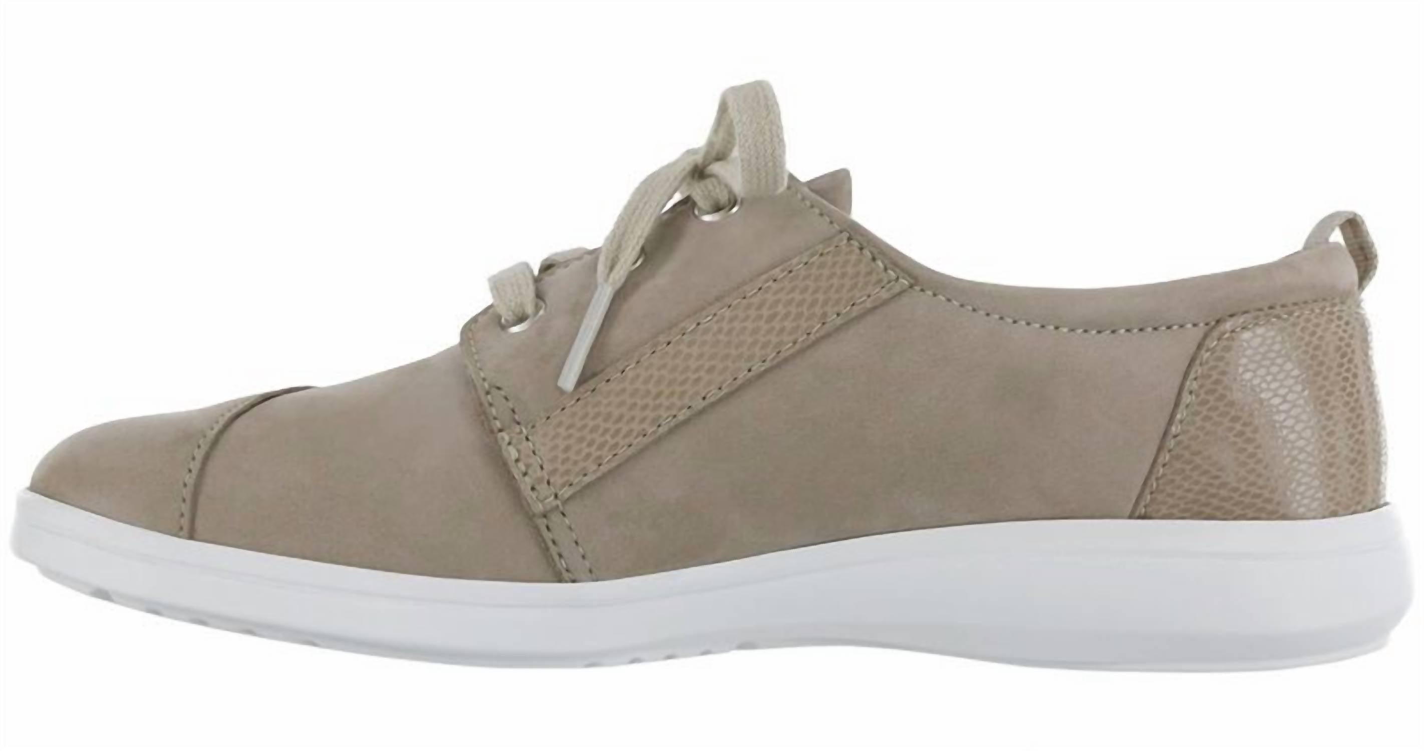 Cute, functional, and comfortable. These sneakers check all the boxes. Discover the Women's Marnie Sneaker by SAS, a perfect blend of comfort and style in chic taupe/snake. Designed with Strobel construction, these sneakers feature a cushioned upper lining and genuine leather for all-day comfort. Boasting a 1.125" heel height, they also come with a removable footbed and SAS's TRIPAD® technology to keep you feeling great on any casual occasion. Ideal for summer and game days, these round-toe lace-ups embody a preppy trend.