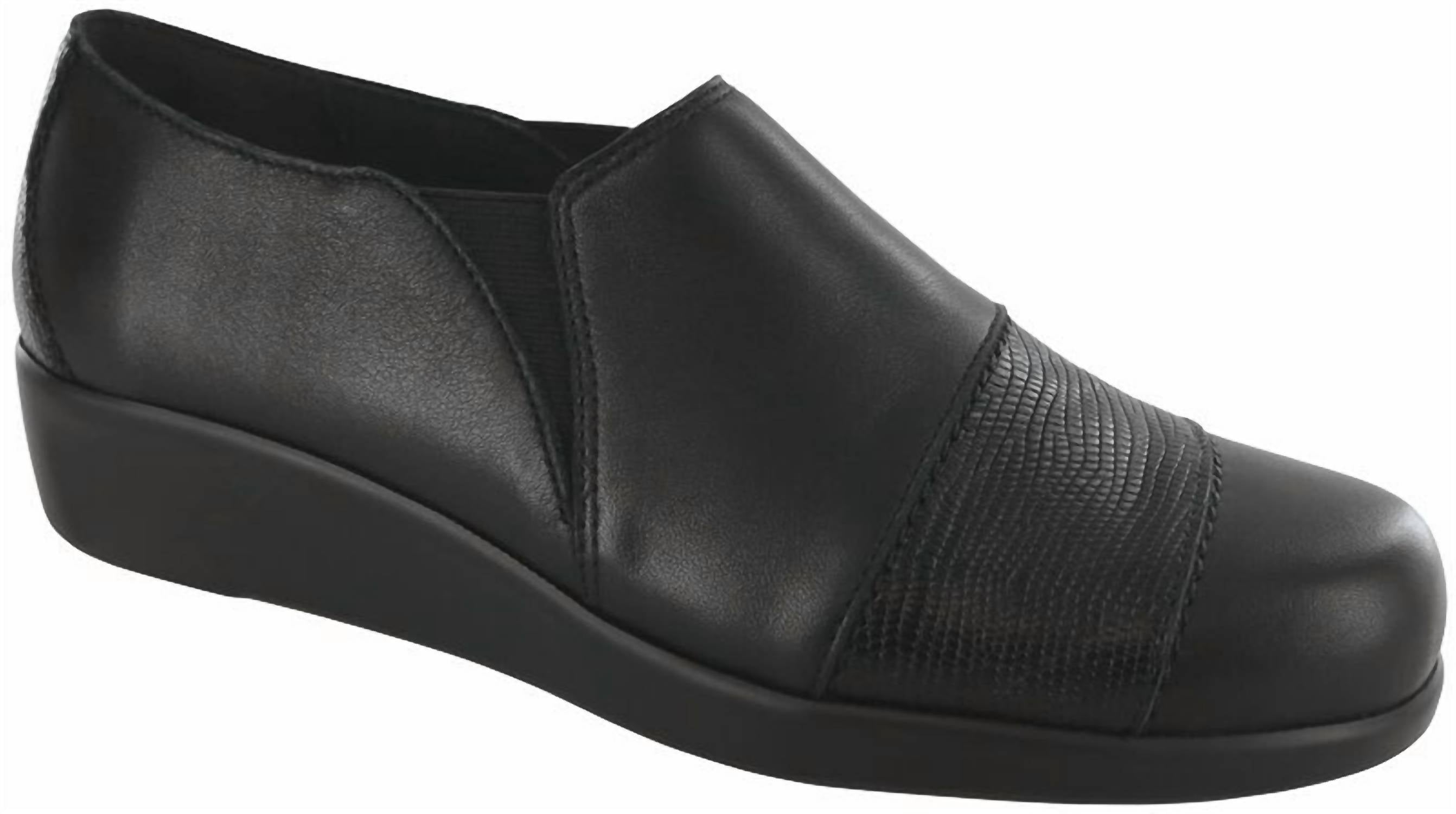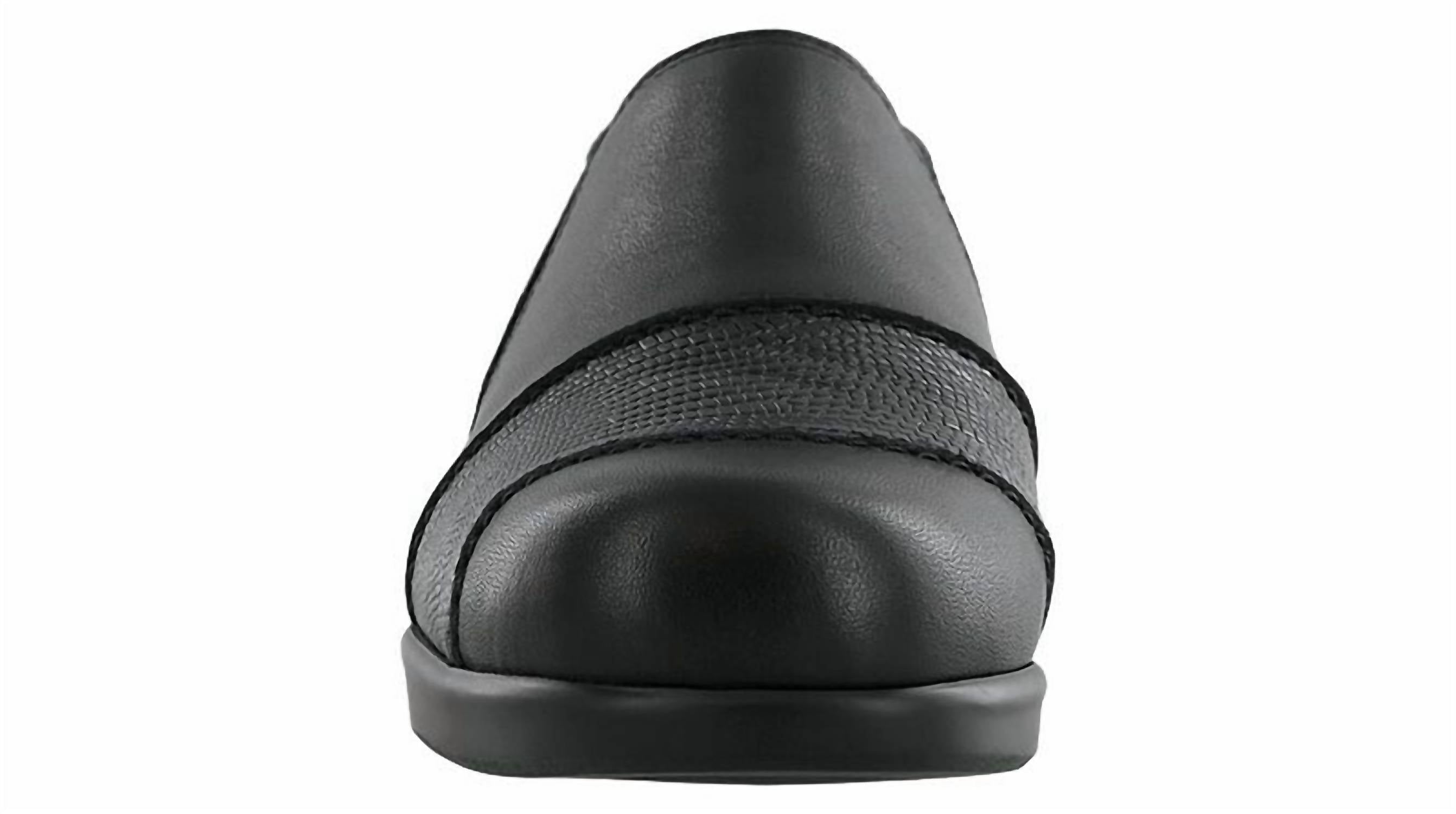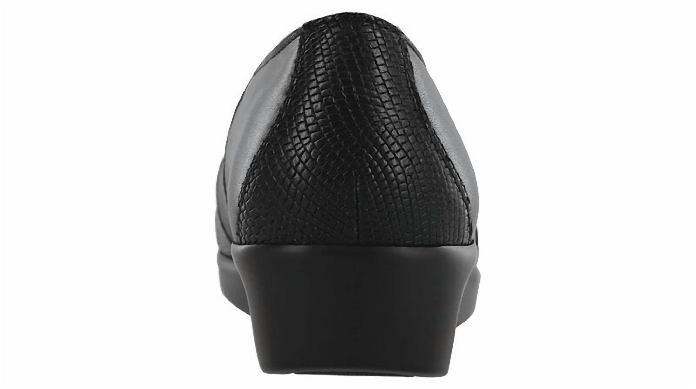 A preppy yet feminine take on the classic loafer. Step into comfort with the SAS Women's Nora Slip On Loafer, featuring a genuine patent leather upper in an elegant black lizard finish. Designed with a low 1.50-inch wedge heel, this loafer offers a modern silhouette perfect for travel and everyday wear. The Nora showcases TRIPAD® Technology for superior support and a Supersoft® Sole that absorbs shock with each step. This shoe includes a removable footbed for customizable comfort and fits effortlessly into any spring or Thanksgiving wardrobe.
