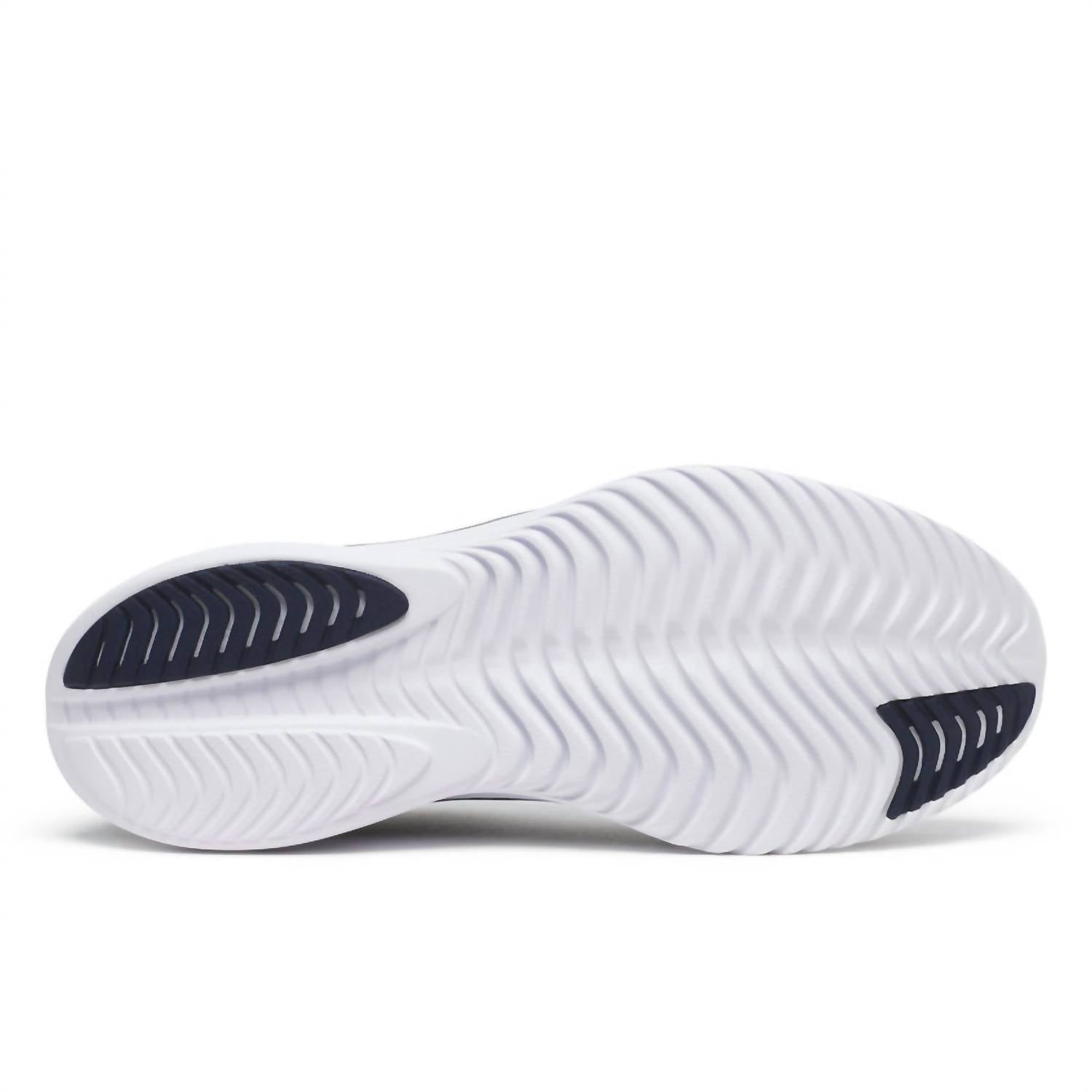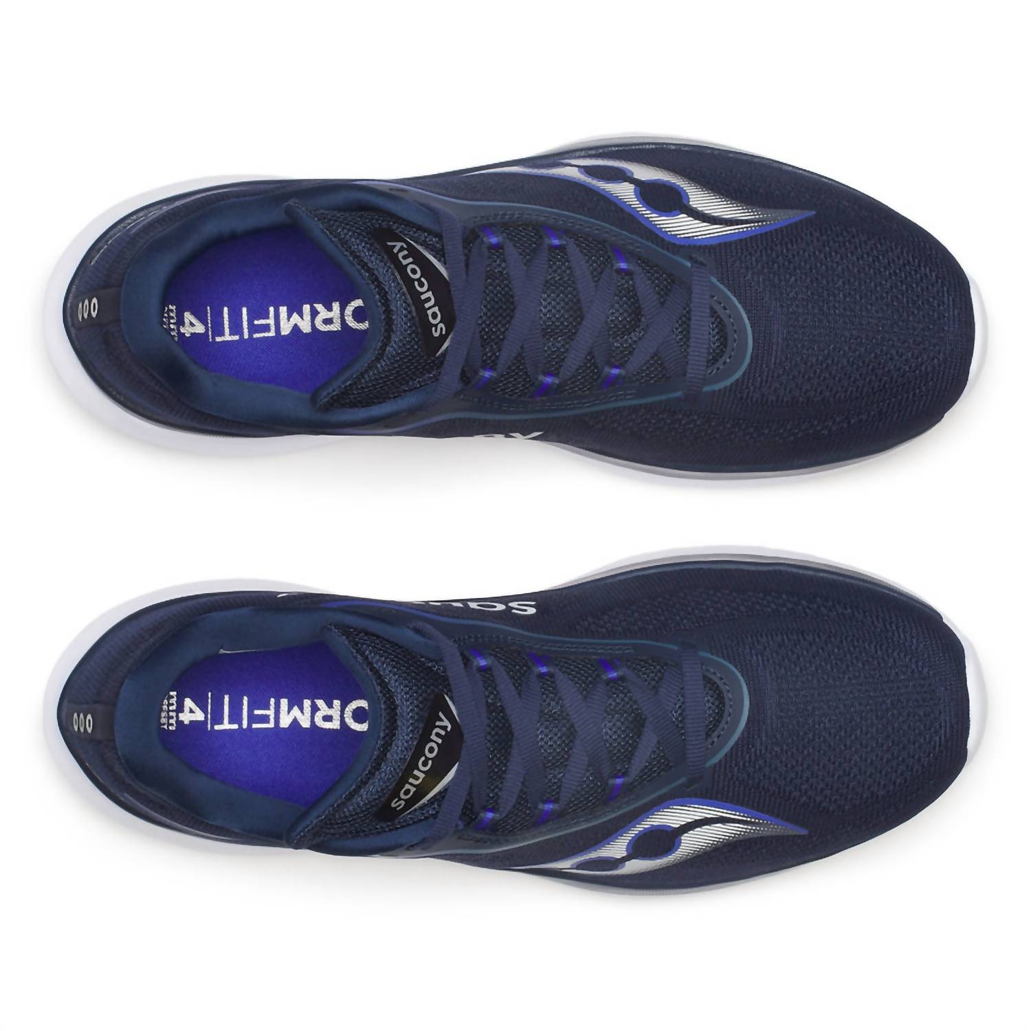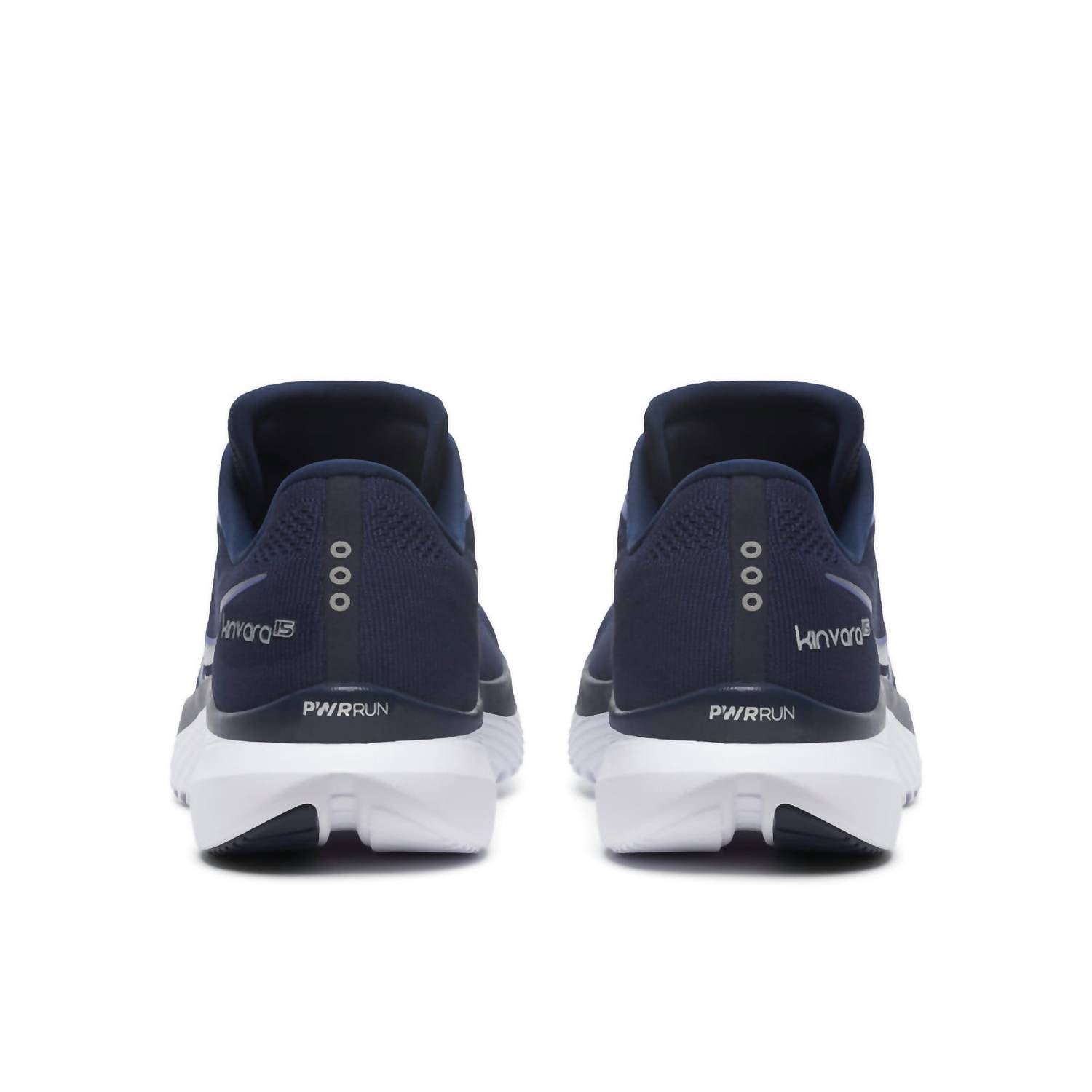 Introducing the Men's Kinvara 15 Training Shoes by Saucony, perfect for those seeking a fast and lightweight experience. These sneakers feature a lightweight seamless engineered mesh upper, providing breathable comfort for distraction-free wear. The shoes are crafted with a smooth and responsive PWRRUN foam midsole, offering a flexible and lightweight cushioning for an exceptional ground feel. Available in a sleek navy/white color, they incorporate XT-900 carbon rubber for durability and traction, with a rounded toe and a low heel height.
