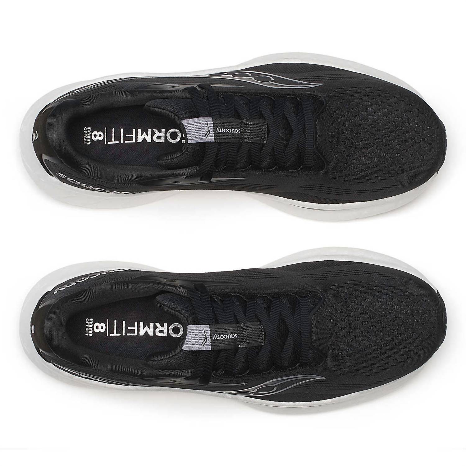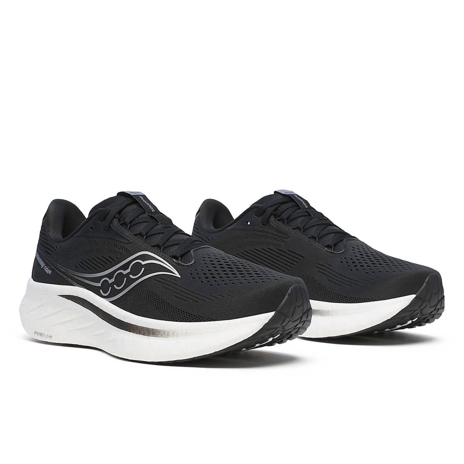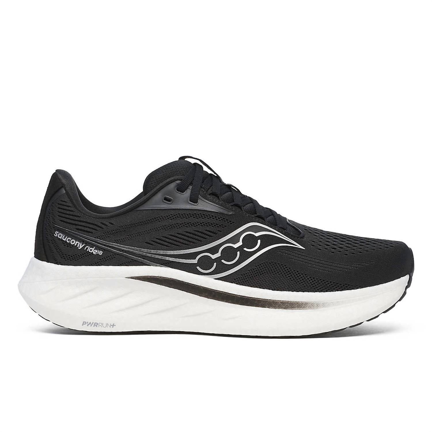 Introducing the Men's Ride 18 Running Shoes by Saucony, perfect for athleisure enthusiasts who value comfort and style. Crafted in a sleek black and white colorway, these shoes feature a flat heel design with a norm heel height of under 1 inch, making them ideal for fitness and workout occasions. Designed with a round toe shape, the updated geometry and softer cushioning promise enhanced comfort over long distances. Perfect for adult men looking to step into summer with a piece that seamlessly transitions from fitness to fashion.