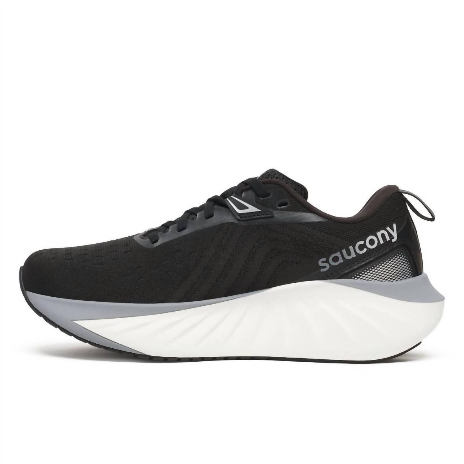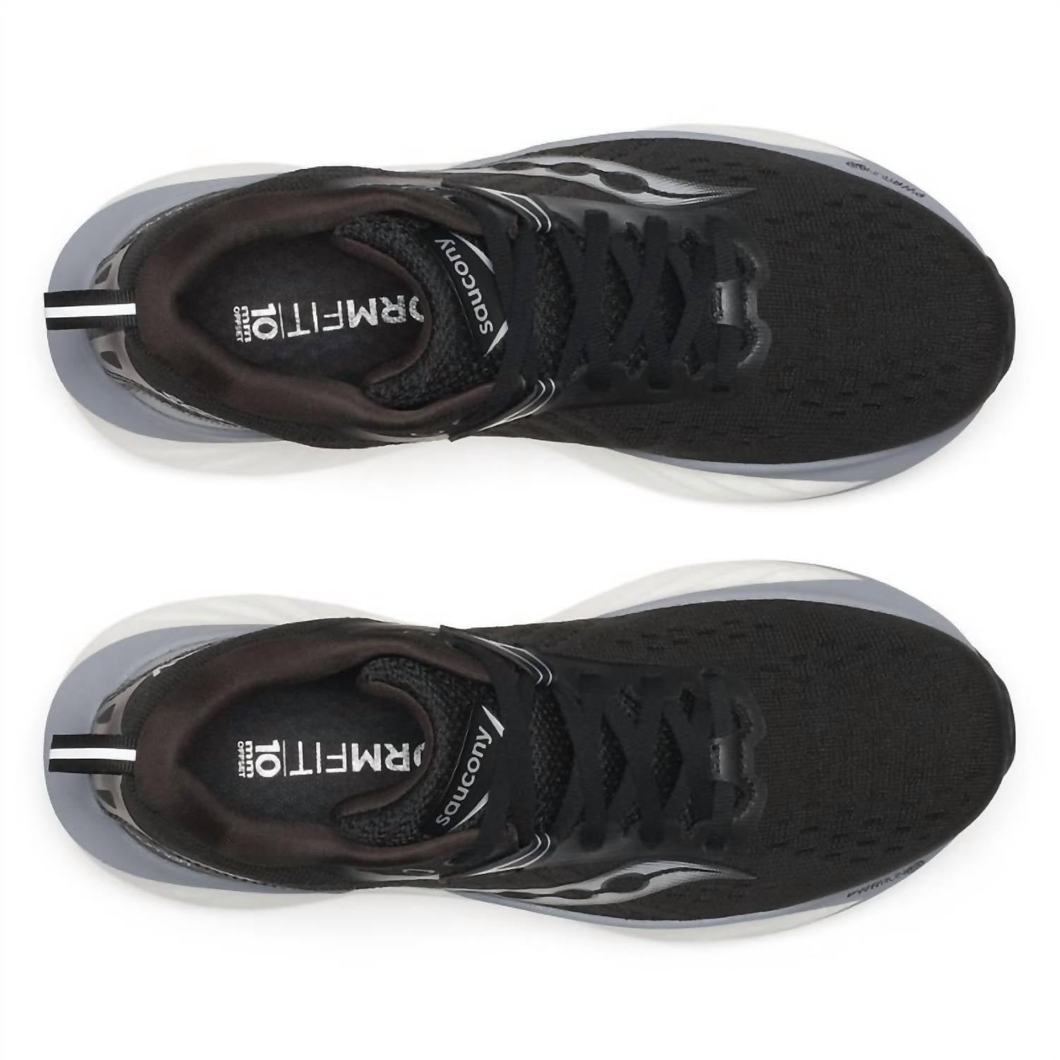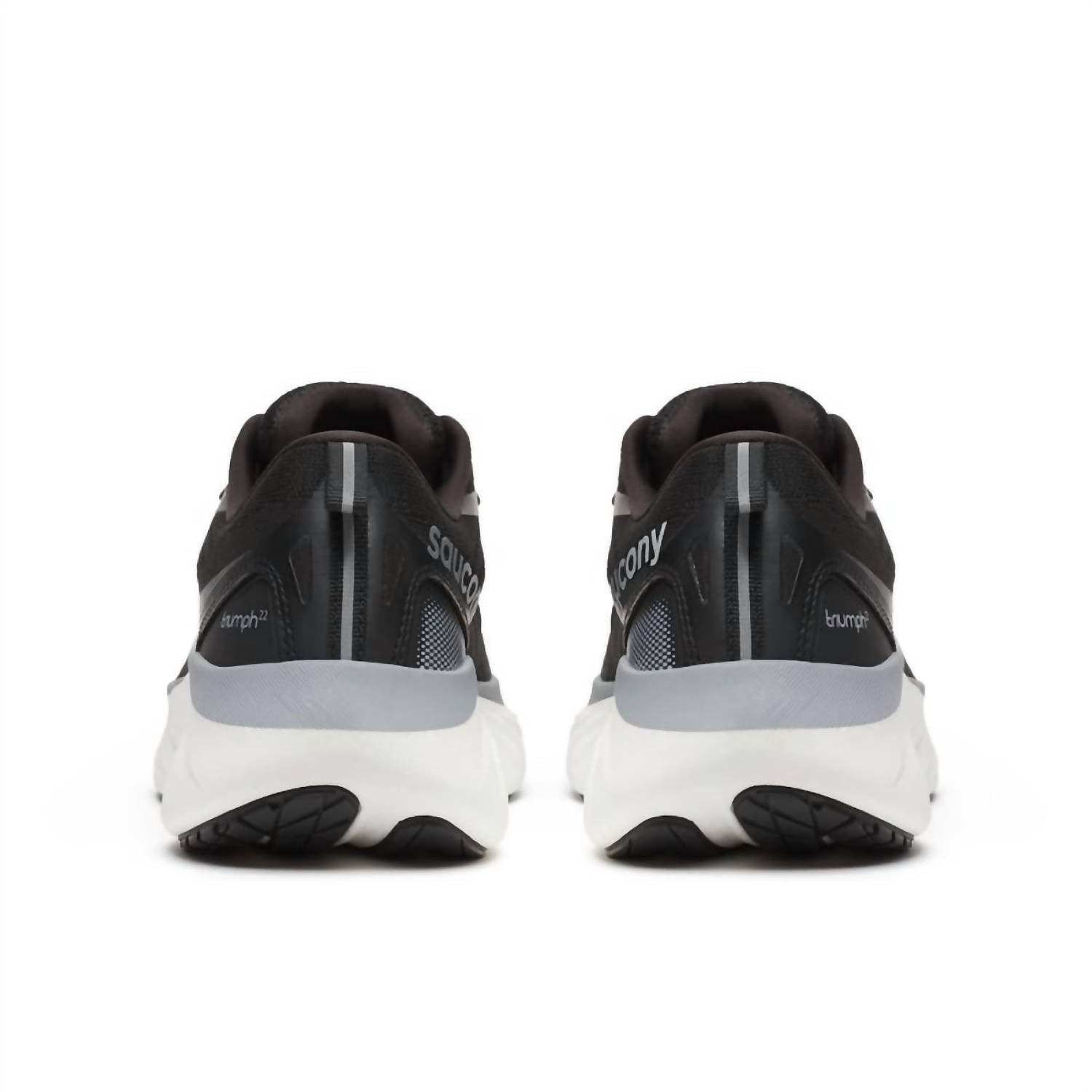 Experience the ultimate in comfort with the Men's Triumph 22 Shoes by SAUCONY, designed for the discerning runner who seeks both performance and style. The PWRRUN PB foam provides superior cushioning and energy return, enhancing every stride. These athletic shoes feature a round toe shape and flat heel, perfect for summer athleisure and fitness occasions. Available in a sleek black and white color combination, these shoes are crafted to bring joy to your running experience.