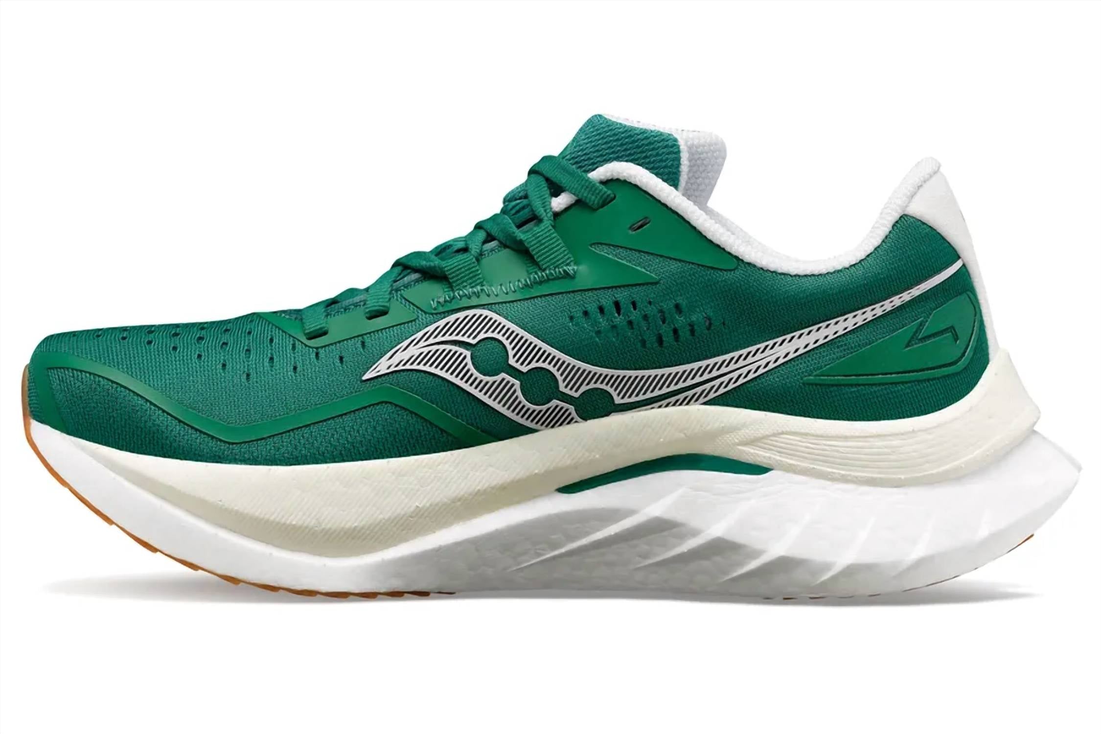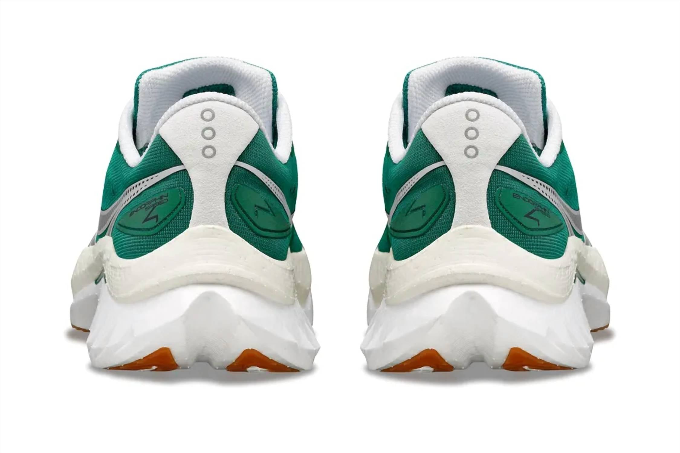 Workout in style with these adorable athletic sneakers. Experience race-day speed and long-distance comfort with the Women's Endorphin Speed 4 Running Shoes by Saucony. Designed for the road with an 8 mm heel-to-toe drop, these shoes feature a round toe and are perfect for the modern athleisure trend. The Verdant/white color pairs effortlessly with workout attire, while the revolutionary winged nylon plate, SPEEDROLL technology, and PWRRUN PB foam deliver cushioning and exceptional energy return. Suitable for summer fitness workouts, they offer moderate cushioning in a lightweight design weighing 8.2 oz for men and 7.2 oz for women.