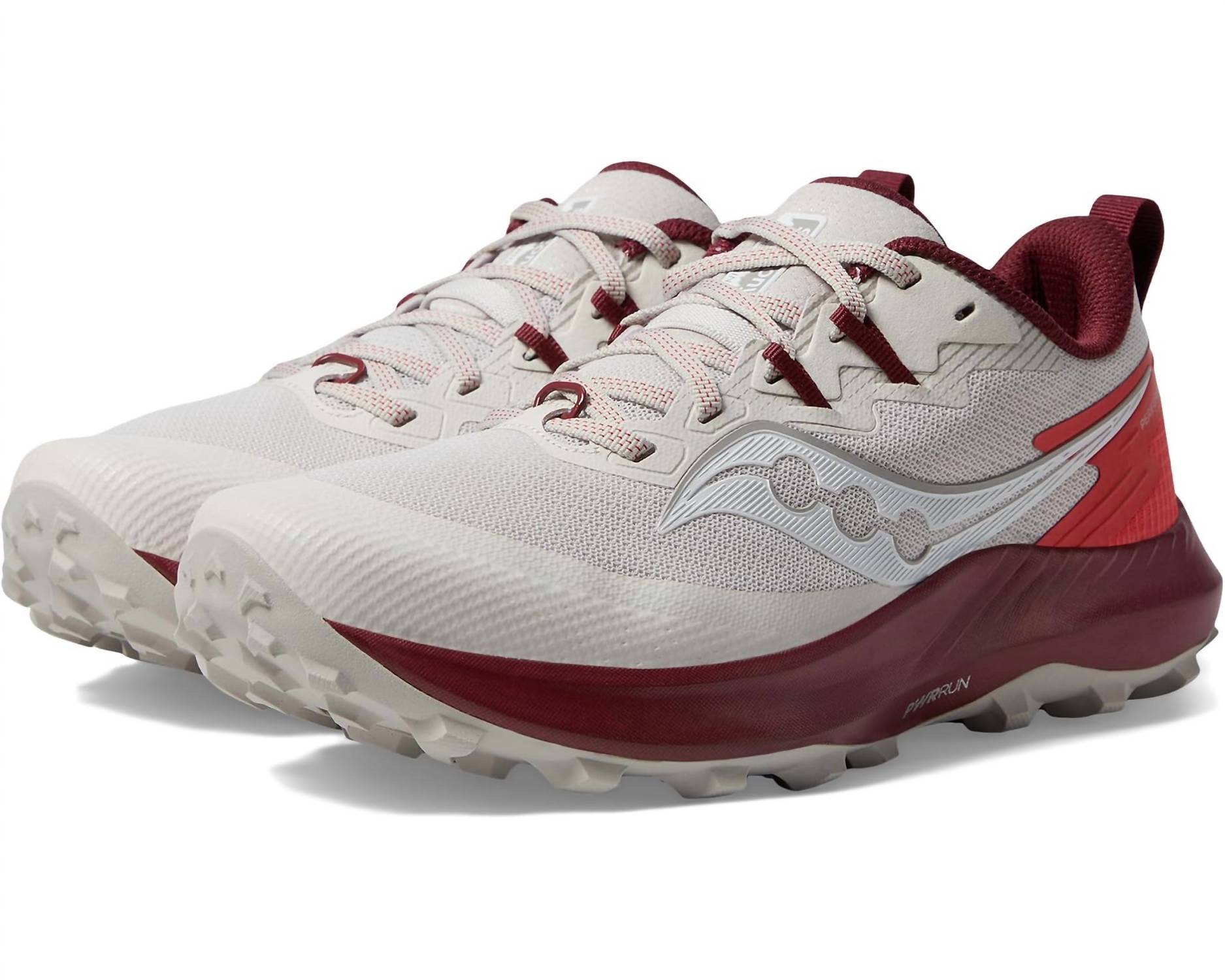 Workout in style with these adorable athletic sneakers. Embrace the thrill of exploration with the Women's Peregrine 14 Running Shoes by Saucony, designed to offer max protection and ultimate freedom. These athletic shoes in a stylish Dove/Currant colorway feature a medium width and round toe shape, perfect for trail running and casual treks. The PWRRUN cushioning and PWRRUN+ sockliner ensure comfort with every step, while the PWRTRAC rubber outsole with grippy 5mm lugs provides excellent traction on steep terrains. Weighing just 8.5oz (242g) with a 4mm heel-to-toe offset, these vegan shoes incorporate recycled materials and cater to athleisure trends, making them ideal for summer adventures and game days.
