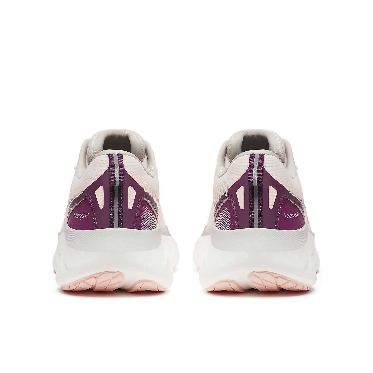 When fashion meets function. Introducing the Saucony Women's Triumph 22 Running Shoes, engineered in a stylish Moon/Eggplant colorway for the modern runner. These shoes feature an adaptive lacing system paired with an engineered mesh upper, offering a snug and secure fit with a round toe design. The ultra-light PWRRUN PB super foam in the midsole ensures a highly cushioned experience, complemented by the wedge heel style for all-day comfort and support. Ideal for athleisure and fitness workouts, these shoes promise exceptional traction with full-length XT-900 rubber, making them perfect for everything from daily miles to weekend long runs.