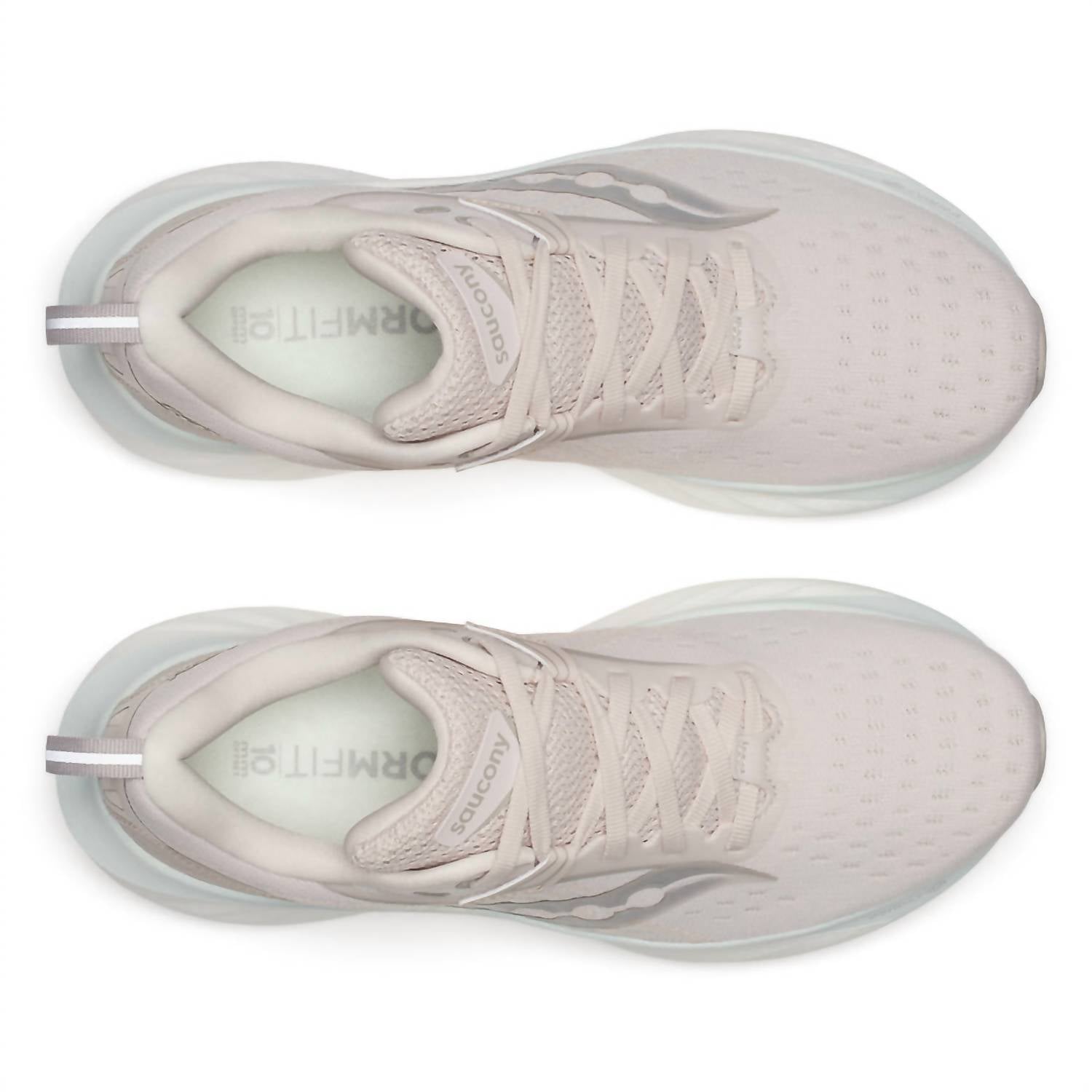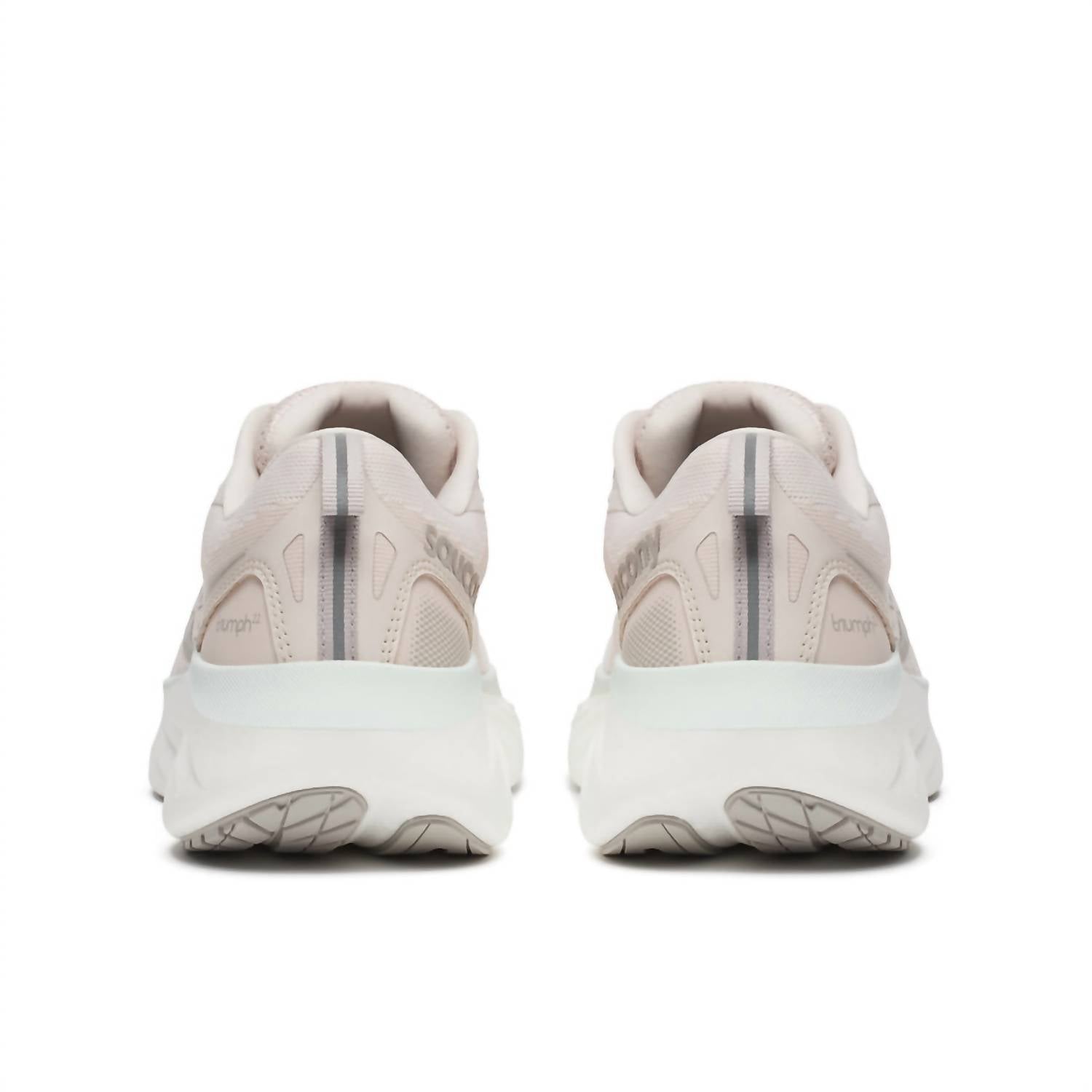 Workout in style with these adorable athletic sneakers. Elevate your run with the Women's Triumph 22 Shoes by Saucony, designed for those who find joy in every stride. These Moon-colored athletic shoes feature a round toe and flat heel, offering a comfortable fit perfect for fitness and workout sessions. Engineered with PWRRUN PB foam, they provide exceptional cushioning and energy return, making them ideal for summer athleisure and 4th of July activities. Embrace the revolutionized style and construction for a cushy, smile-inducing running experience.