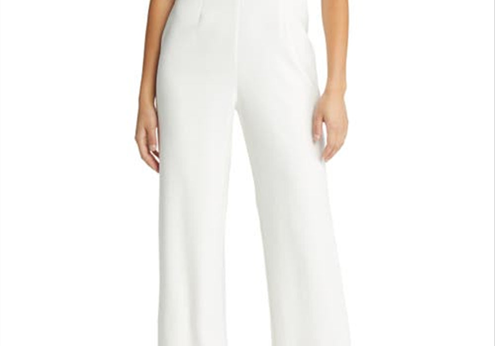 Wedding White color | Size Small | Faux Feather Detail | Satin Material | Sleeveless Design | Jumpsuit Style | Delicate Back Zip | Elegantly Cinched Waist | Soft| Fluid Drape | Flattering V-neckline | Acclaimed Saylor Brand | Nordstrom Exclusive.