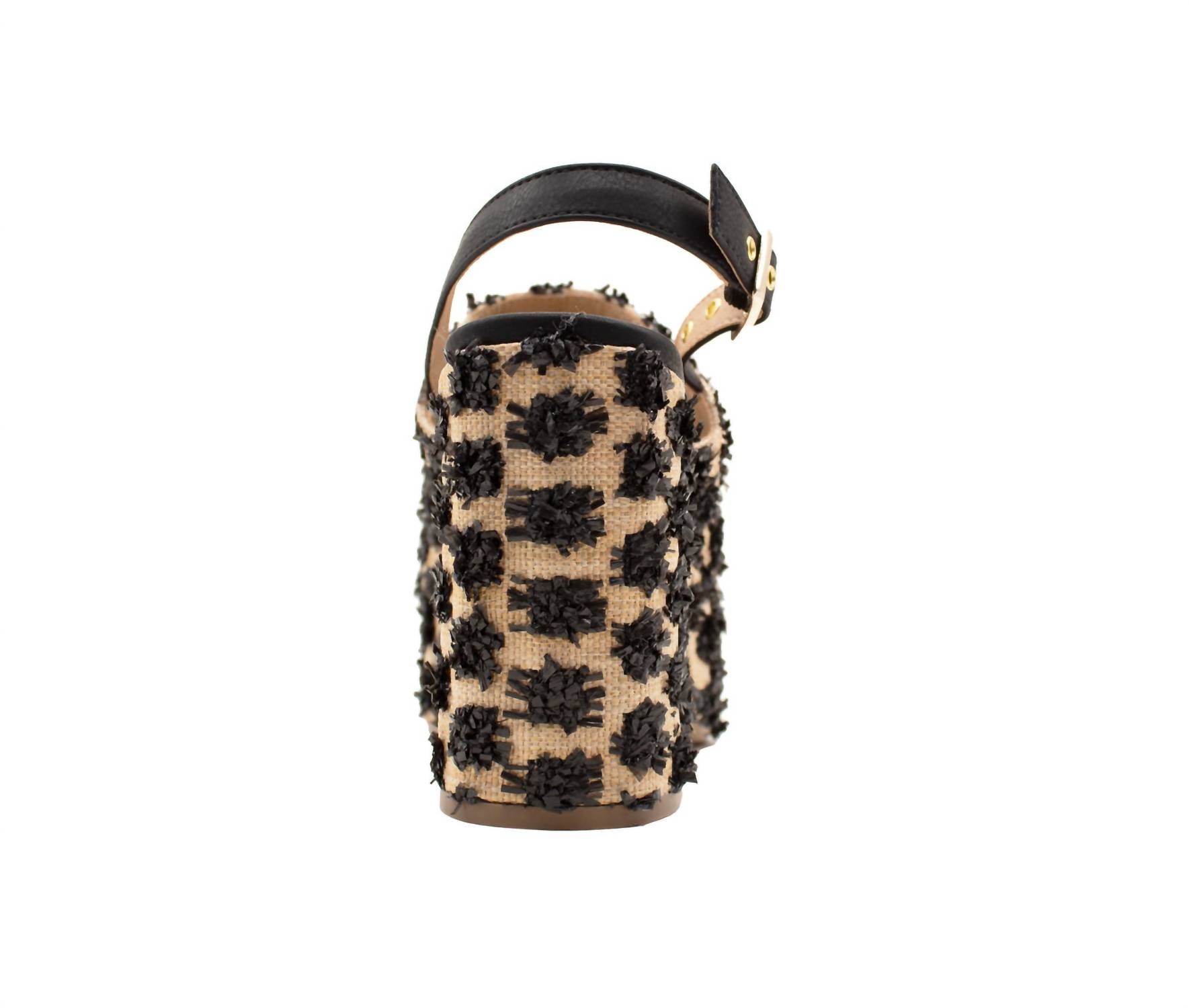 Classicly cute and all-day-wearable. We love this sandal. Step into boho chic style with the Women's Missoula Sandal by Sbicca, perfect for your next vacation or spring event. These black sandals feature a woven raffia pompom upper with a faux leather strap and a secure metal buckle closure. With a comfortable synthetic lining and padded insole, they offer both style and comfort. The standout design includes a 4" jute-wrapped block heel and 1.5" platform, enhancing any outfit.