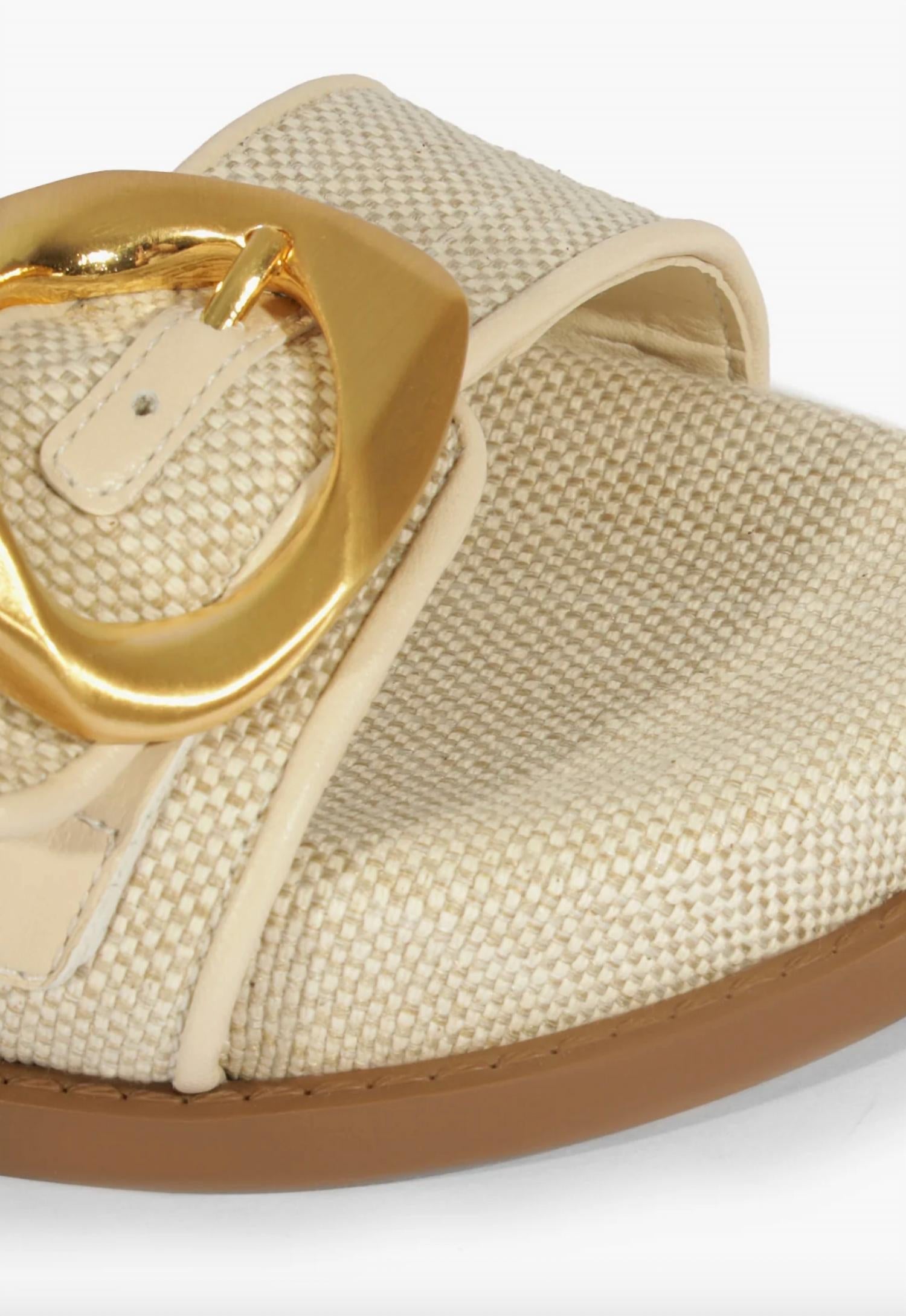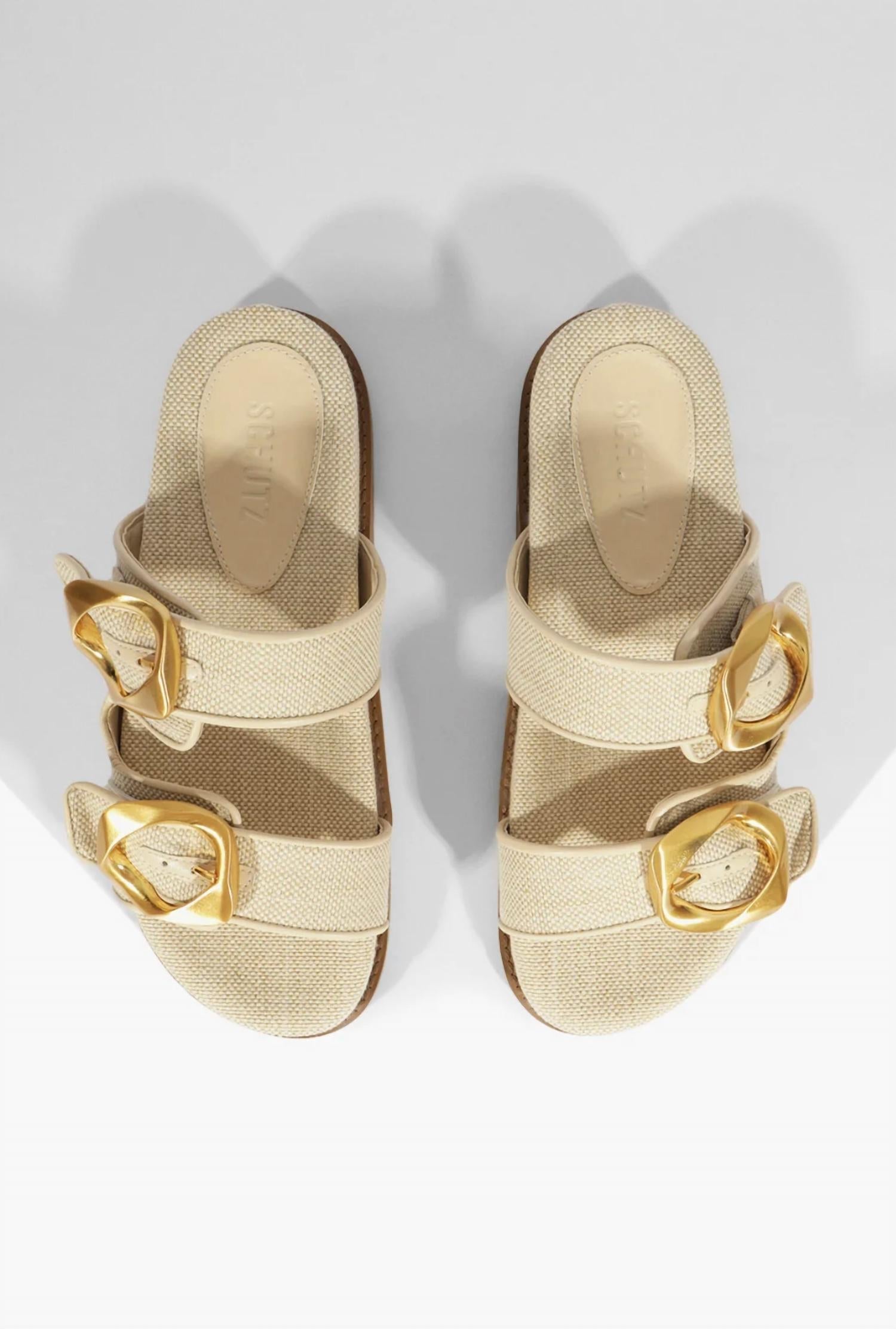 Classicly cute and all-day-wearable. We love this sandal. Step out in style with the Olga Sporty Sandal by SCHUTZ, perfect for adding a chic edge to your casual ensembles. Featuring a luxe gold buckle closure, these sandals in Oyster are an elevated essential with a trendy 90s flair. Crafted with a fabric upper and leather outsole, the open round toe and low 1.1-inch (30 mm) flatform heel make them comfortable for all-day wear. Ideal for spring outings, easily pair them with anything from joggers to a slip dress.