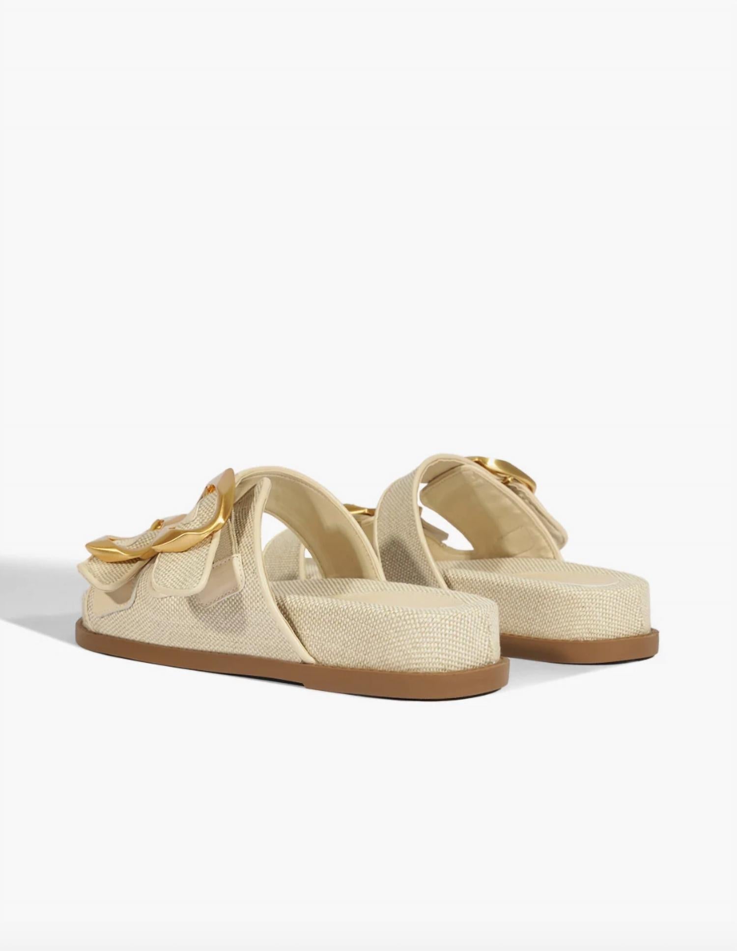 Step out in style with the Olga Sporty Sandal by SCHUTZ, perfect for adding a chic edge to your casual ensembles. Featuring a luxe gold buckle closure, these sandals in Oyster are an elevated essential with a trendy 90s flair. Crafted with a fabric upper and leather outsole, the open round toe and low 1.1-inch (30 mm) flatform heel make them comfortable for all-day wear. Ideal for spring outings, easily pair them with anything from joggers to a slip dress.