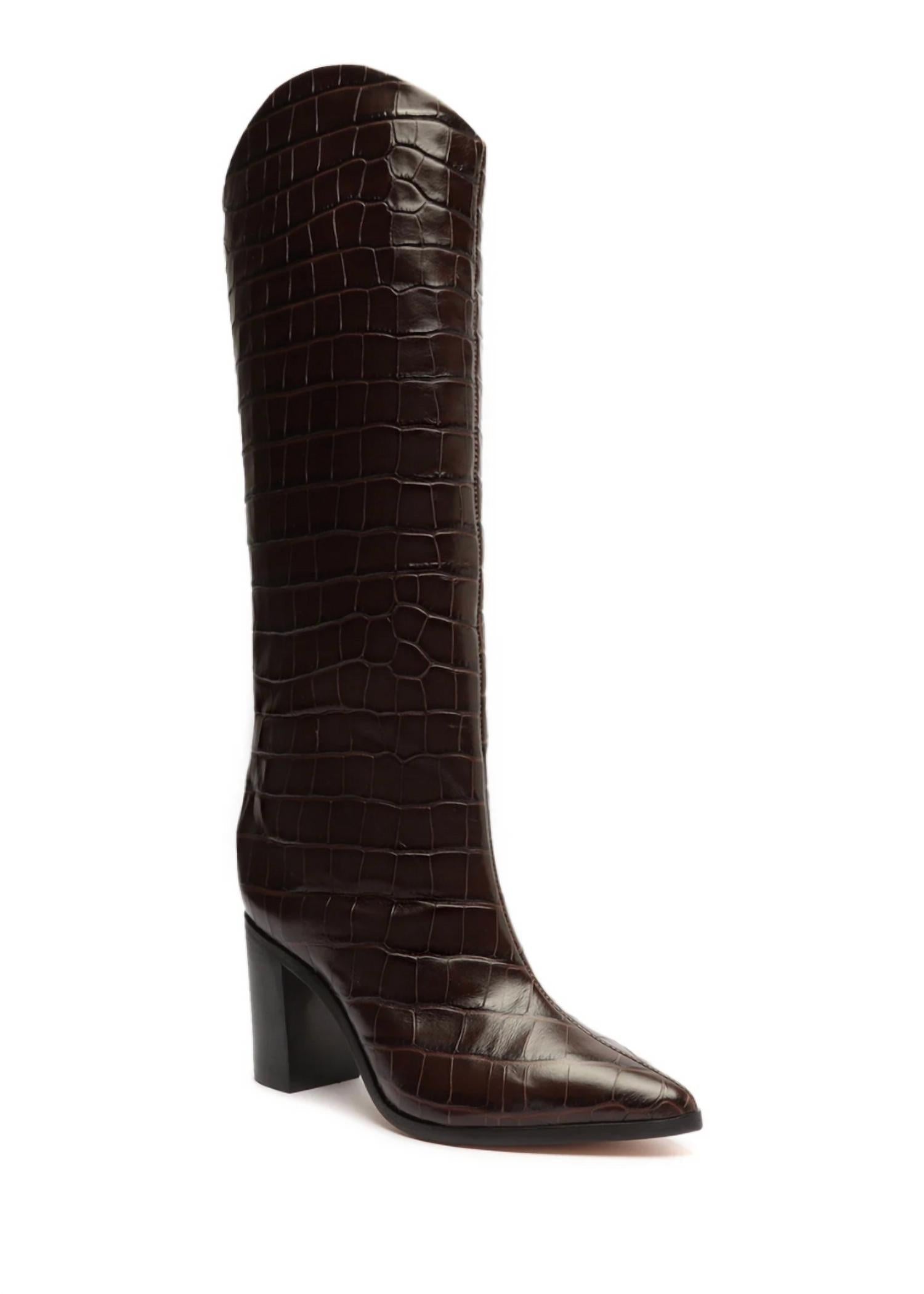 Step out in confidence and showcase your impeccable taste with these fashionable and versatile boots. Their classic style will have you reaching for these boots season after season. Step up your style with the SCHUTZ Women's Maryana Block Heel Boots in a sophisticated chocolate hue. These heeled boots boast a striking pointy toe and a knee-high design with a 3-inch block heel, providing both height and comfort. Made with a luxurious leather upper and leather sole, these boots have a synthetic lining for added durability. Proudly crafted in Brazil, they feature a 16-inch shaft and a 15-inch calf circumference, perfect for the fashion-forward woman seeking elegance and quality.