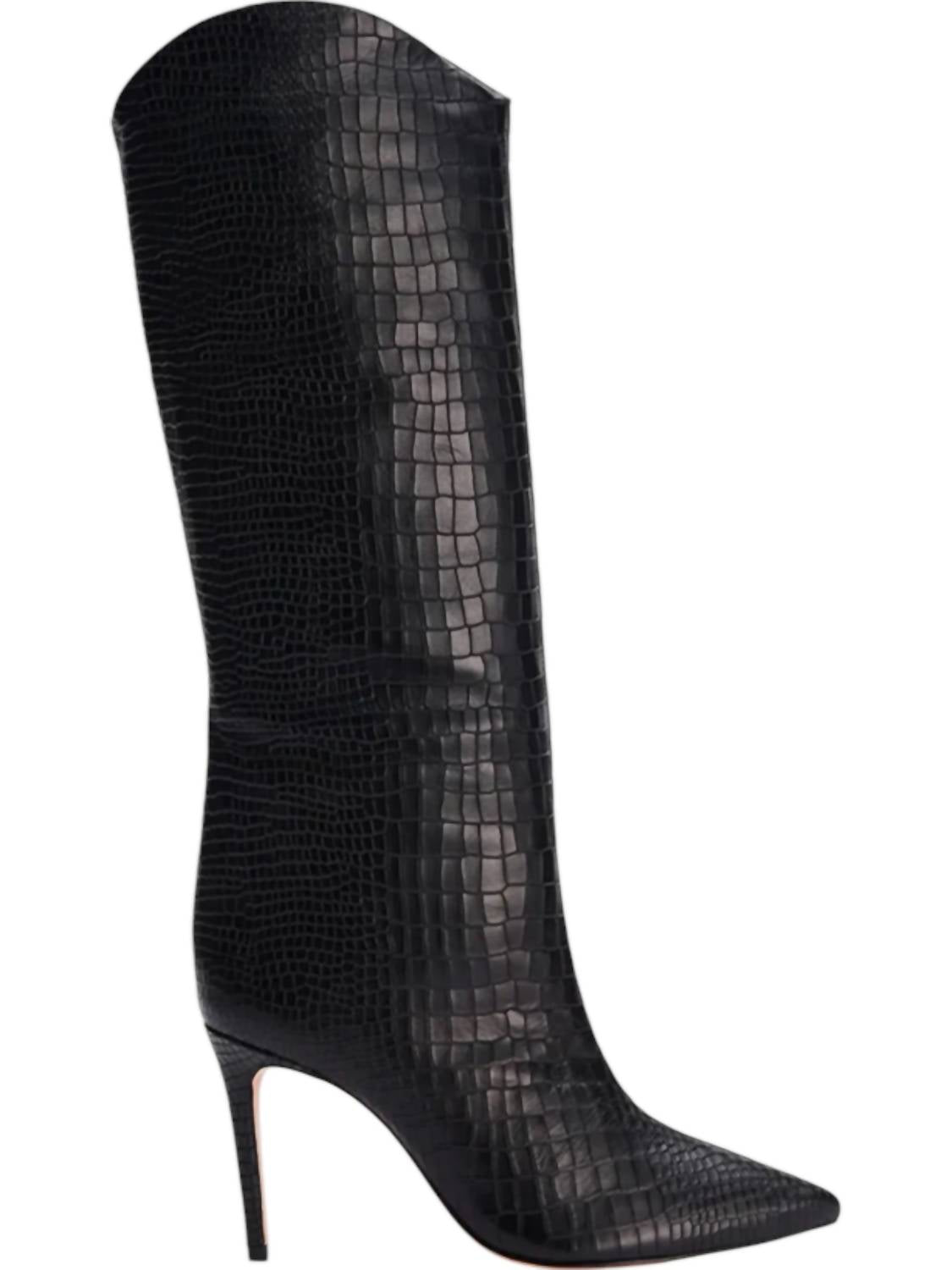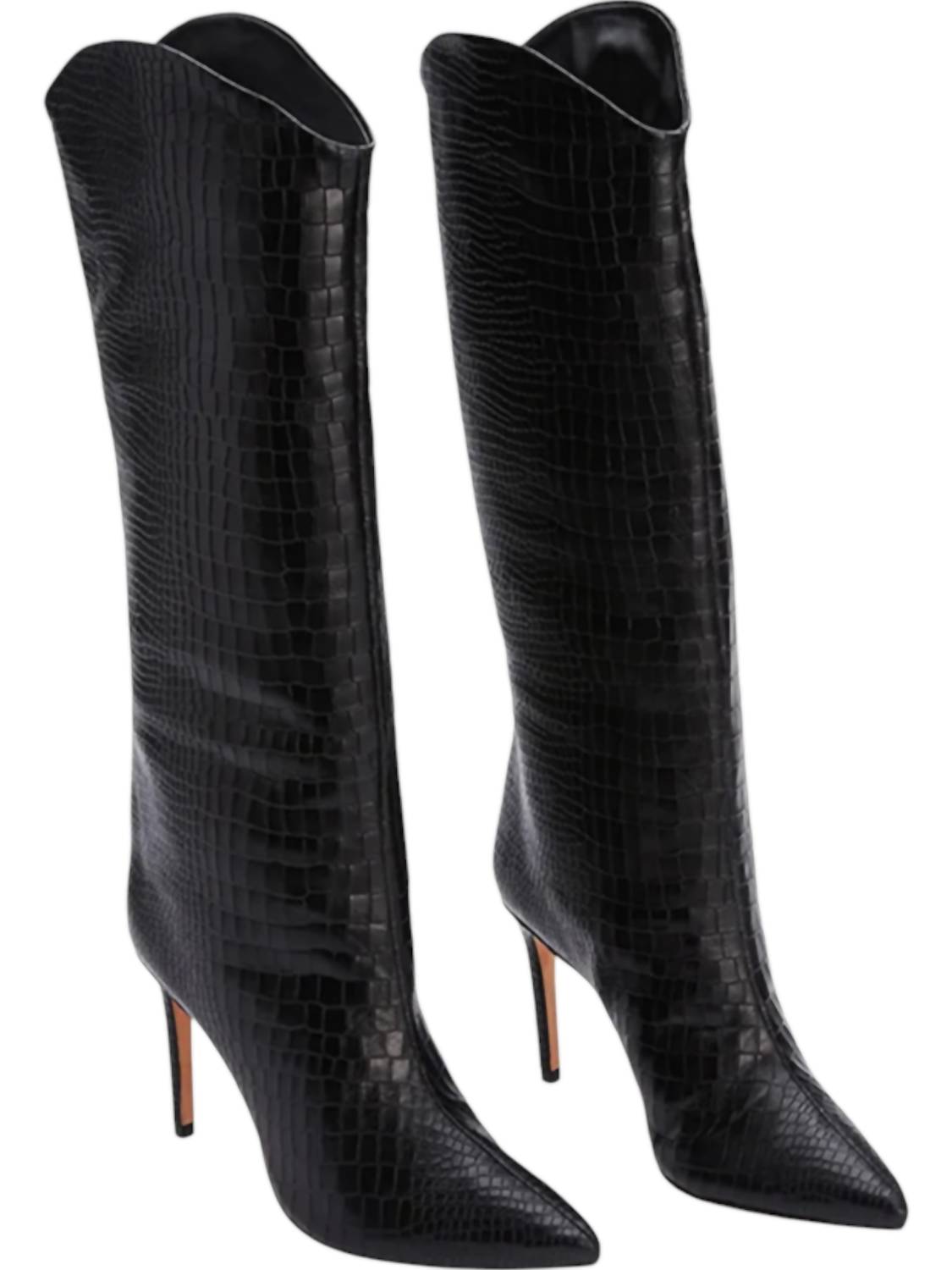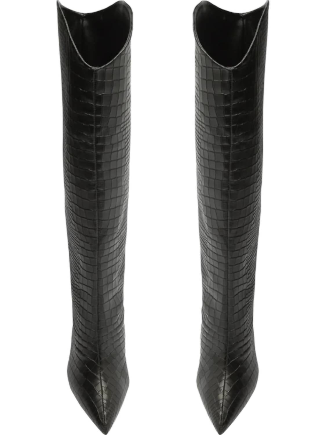 Sleek style meets luxury. Crafted from black crocodile-embossed leather with a cow leather lining and outsole. Knee-high boots elevate any outfit. Featuring a high stiletto heel with a rubber patch at the heel. Ensure both elegance and comfort. With a slip-on closure, pointed toe, closed counter, and a shaft circumference of 14.5 inches. Blend timeless allure with contemporary design.
