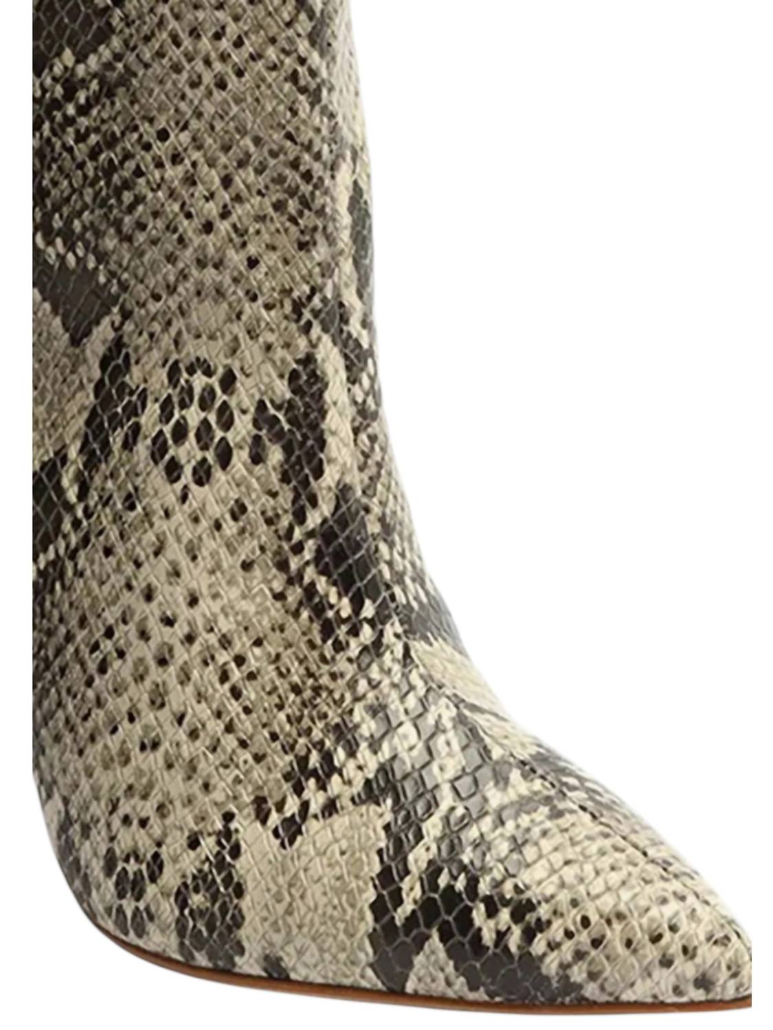 Step into elegance with the Maryana Snakeskin Printed Boot by SCHUTZ, designed for the fashion-forward woman. This stunning boot features a pointed toe and a high 3.5-4 inch stiletto heel, crafted from sophisticated high-quality snakeskin-embossed leather, while the leather sole ensures durability. The side zip closure offers easy access, complemented by an 8 inch shaft height and a 13 inch leg opening for added comfort. With an inner lining of cow leather, this knee-high boot in cream and black is perfect for elevating your Fall New Year's Eve ensemble or engagement outfit.