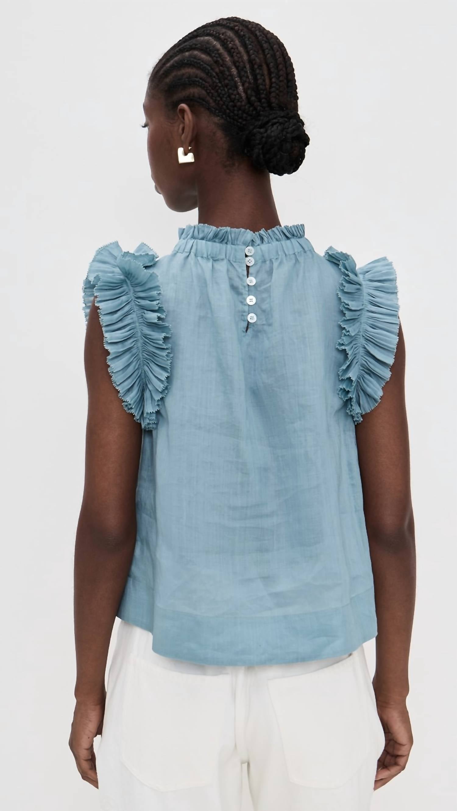 Pair this with your favorite jeans and slides for your next girls night out. Discover the Anise Flutter Sleeve Top by SEA, a chic addition to your wardrobe in the elegant SEA Blue. With its sleeveless design and flutter sleeves, this blouse features a ruffle mockneck and gathered details for a graceful aesthetic. Crafted from 100% Ramie, it boasts a classic fit with a back button closure, measuring 20.75 inches in length, perfect for versatile styling. Care for this refined piece by opting for dry cleaning.