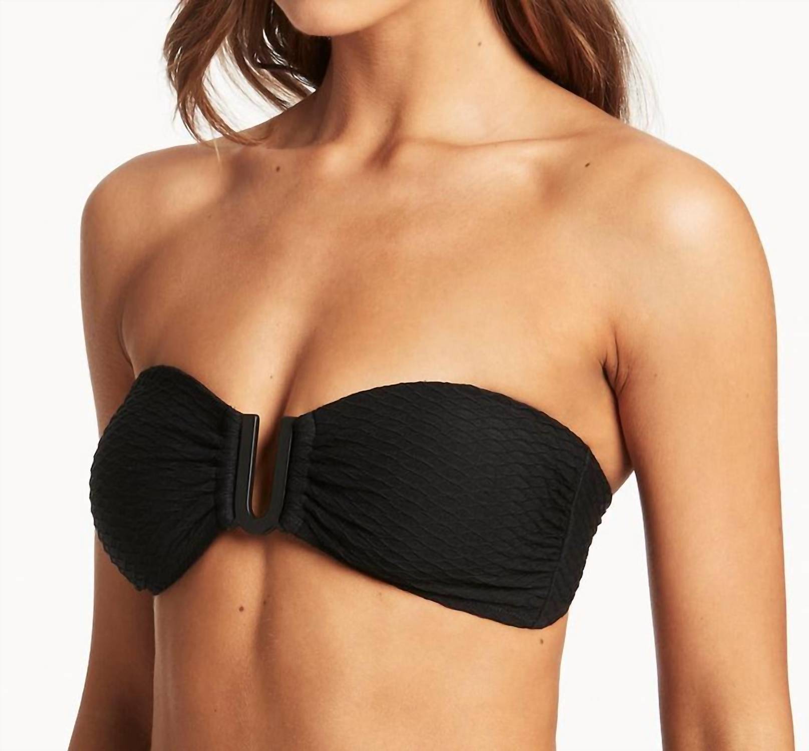 Dream of your next beach getaway in this cute little number. Pair with strappy sandals, a floppy hat, and an oversized tote to complete the perfect vacation look. Discover the Honeycomb U Bar Bandeau Bikini Top by Sea Level Australia, a chic swim top in timeless black. This bandeau style features adjustable, convertible, and removable straps for the perfect fit, alongside side boning and powermesh lining for enhanced shape and support. Crafted from 73% Polyester and 27% Elastane, it includes removable soft cups for added versatility and comfort. Closure: Back clip. Care: Hand wash. Perfect for a minimalist beach day look.