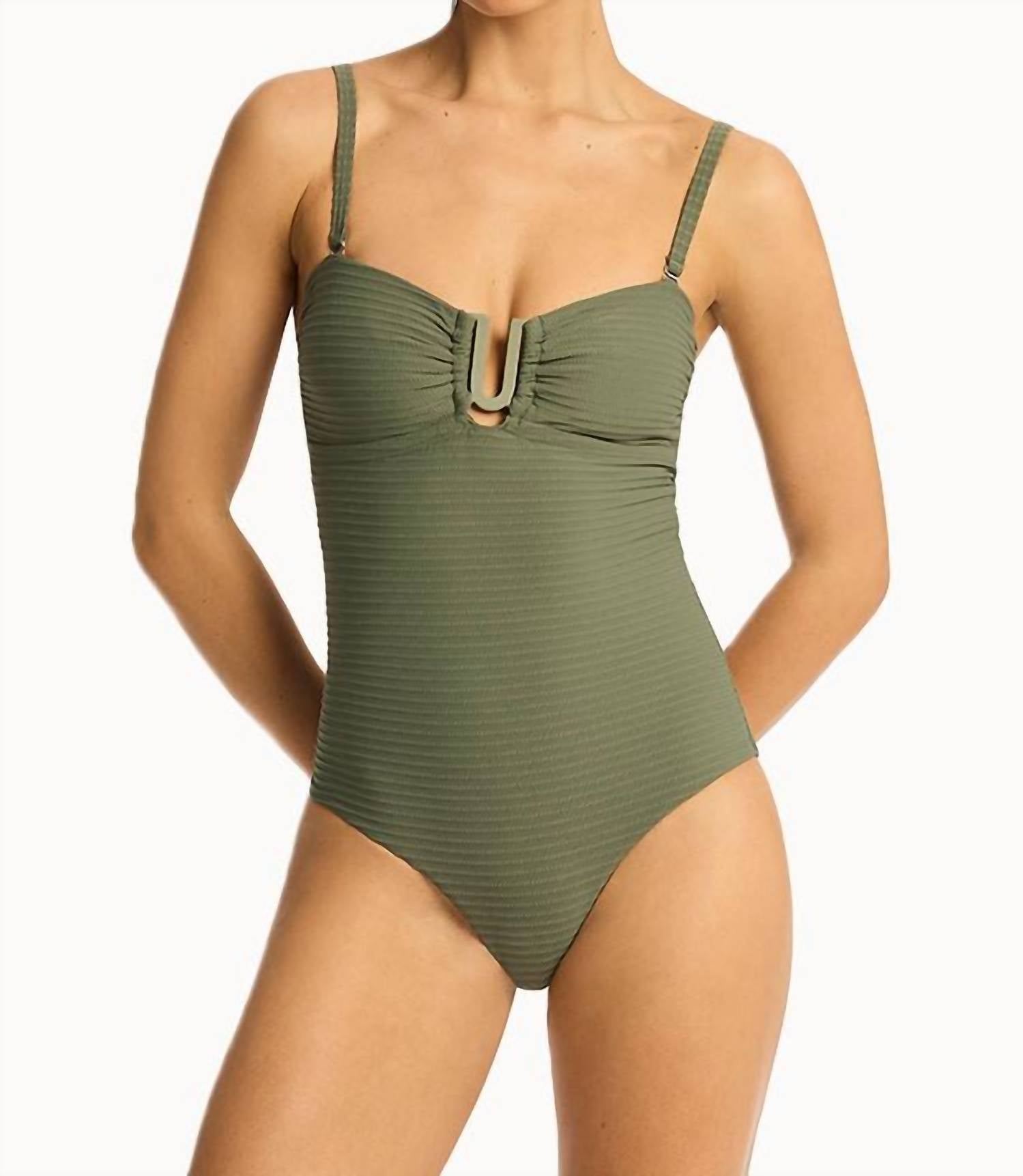 A one piece so chic you could even wear it as a bodysuit with your favorite pair of jeans. The Spinnaker U Bar Bandeau One Piece Swimsuit by Sea Level Australia is a sophisticated swimwear choice in khaki. Crafted from 84% Nylon and 16% Elastane, it features a bandeau neckline with U-bar front detail, ensuring a multi-fitting bust design ideally suited for B-D cups. This figure-flattering piece includes side boning for added structure, removable cups, and optional adjustable straps for versatility. With a textured finish, it offers classic coverage, perfect for a minimalist summer beach day. Care: Hand wash only.