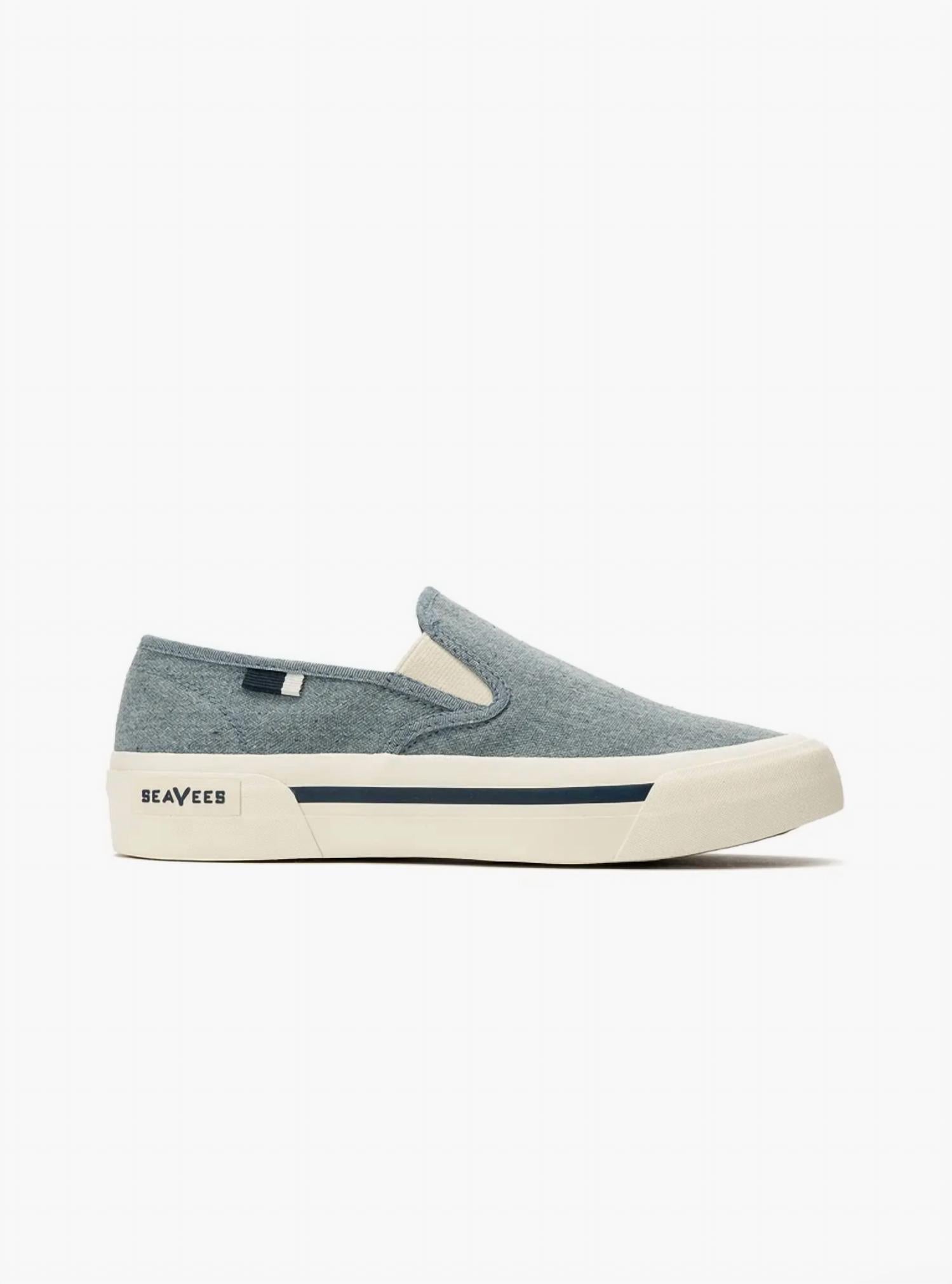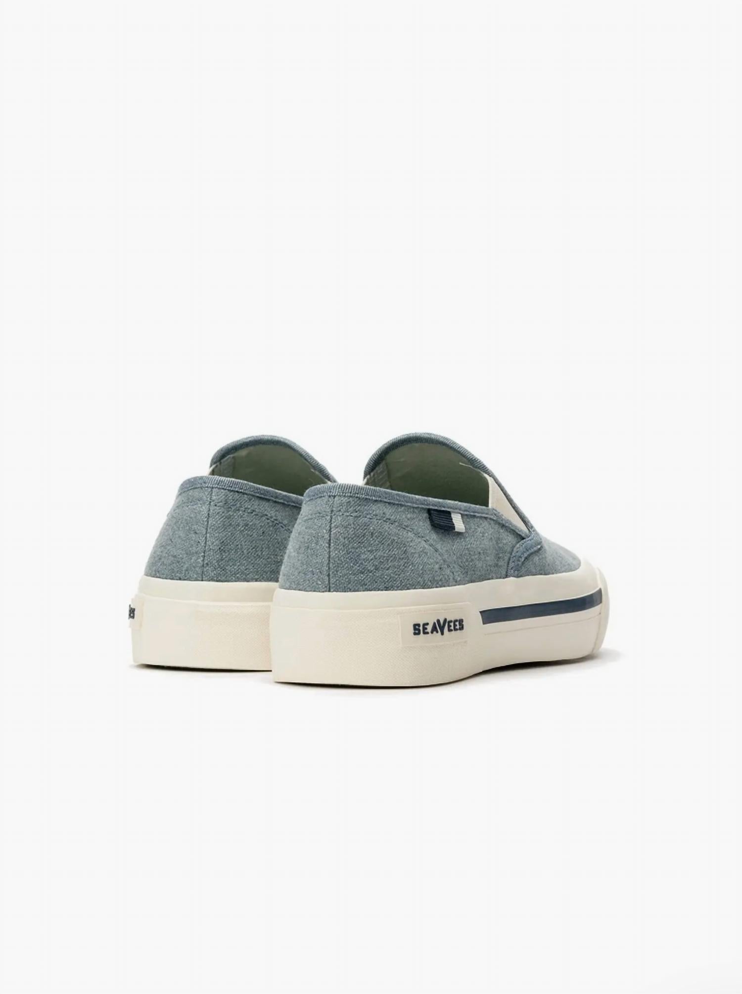 Cute, functional, and comfortable. These sneakers check all the boxes.Jump into the blue on the SeaVees Seachange Slip On – Blue Water! This women's sneaker is crafted from recycled denim and features a cushy memory foam footbed with cooling airflow channels, plus a “power grip” outsole made from natural and recycled rubber, all consciously created with a time-honored vulcanization process.