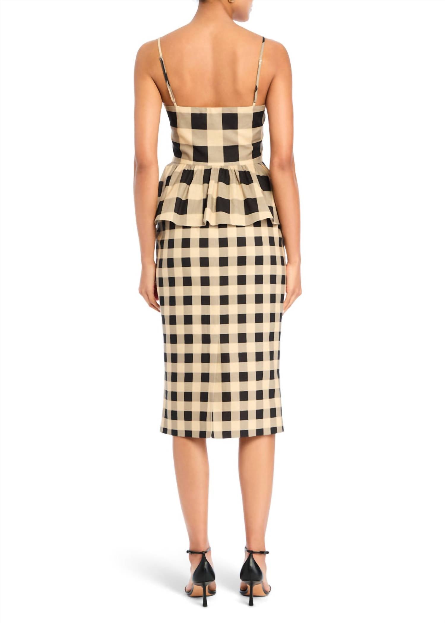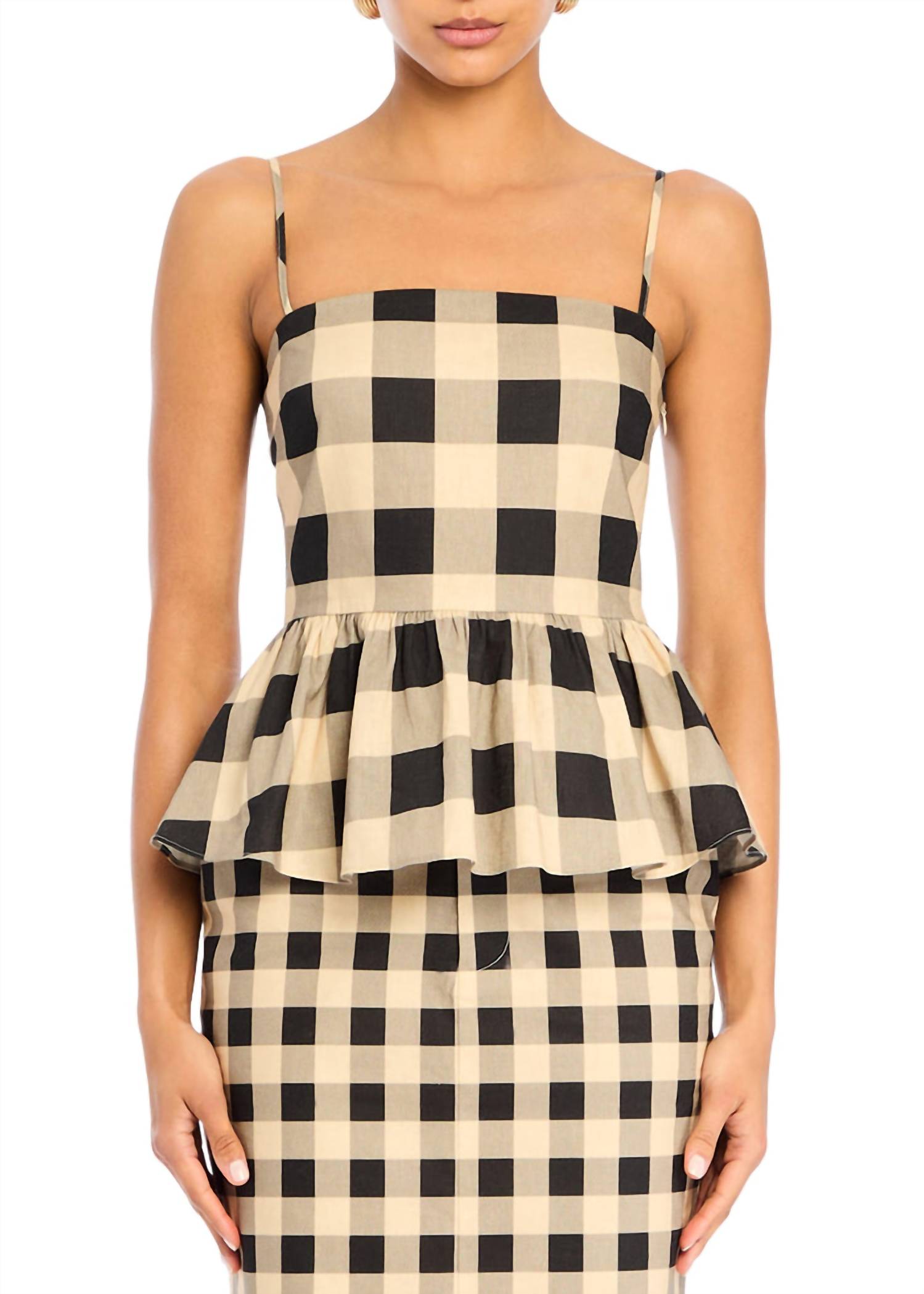 Throw this on with your favorite blazer for a more polished look. Elevate your summer wardrobe with the Ara Linen Top by SER.O.YA, presented in a striking Bold Gingham pattern. This peplum-style top features a sleek square neckline complemented by adjustable spaghetti straps, offering a flattering fit. Crafted from a linen blend (55% Linen, 45% Cotton), it boasts a side zipper closure for easy wear. Made in China, this vintage-inspired piece is perfect for a chic dinner party look.