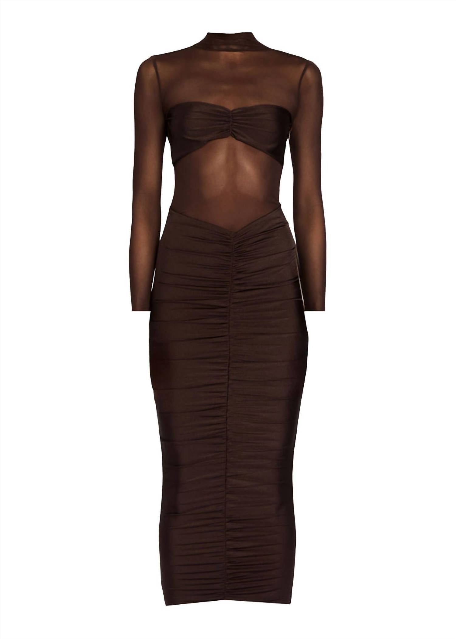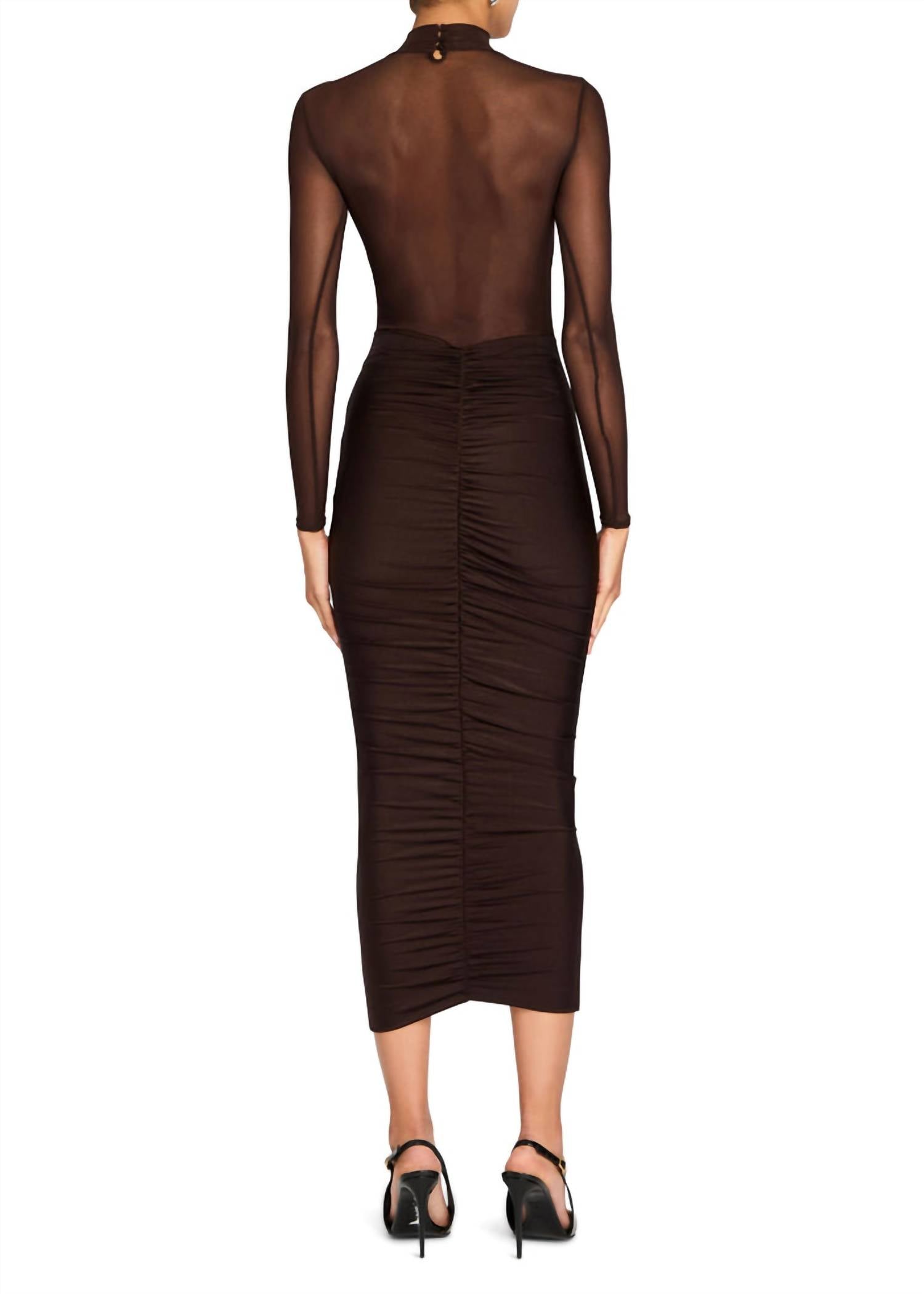 The perfect length dress does exist. Introducing the Levina Mesh Midi Dress by SER.O.YA in vibrant Malibu Pink, perfect for making a statement at any evening event. This bodycon silhouette features long sleeves and a chic mockneck, crafted with a luxurious nylon blend composition of 90% nylon and 10% spandex. With a concealed side zipper closure for a seamless fit, this dress showcases sheer mesh knit panels, offering a modern twist on 90s fashion trends. Made in China, care for this wardrobe staple by hand washing it to maintain its stunning look. Garment length is 53.93 inches.