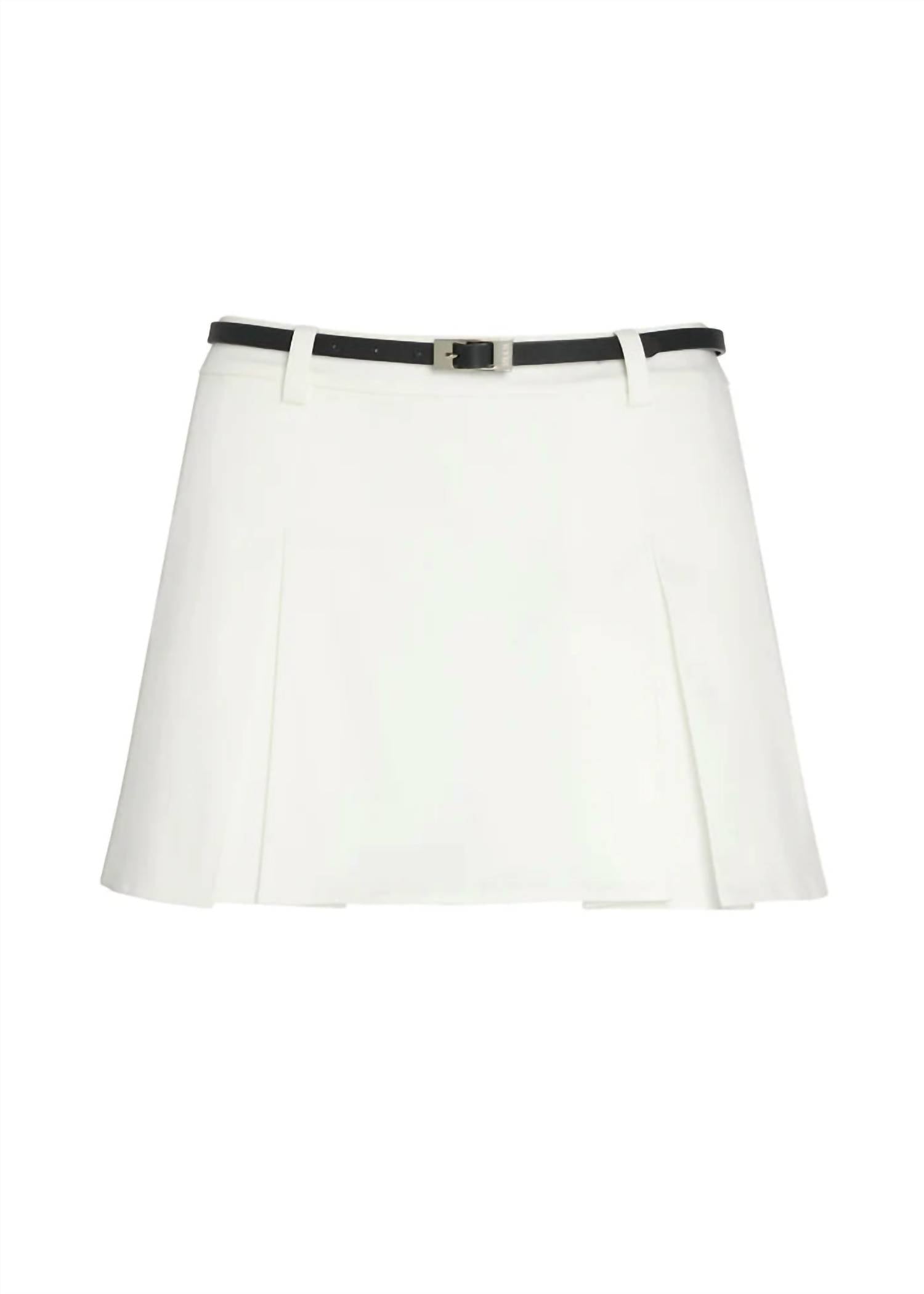 Introducing the Tash Poplin Skort by SER.O.YA, a minimalist summer essential in crisp white. This pleated mini skort, crafted from a 97% cotton and 3% spandex blend, features a trendy removable belt and a practical zip closure. Embrace effortless style at any holiday party or Fourth of July celebration with this solid-patterned piece. For care, simply machine wash.