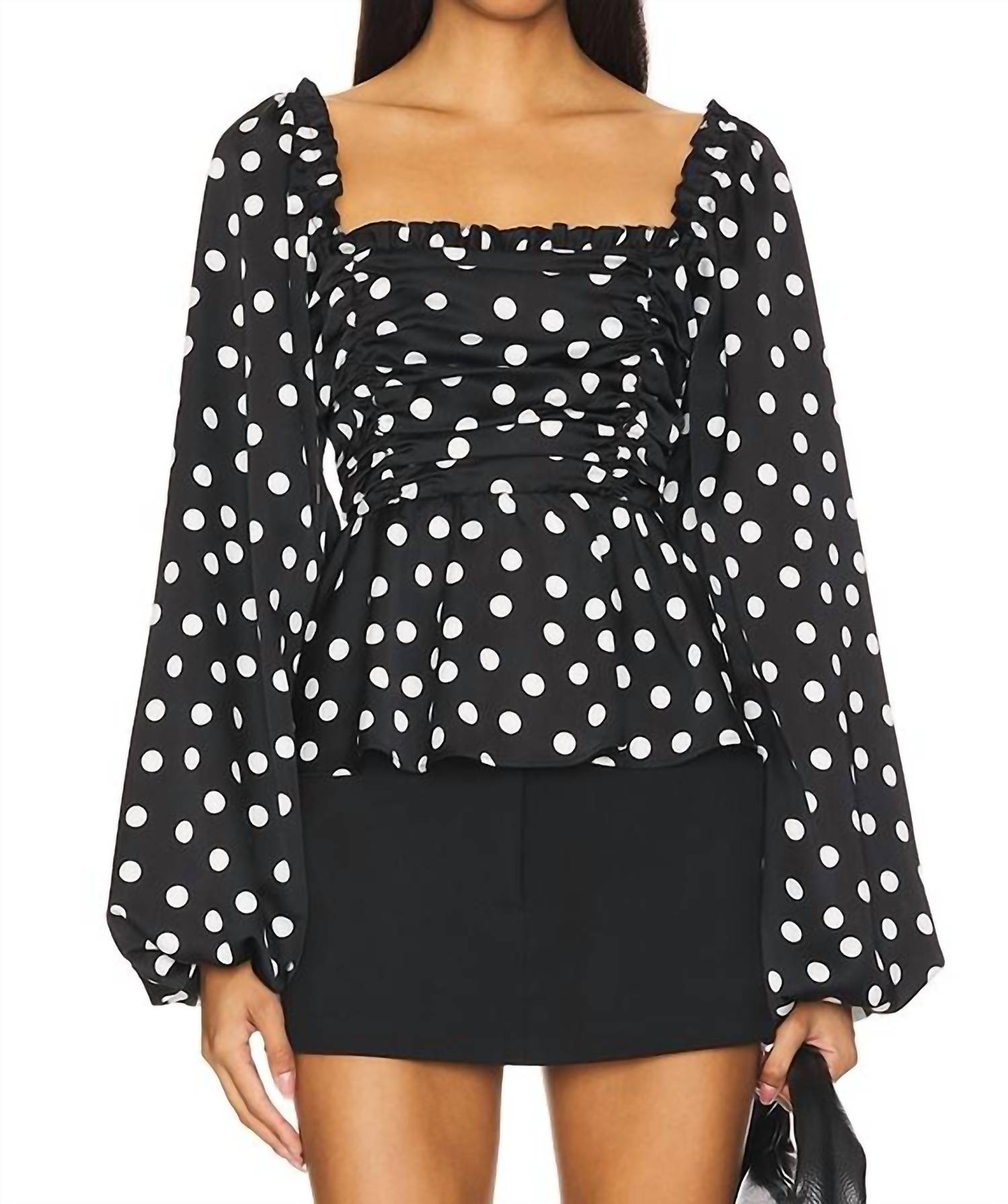A versatile blouse that works from desk to dinner! Step into romance with the Atiana Top by Show Me Your Mumu, crafted in a silky satin fabric with a polka dot pattern. This black blouse boasts long balloon sleeves and an off-the-shoulder neckline, complete with elastic cuffs and shoulders for a comfortable fit. Made from 100% polyester in the USA, it features a smocked back and a convenient pull-on style. Care for it by hand washing cold to maintain its dreamy allure.