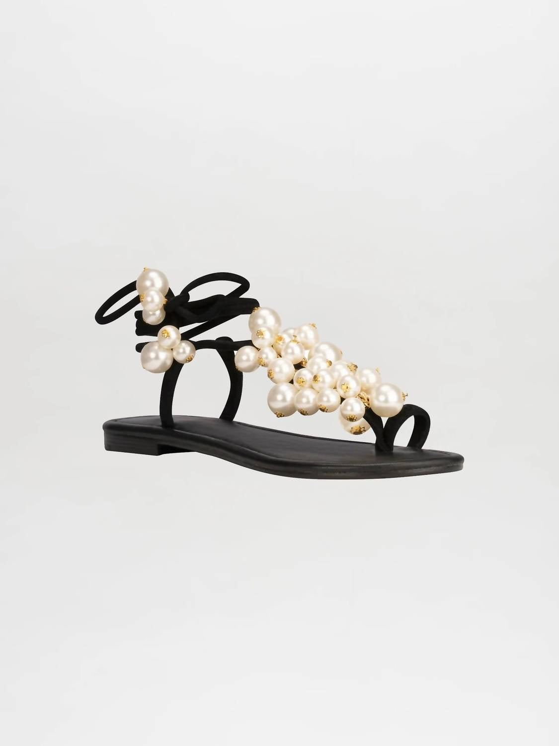 Flowy dresses, cropped pants, and even jumpsuits... this sandal works with them all! Step into elegance with the Women's Zaira Sandals by Silvia Tcherassi, a perfect blend of sophistication and boho chic style. Crafted from 100% leather, these black sandals feature pearl embellishments and wrap-around ankle straps for a secure and fashionable fit. Made in Indonesia, the flat heel offers comfort, making them ideal for spring vacations or any leisurely occasion. Elevate your wardrobe with these open-toe beauties that epitomize understated luxury.