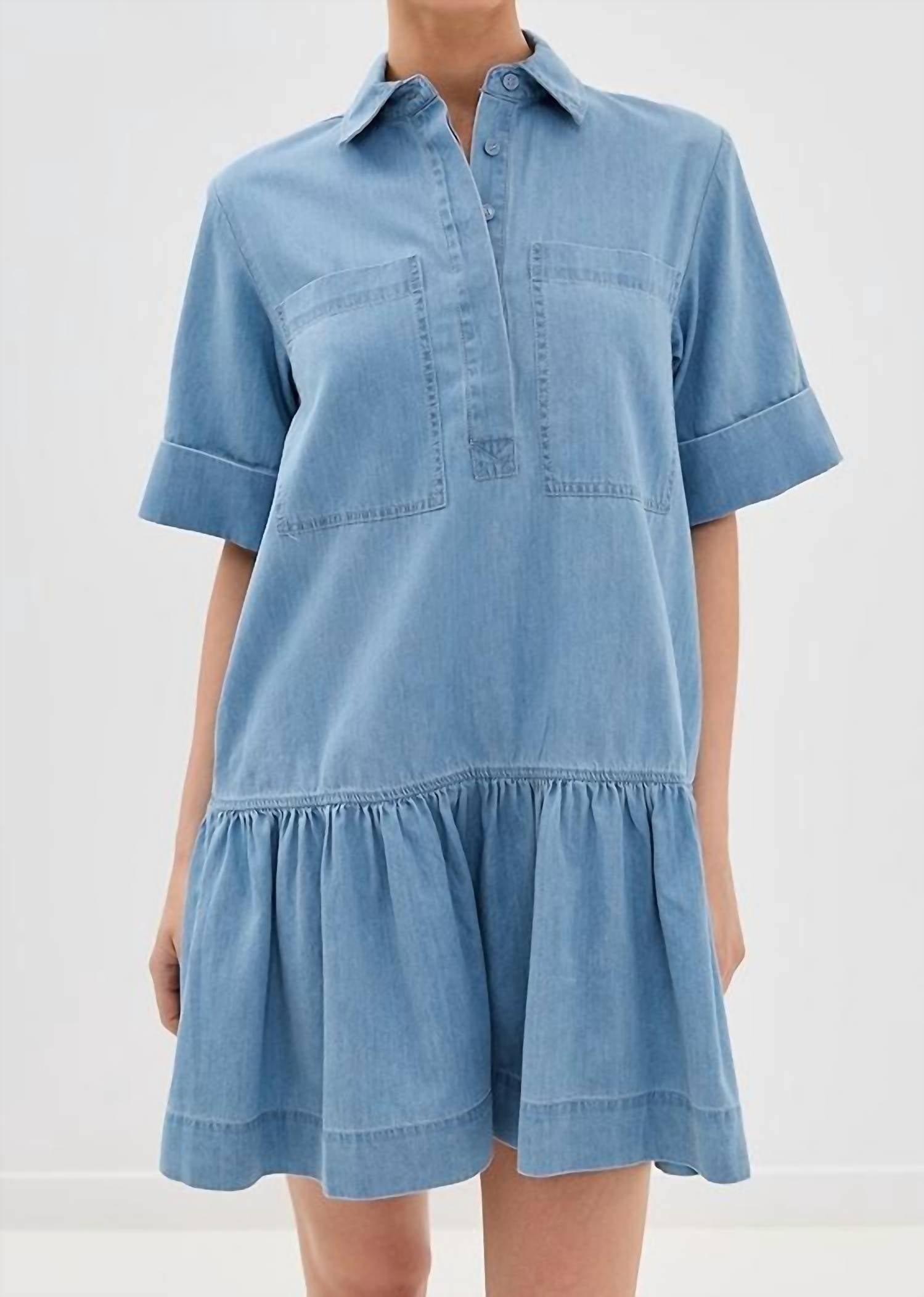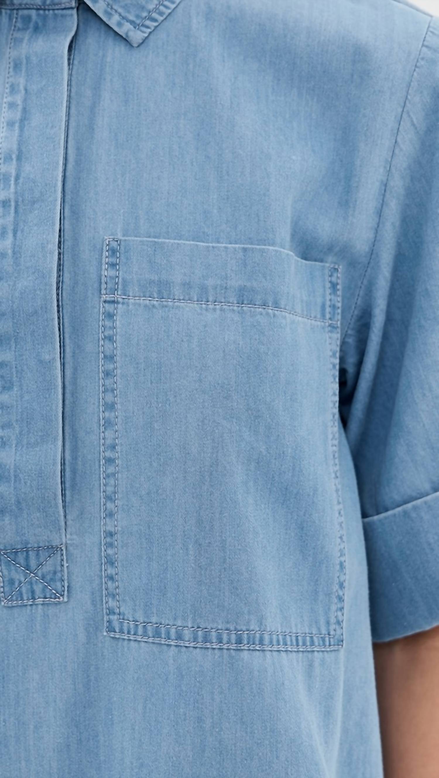 A short and breezy dress for those warmer days. Elevate your wardrobe with the SIMKHAI Cris Shirt Dress in Stratus, a charming mini dress perfect for any occasion. This piece features elbow sleeves and is crafted from 100% cotton, offering a lightweight and comfortable fit. Made in China, the dress showcases a structured collared shirt design with a button front closure and handy patch and slip pockets. For best results, dry clean this shirt dress to maintain its elegance.