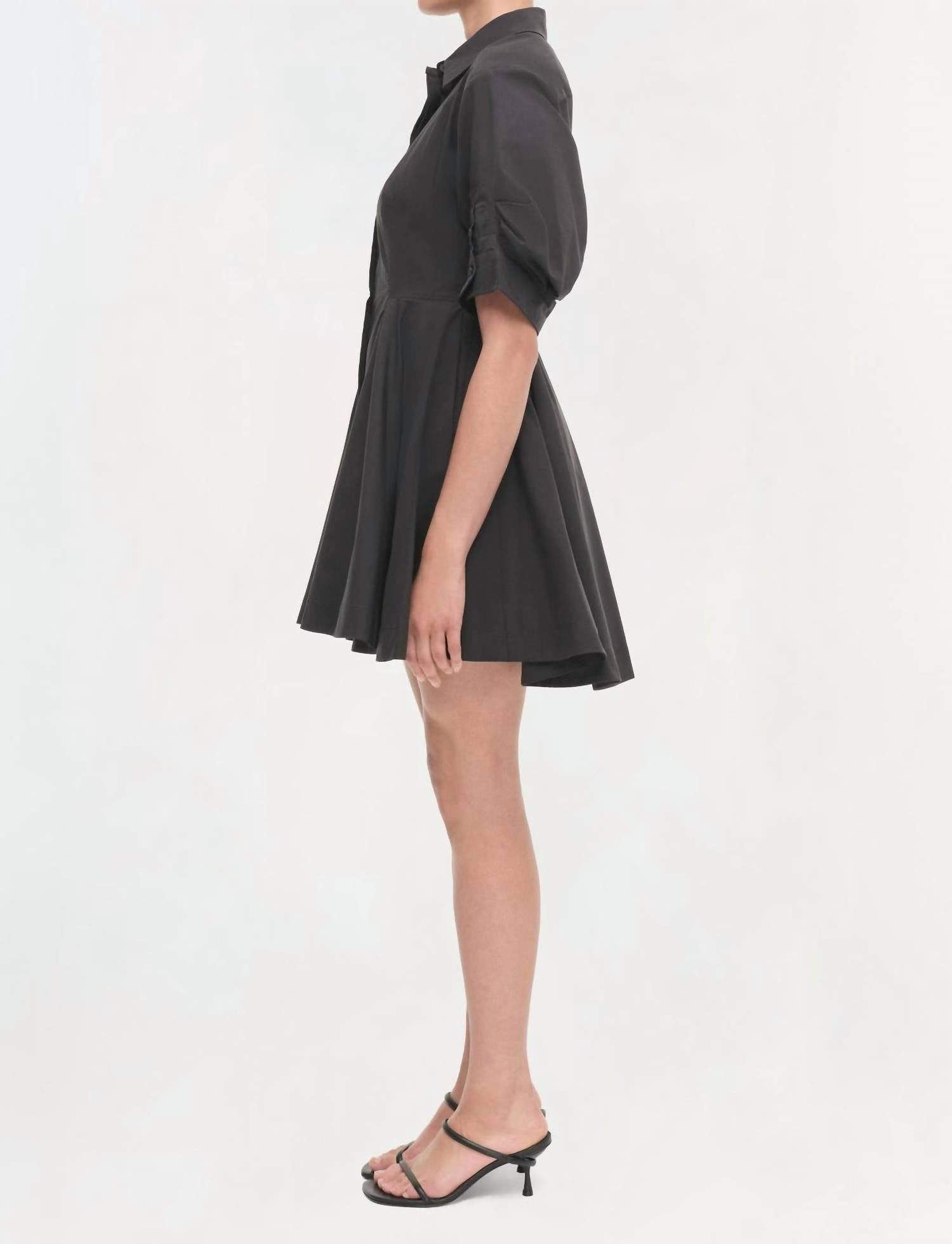 A short and breezy dress for those warmer days. Elevate your wardrobe with the SIMKHAI Jazzie Mini Dress, a sophisticated choice in timeless black. This A-line dress features elbow-length sleeves and a stylish collar, crafted from a blend of 63% cotton and 37% polyester for a comfortable fit. Designed with practicality in mind, it includes button front closures and functional pockets. Care is easy with a cold machine wash, allowing you to maintain its chic look effortlessly. The fully imported Jazzie Mini Dress showcases a solid pattern, perfect for making an understated yet elegant statement. Model is 5'10" and wearing size 2.