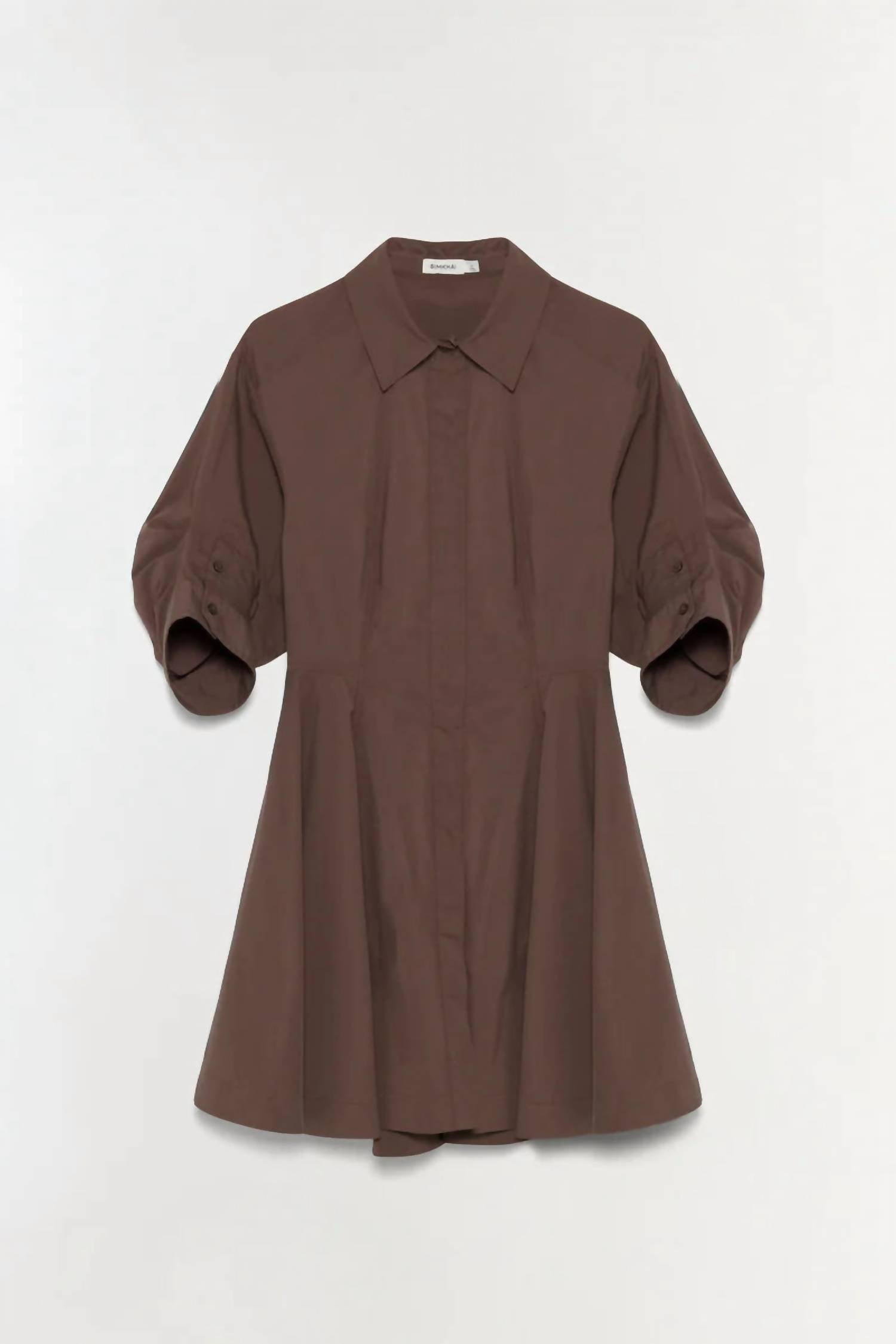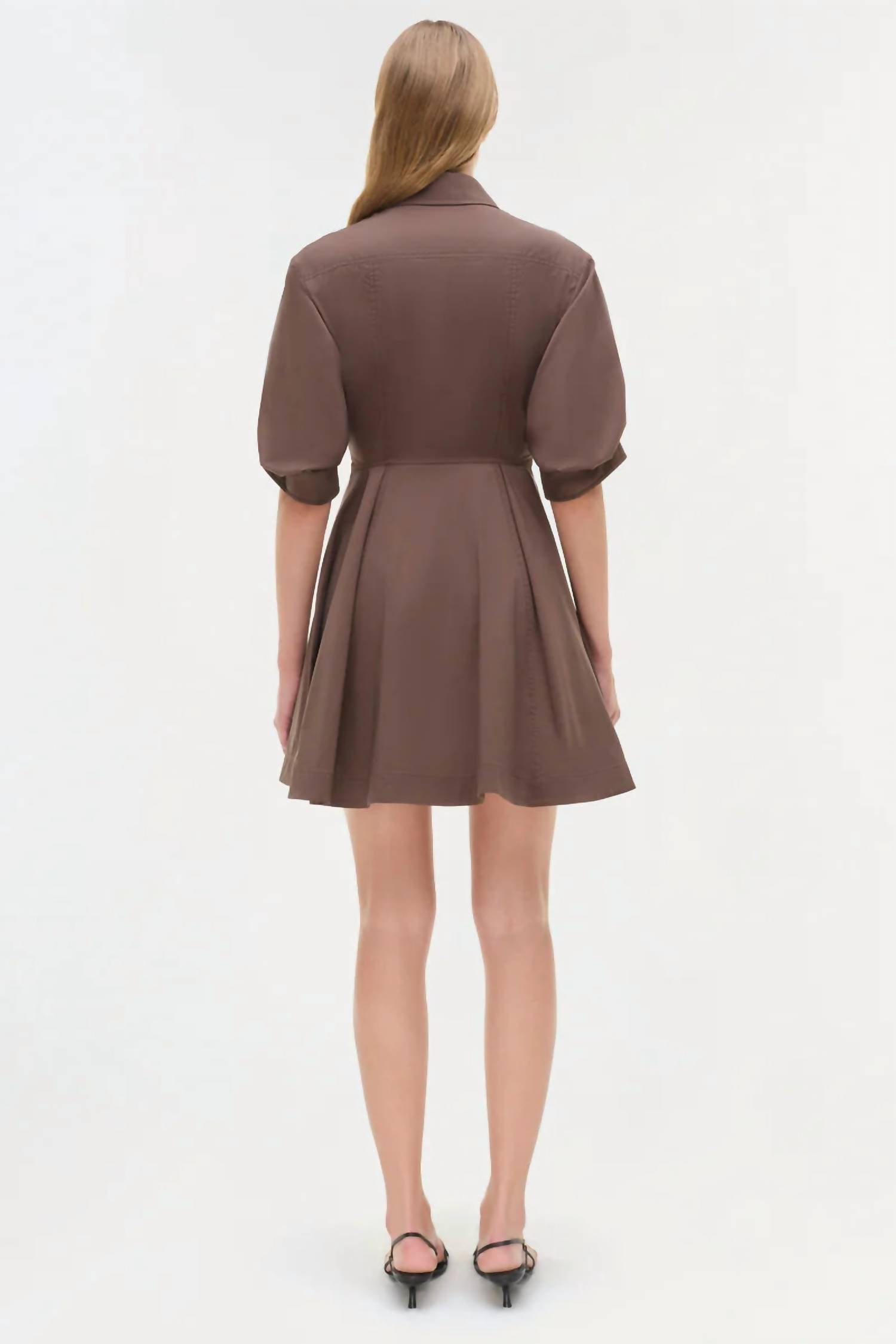 The perfect mini dress for those warmer months. Discover the Jazzie Short Sleeve Mini Dress by SIMKHAI, a chic choice for your fall wardrobe in a monochrome chocolate hue. This mini shirtdress features elegant elbow sleeves and a stylish covered button closure. Expertly crafted from 100% cotton, this imported dress promises breathable comfort and sophistication. Care: Machine wash or dry clean for best results.