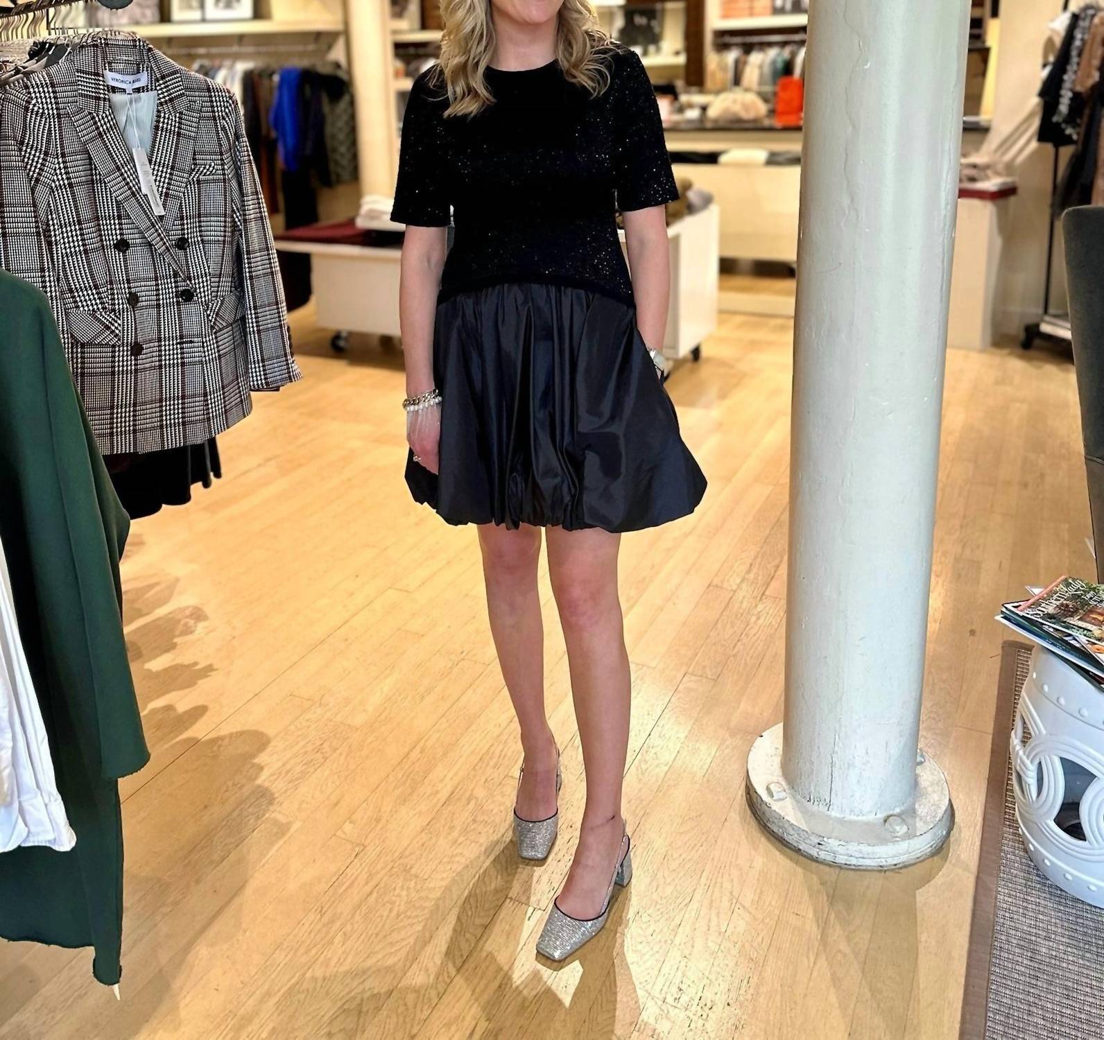 The kind of easy and flattering dress you'll be reaching for all season long. The Kenz Knit Combo Ruffle Mini Dress by SIMKHAI in classic Black offers a playful yet polished aesthetic. This women's mini dress features short sleeves and a fit-and-flare silhouette with a dramatic ruffled skirt. Designed with a crewneck and a textured pattern, it exudes elegance and sophistication. Originating from an unspecified location, this dress does not include closures.