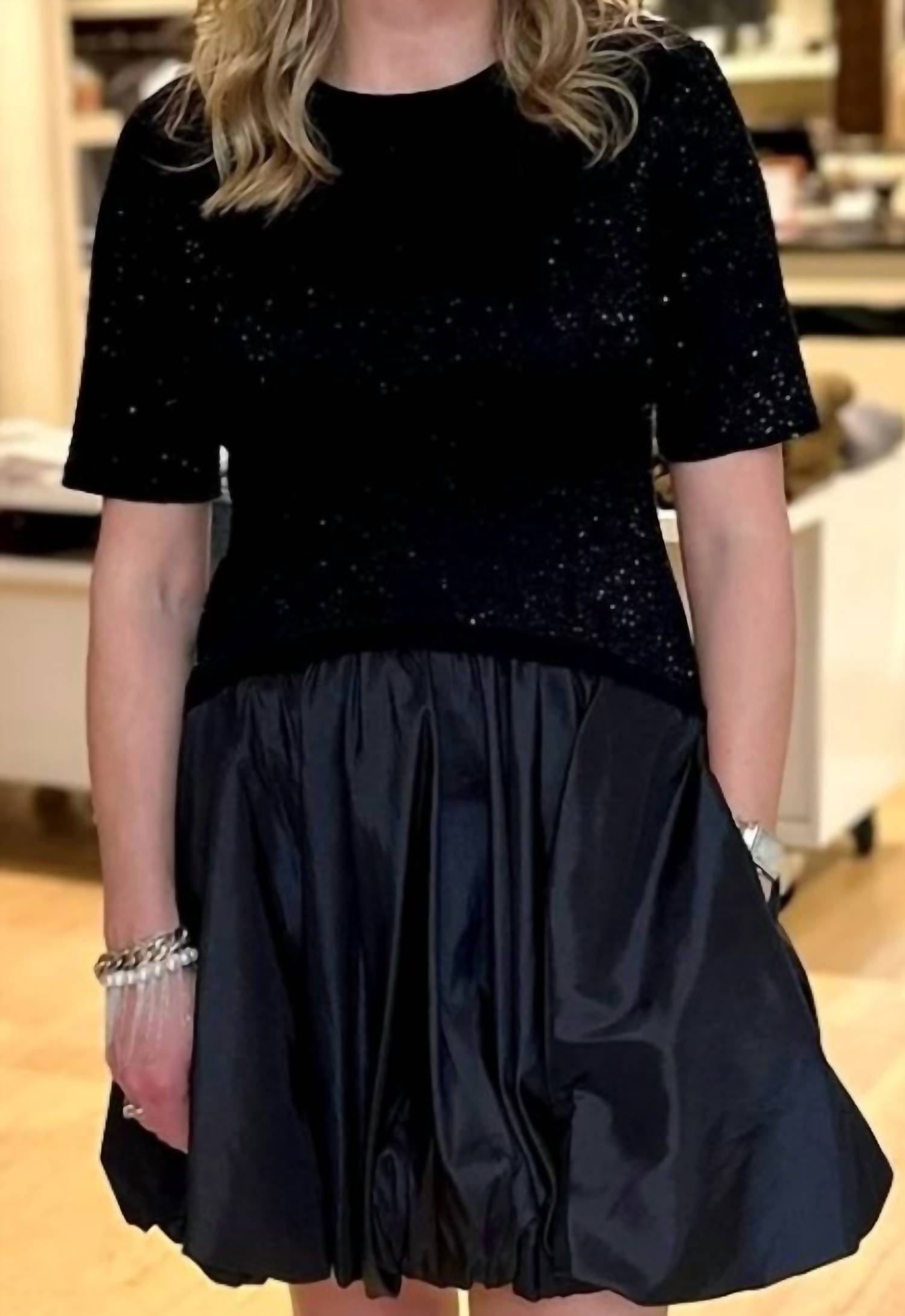 The Kenz Knit Combo Ruffle Mini Dress by SIMKHAI in classic Black offers a playful yet polished aesthetic. This women's mini dress features short sleeves and a fit-and-flare silhouette with a dramatic ruffled skirt. Designed with a crewneck and a textured pattern, it exudes elegance and sophistication. Originating from an unspecified location, this dress does not include closures.