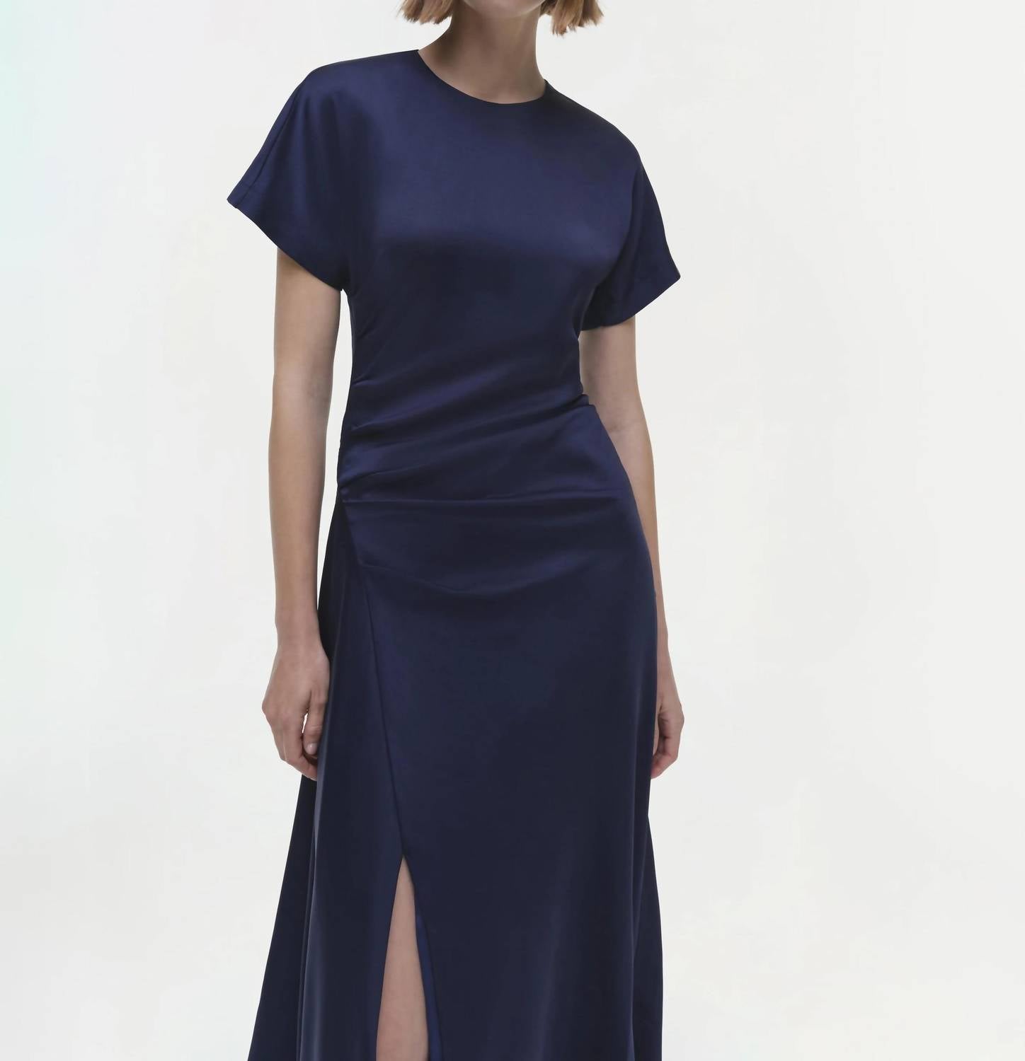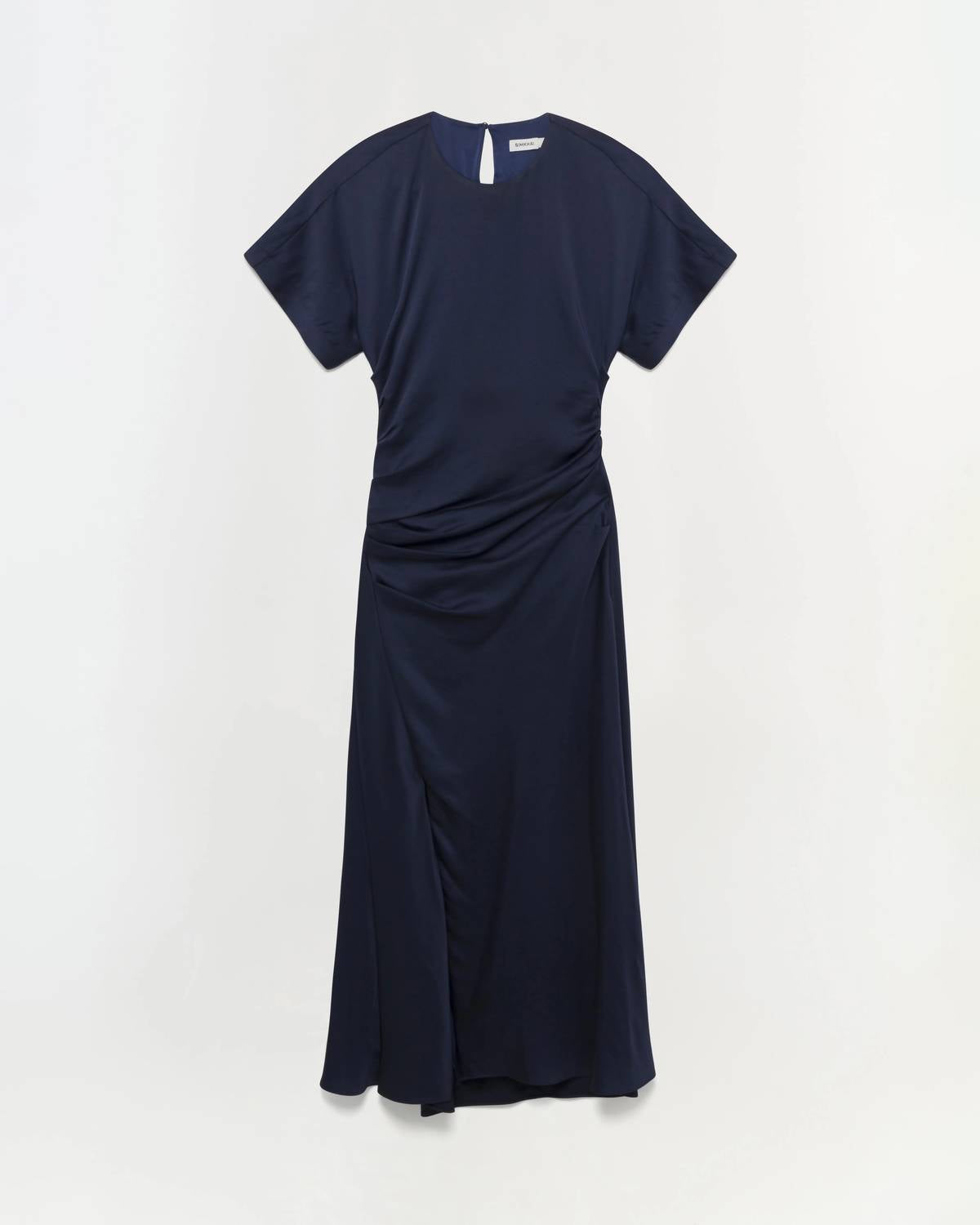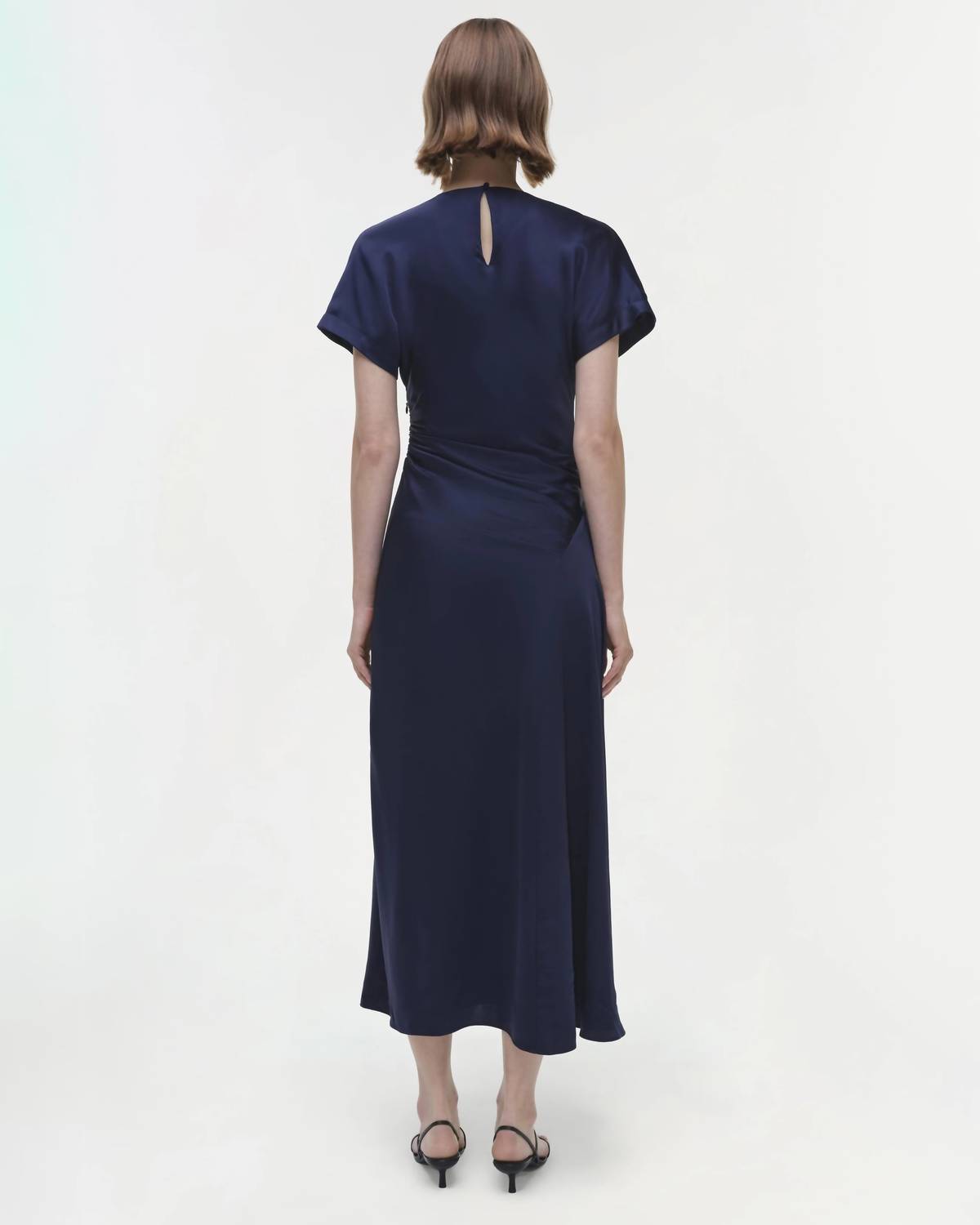 The perfect length dress does exist. Elevate your wardrobe with the Marabella Satin Midi Dress by SIMKHAI in elegant Midnight Blue. Featuring short sleeves and crafted from 84% acetate and 16% polyester, this imported dress offers a timeless sheath silhouette with subtle ruching and a side slit for a graceful finish. It is fully lined with a 100% polyester lining and designed with a convenient side zipper closure.