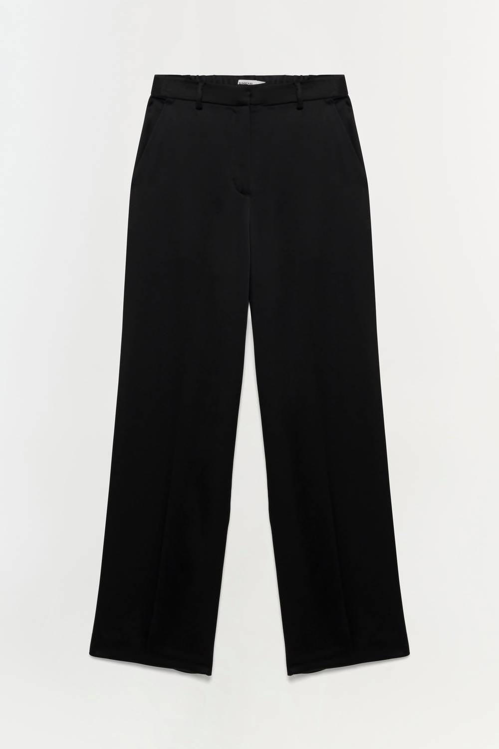 A perfectly tailored straight leg that you'll want in every color! Introducing the Tavar Pants by SIMKHAI in elegant black, perfect for a refined and polished look. These straight-leg pants are constructed from a classic woven satin blend of 89% acetate and 11% polyester, offering a soft sheen. Made in an imported design, the pants feature a high waist with a streamlined button and zipper fly closure, while the pockets add functional style. Care instructions recommend dry clean only, enhancing their luxurious appeal. Model is 5'11" and wearing size 2.