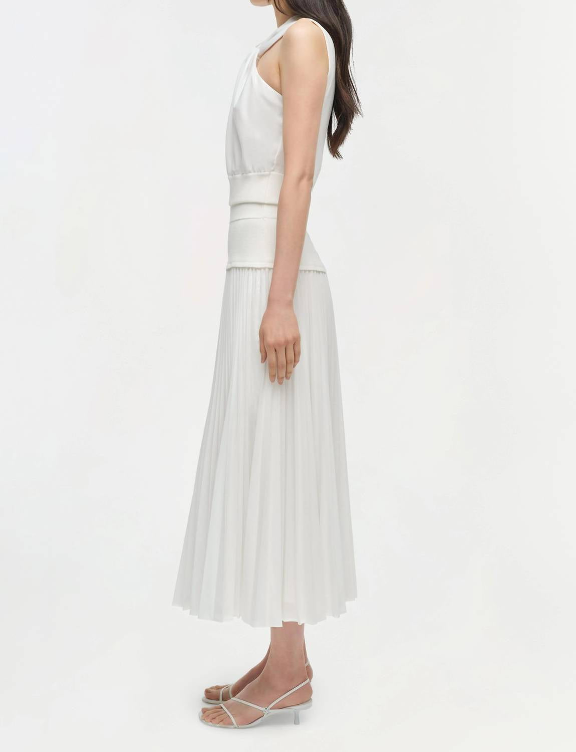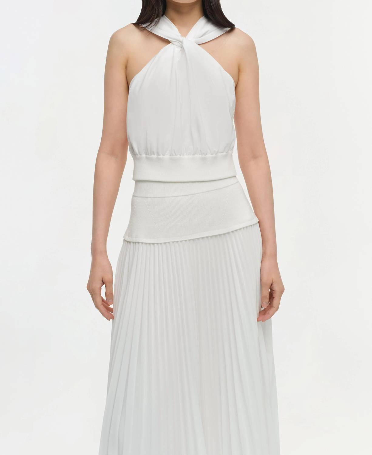 A timeless blouse that will never go out of style. Introducing the Wynonna Sleeveless Top by SIMKHAI, an elegant piece designed for a modern, sophisticated look. This halter-style top combines a knit-poplin aesthetic in a striking white, crafted from 100% Polyester. Originating from a minimalist trend, it features a convenient pull-on closure, with care instructions recommending hand wash and line dry. Perfect for a cocktail party or special occasion, this piece is an essential addition to your spring wardrobe.